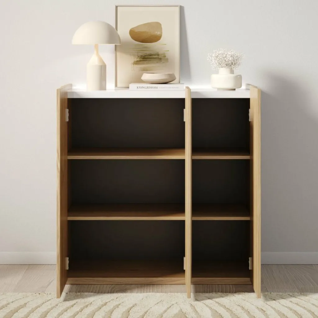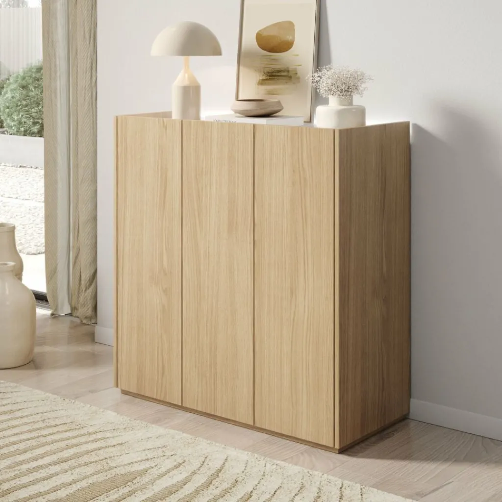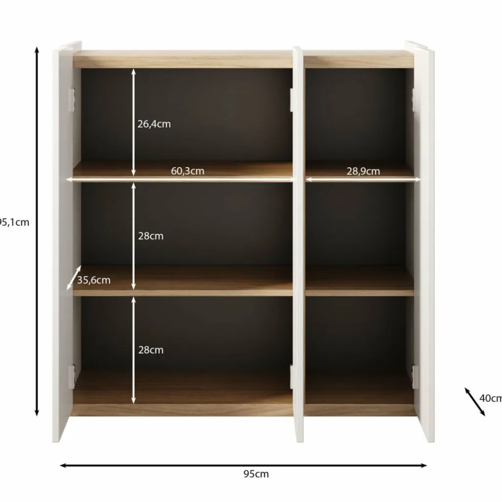 Schoenenkast Encore is een modern meubel die geschikt is voor het opbergen van je schoenen. De kast is voorzien van 3 greeploze deuren die te openen zijn via de bovenkant. Achter deze deuren zitten 6 opbergvakken. Aan de achterzijde aan de bovenkant kan je LED-verlichting plaatsen. Het meubel is uitgevoerd in de kleur eiken met een hoogglans wit bovenblad.