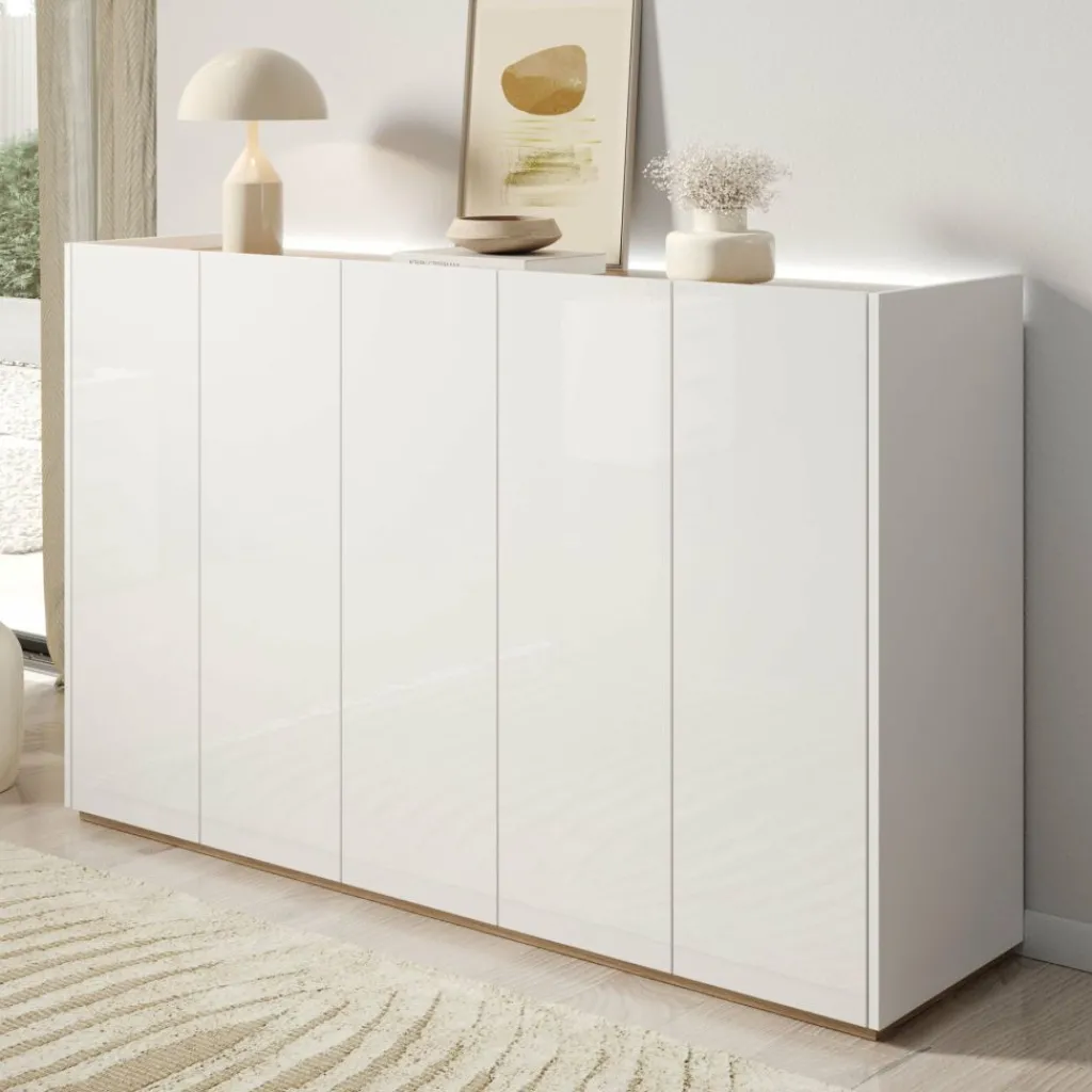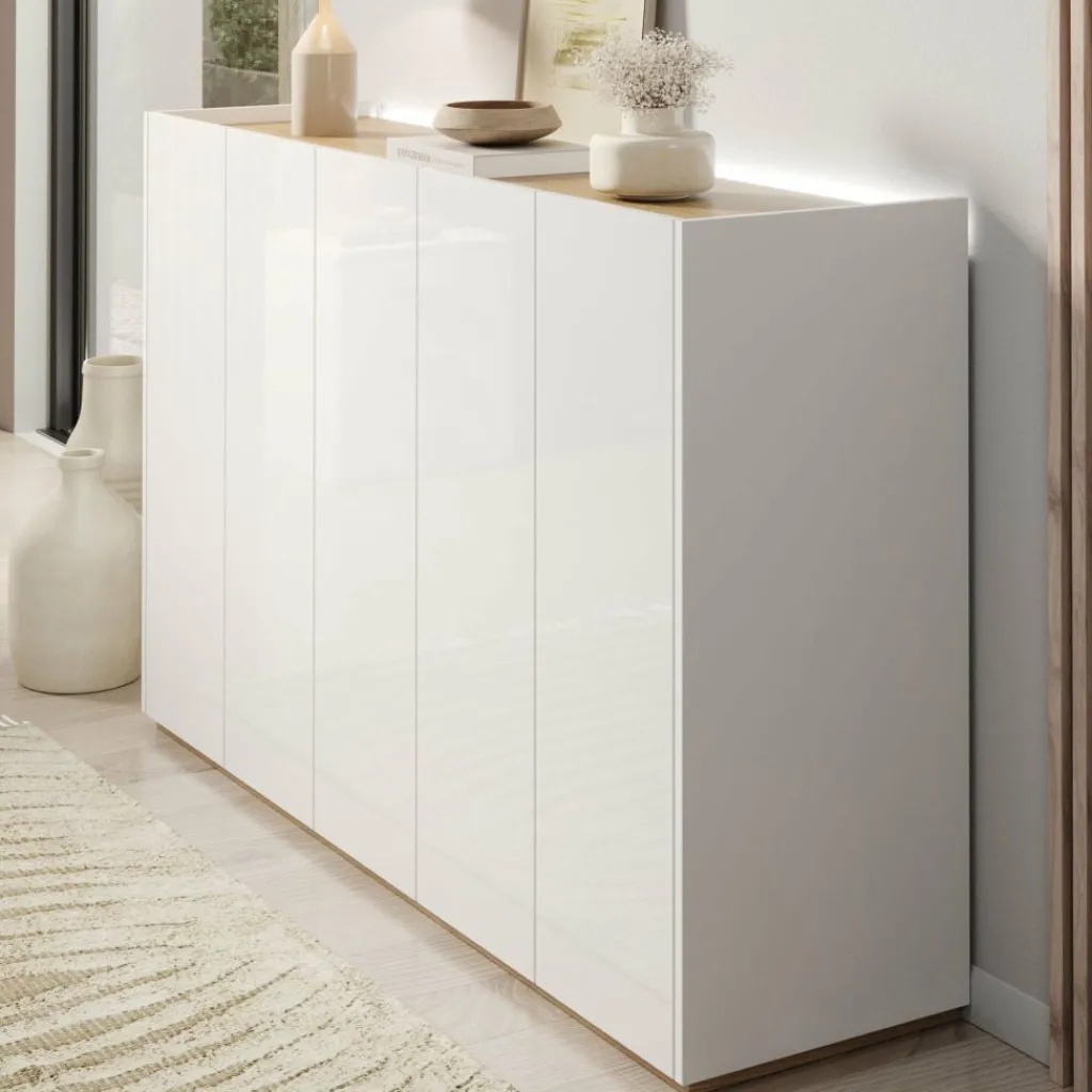 Schoenenkast Encore is een modern meubel die geschikt is voor het opbergen van je schoenen. De kast is voorzien van 5 greeploze deuren die te openen zijn via de bovenkant. Achter deze deuren zitten 9 opbergvakken. Aan de achterzijde aan de bovenkant kan je LED-verlichting plaatsen. Het meubel is uitgevoerd in wit met hoogglans witte voorkant. Het bovenblad is in een eiken kleur.