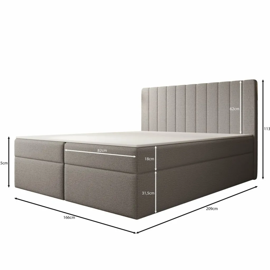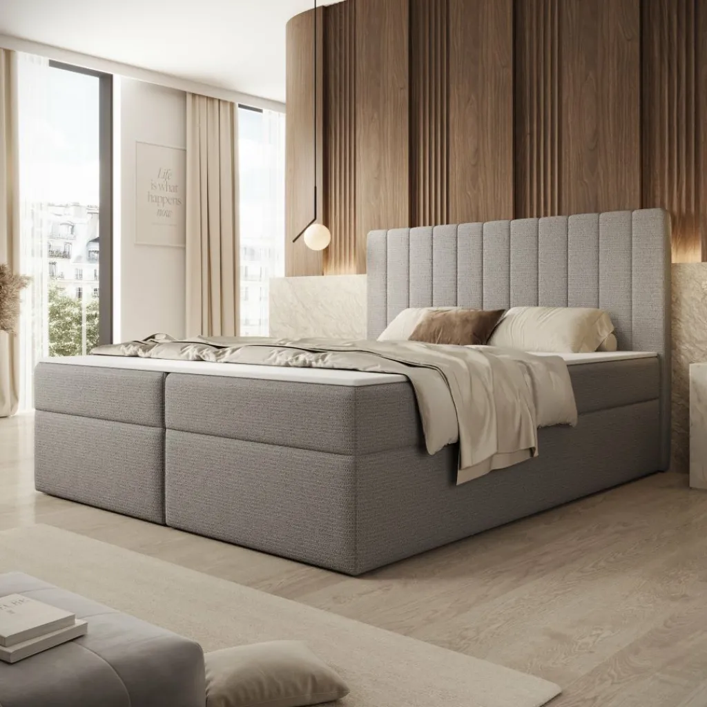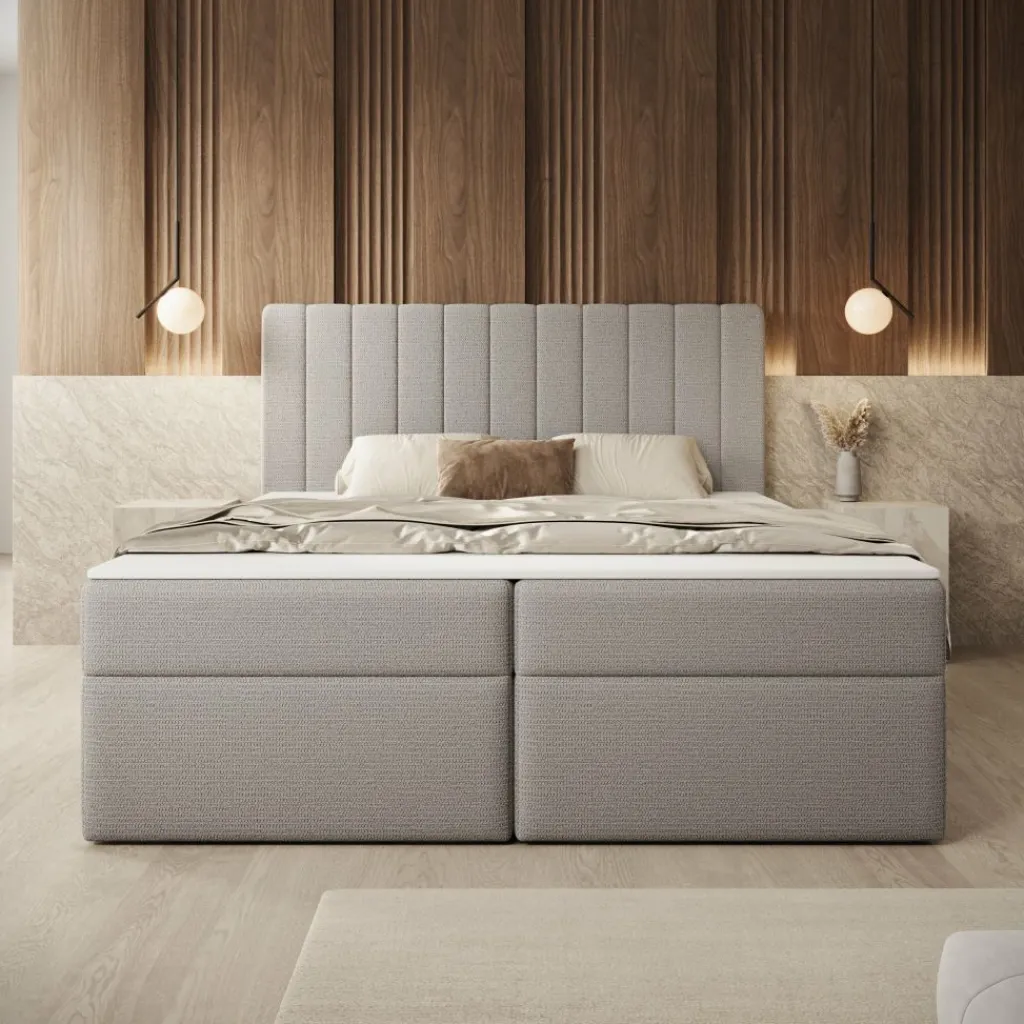 De Ensono boxspring is een praktische slaapoplossing met geïntegreerde opbergruimte en een stevige constructie. Het frame is opgebouwd uit 16 mm gelamineerde meubelplaat, 15 mm spaanplaat, 4 mm HDF en massief hout van 22–24 mm dik, afgewerkt met een laag fiberfill van 150 g/m². Het hoofdbord heeft dezelfde basisopbouw en bevat spaanplaat, HDF en massief hout, aangevuld met T21-schuim van 1 tot 2 cm voor extra comfort tijdens het zitten.