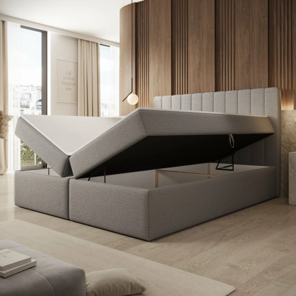 Onder beide matrassen bevindt zich een opbergvak dat ruimte biedt voor bijvoorbeeld beddengoed. De vakken openen eenvoudig via een lus, waarbij de matrassen soepel omhoogkomen door de veringen. Dit maakt het bed ideaal voor slaapkamers waar extra opbergruimte gewenst is.