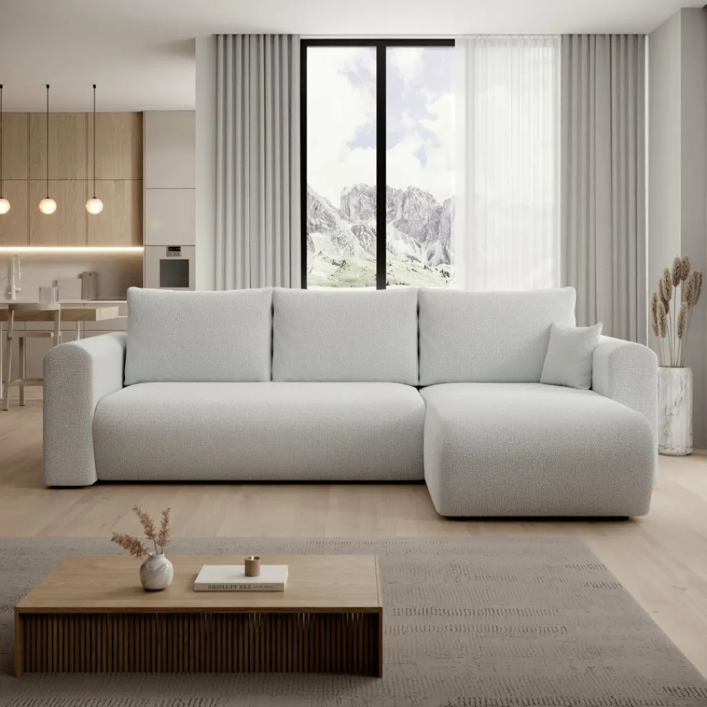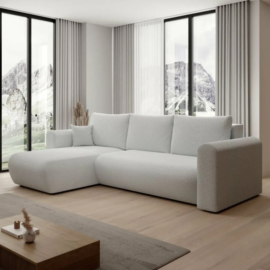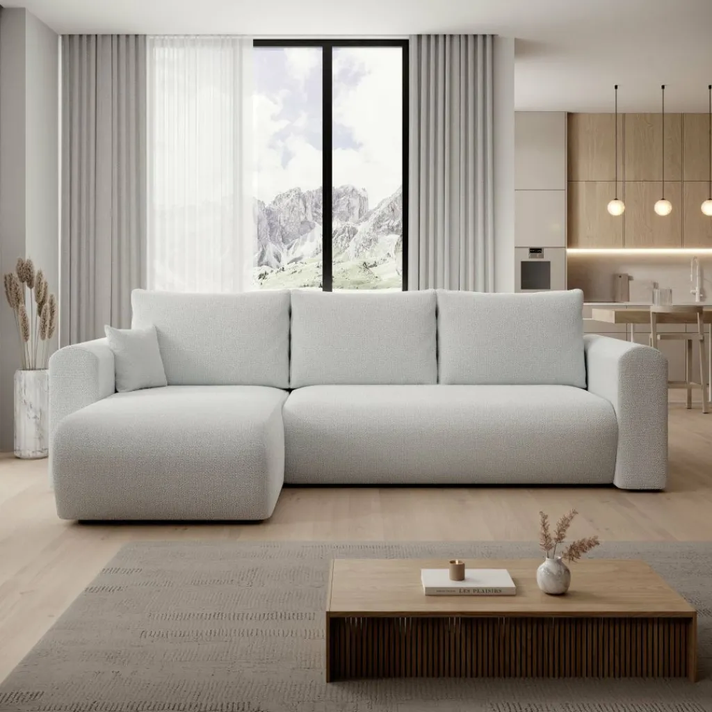 De Esencia hoekbank brengt een ruime en ontspannen zit naar de woonkamer. De bank heeft brede kussens, afgeronde armleuningen en een royale chaise longue waarop je gemakkelijk languit kunt liggen. De neutrale grijze stof zorgt voor een rustige uitstraling die goed past in moderne en minimalistische interieurs.