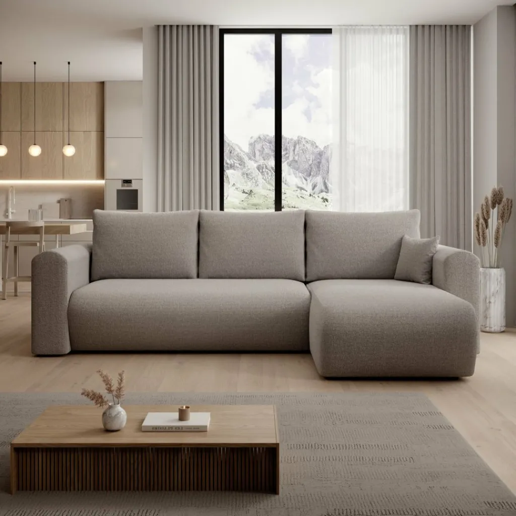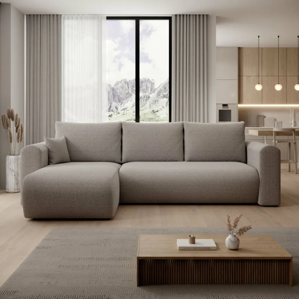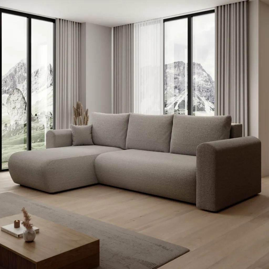 Esencia is een ruime hoekbank met een comfortabele zitdiepte en royale chaise longue. De bank biedt plaats aan drie personen en heeft een strak ontwerp dat goed aansluit bij moderne interieurs. De grijze stof is sterk en geschikt voor dagelijks gebruik.
