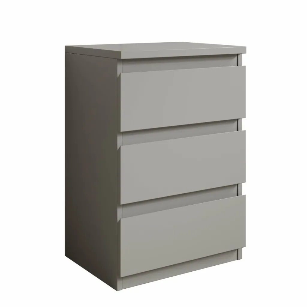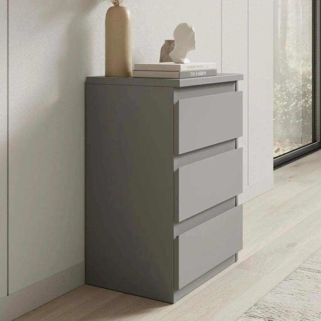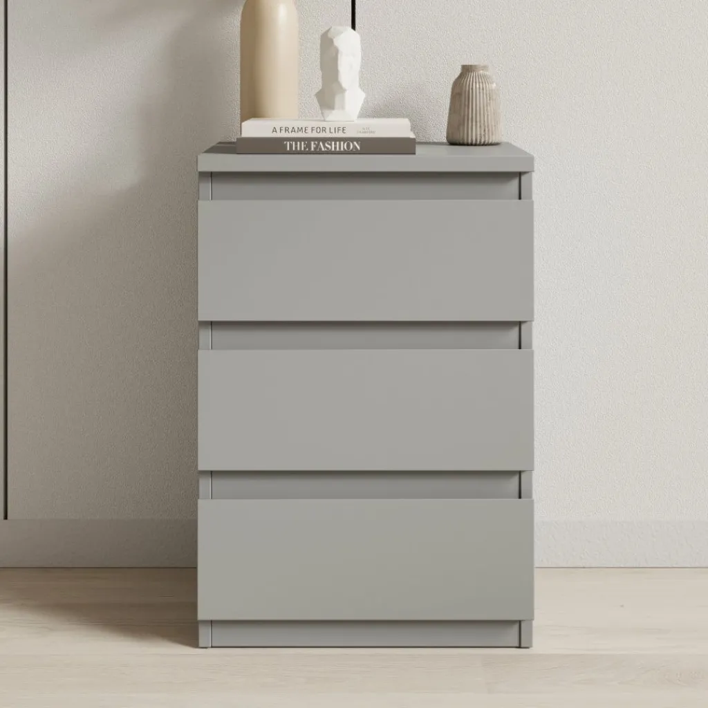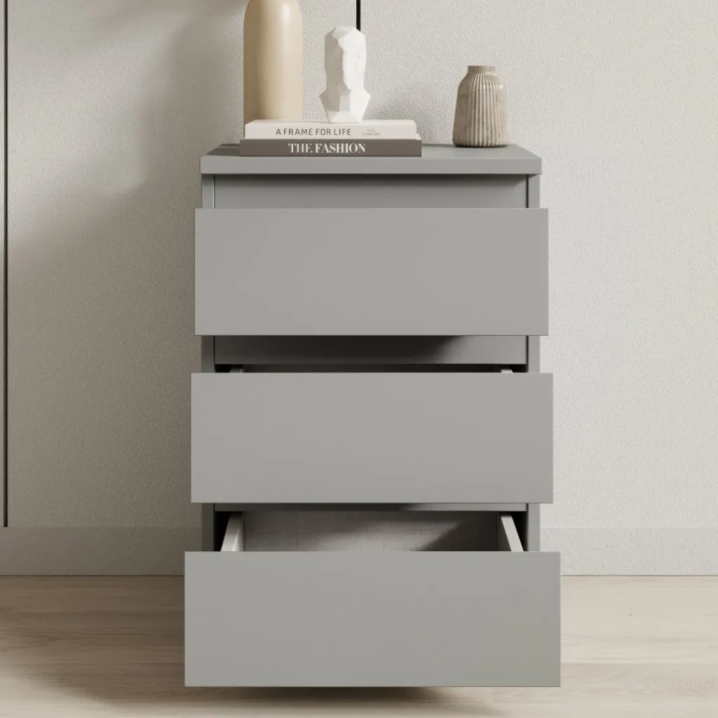 De ladekast is uitgevoerd in grijs en heeft een strak, gesloten front zonder zichtbare grepen. Aan de voorzijde bevinden zich drie lades, verticaal onder elkaar geplaatst. De open foto laat zien dat de lades ruim zijn uitgevoerd en geschikt zijn voor het opbergen van uiteenlopende spullen. Het bovenblad biedt ruimte voor decoratieve items of verlichting.