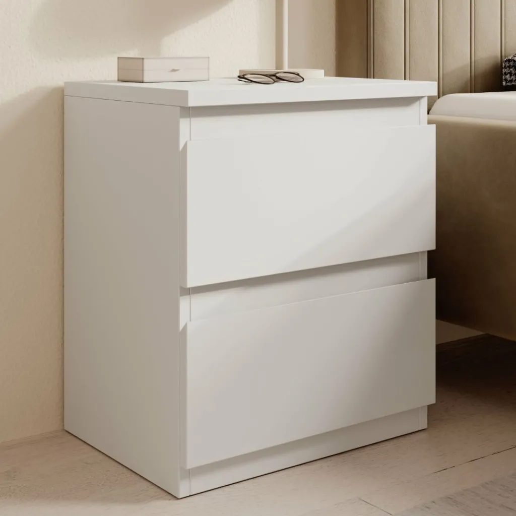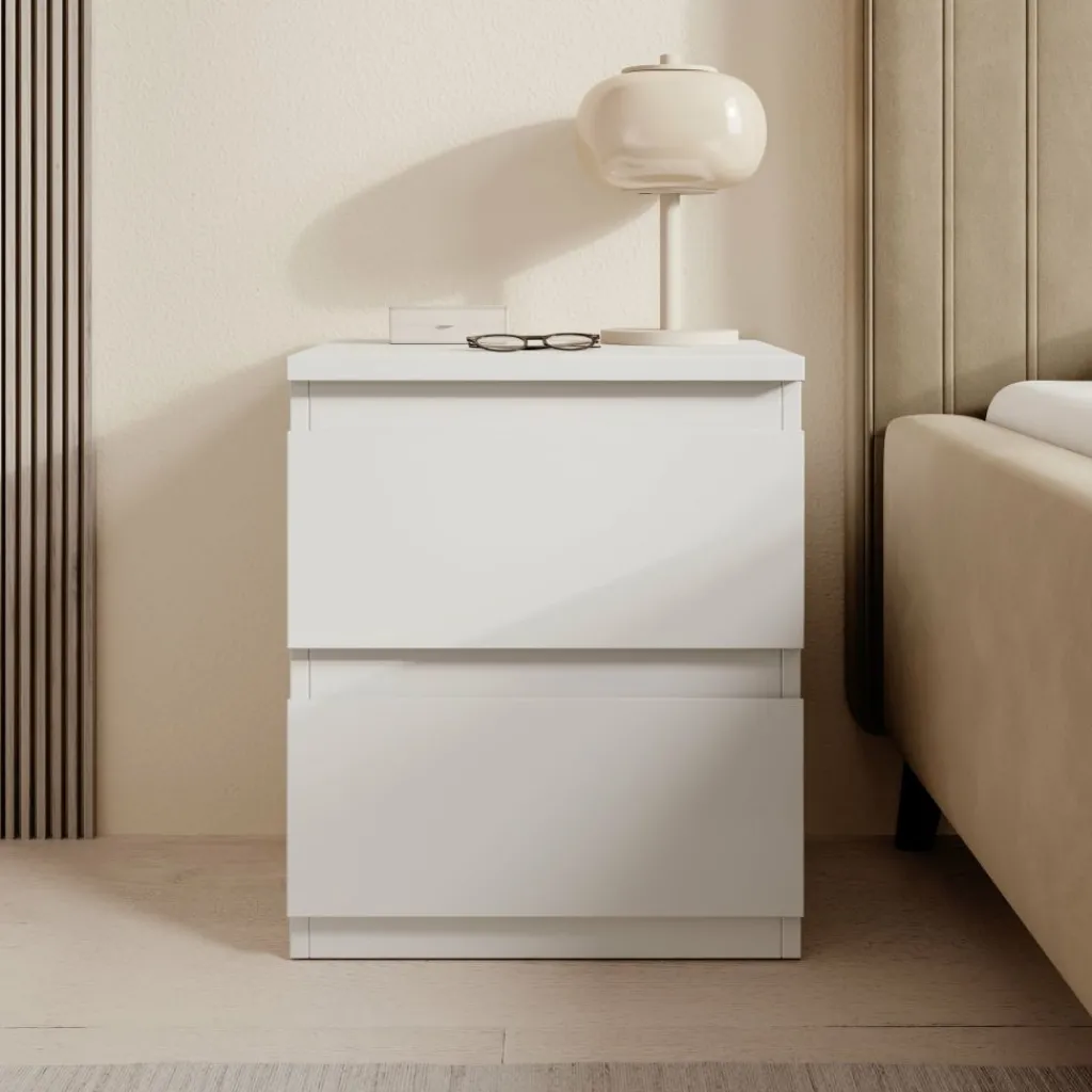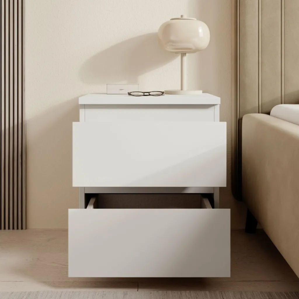 Het nachtkastje is uitgevoerd in wit en heeft een strak, gesloten ontwerp zonder zichtbare grepen. Aan de voorzijde zijn twee lades zichtbaar, boven elkaar geplaatst. Op de open foto is te zien dat de onderste lade diep is uitgevoerd en geschikt is voor het opbergen van grotere items zoals boeken of accessoires. De bovenste lade is bedoeld voor kleinere spullen die je binnen handbereik wilt houden. Het bovenblad biedt ruimte voor een lamp, bril of andere persoonlijke items.