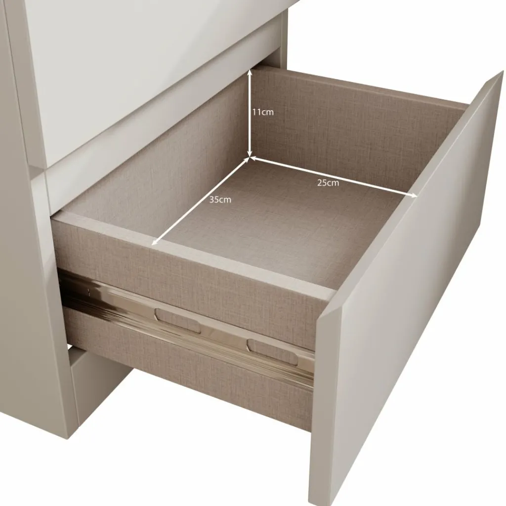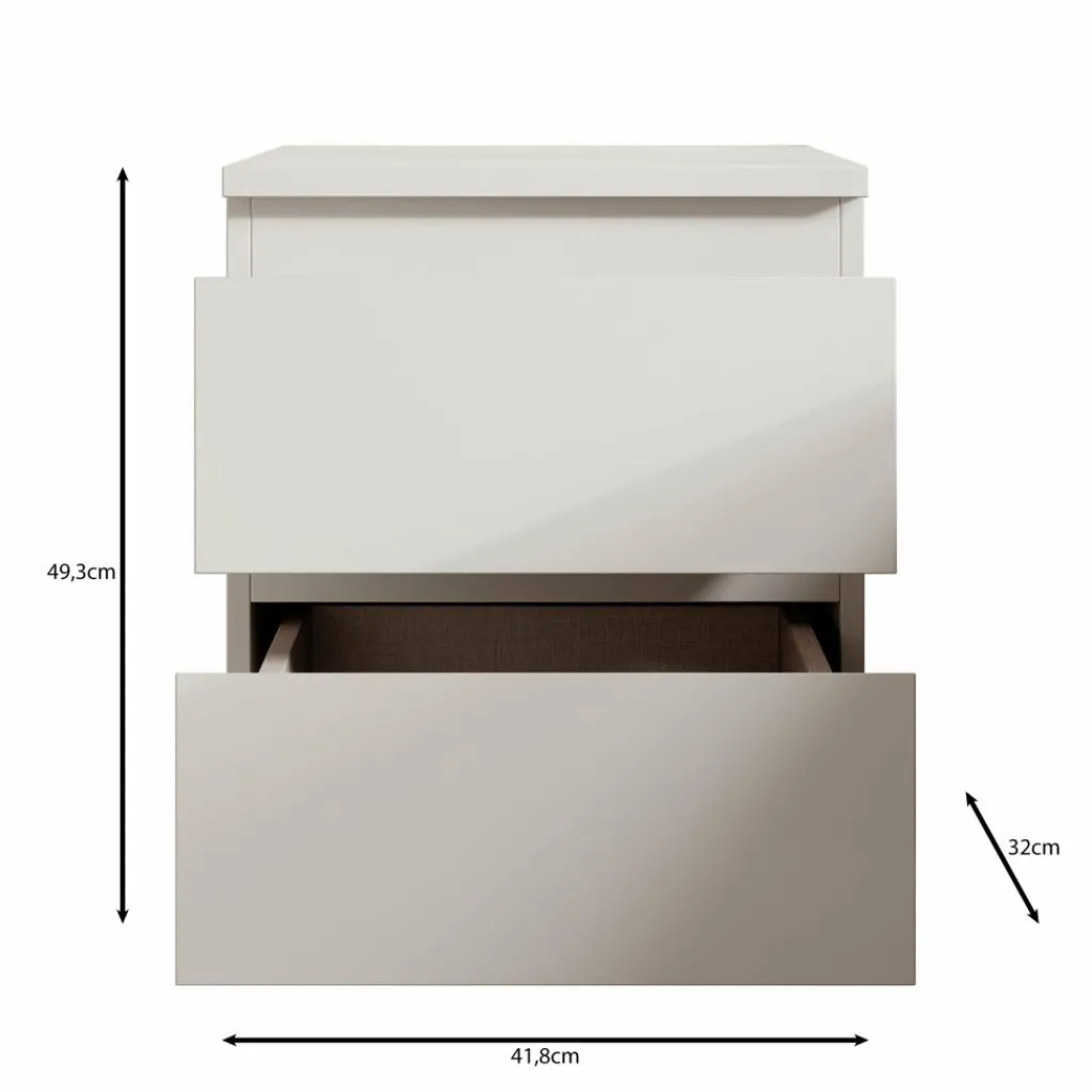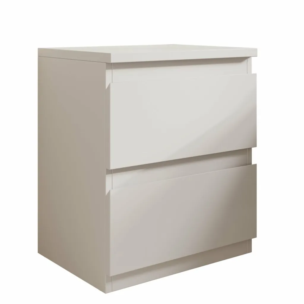 Het nachtkastje is uitgevoerd in wit en heeft een strak, gesloten ontwerp zonder zichtbare grepen. Aan de voorzijde zijn twee lades zichtbaar, boven elkaar geplaatst. Op de open foto is te zien dat de onderste lade diep is uitgevoerd en geschikt is voor het opbergen van grotere items zoals boeken of accessoires. De bovenste lade is bedoeld voor kleinere spullen die je binnen handbereik wilt houden. Het bovenblad biedt ruimte voor een lamp, bril of andere persoonlijke items.