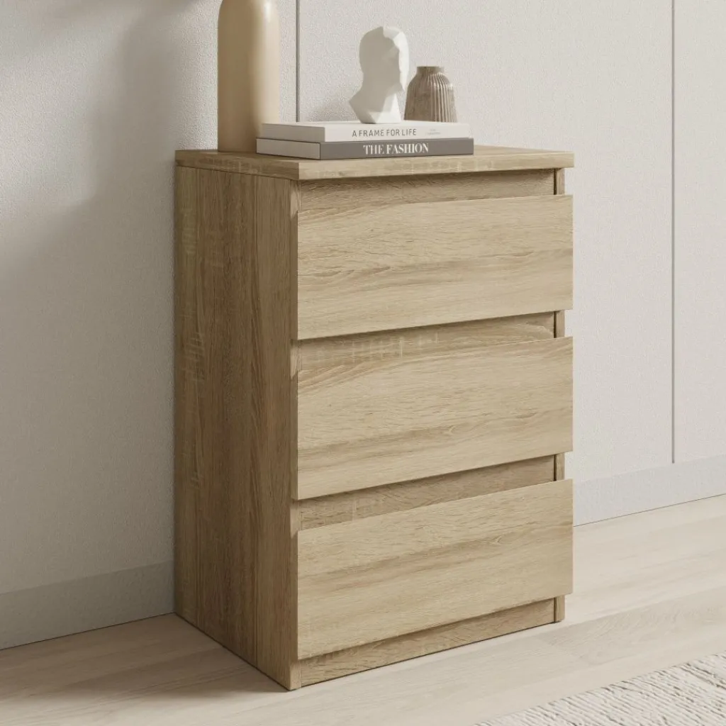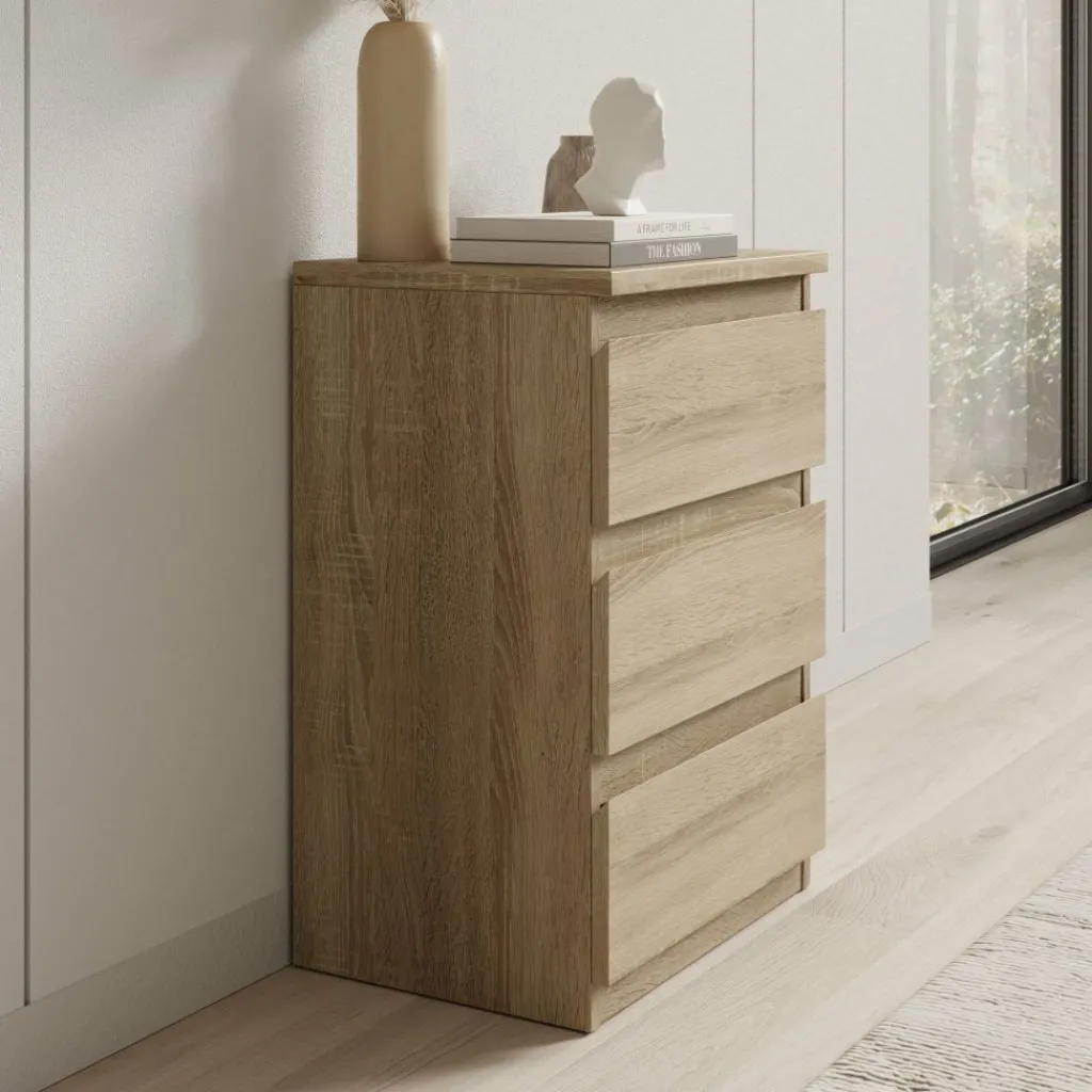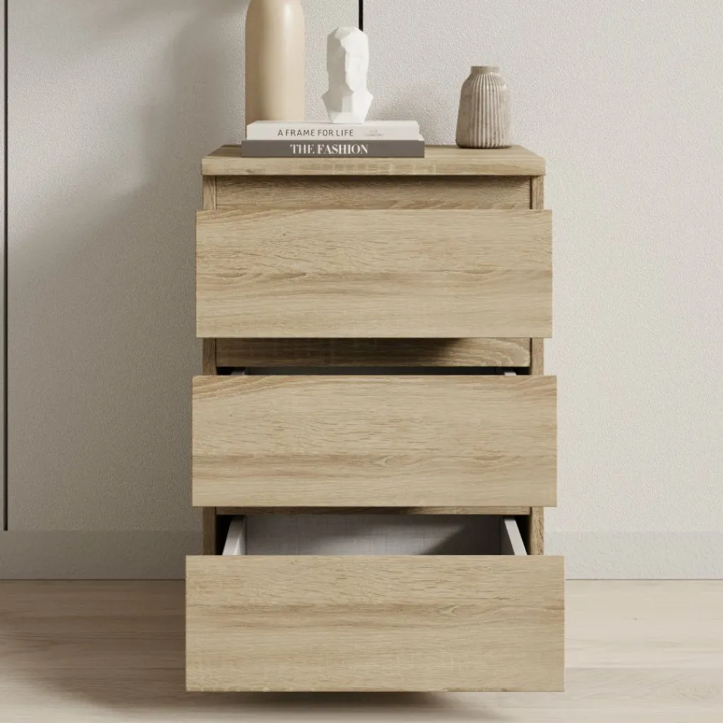 Deze variant is uitgevoerd in een eikenpatroon en heeft een strak, gesloten ontwerp zonder zichtbare grepen. Aan de voorzijde zijn drie lades boven elkaar geplaatst. Op de open foto is te zien dat de lades diep zijn uitgevoerd, wat zorgt voor praktische opbergruimte voor kleding, accessoires of andere spullen. Het bovenblad is geschikt voor decoratie of dagelijkse items.