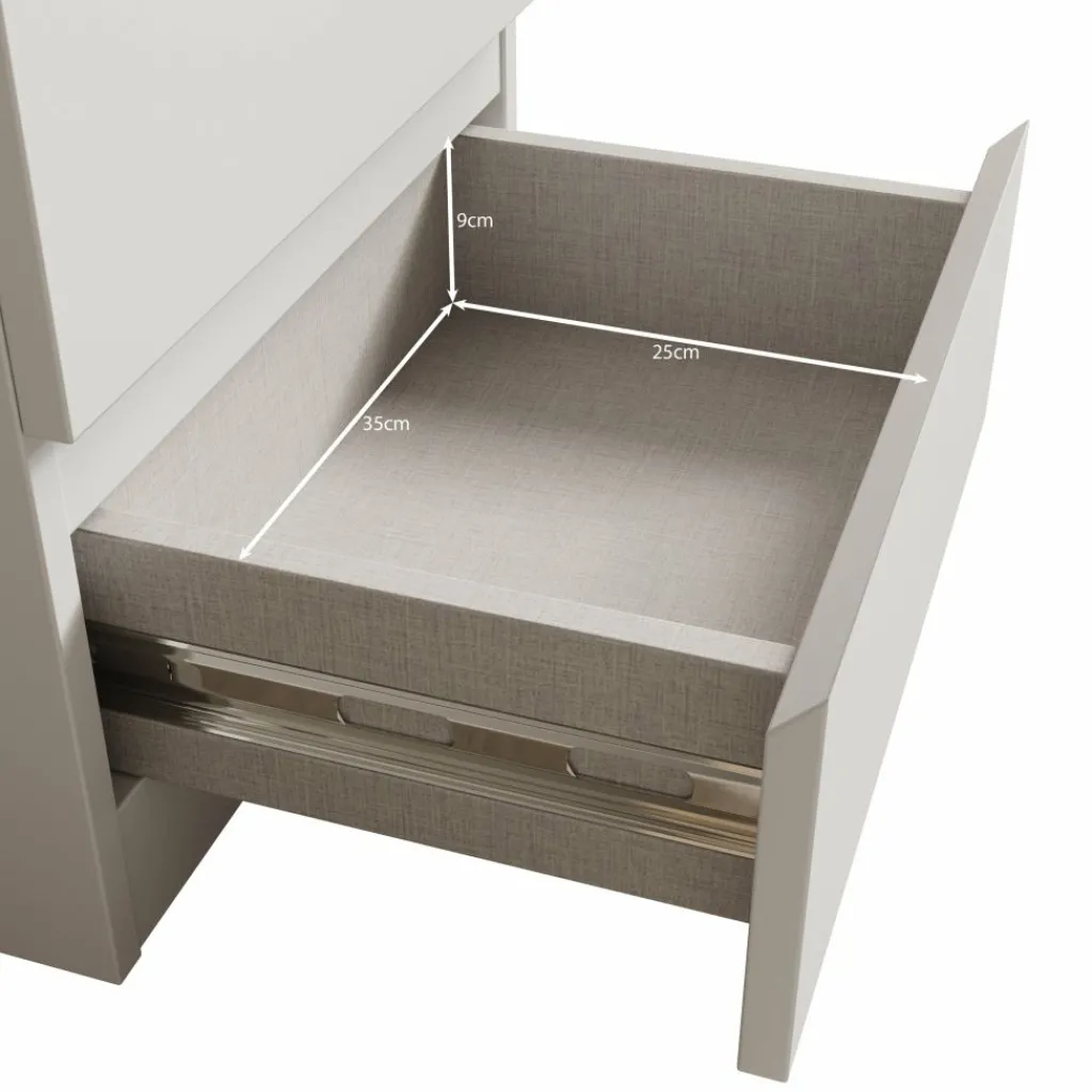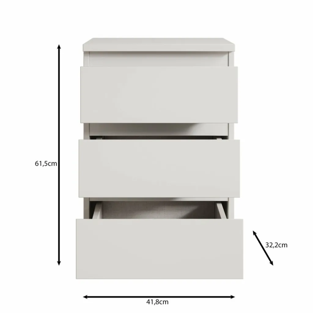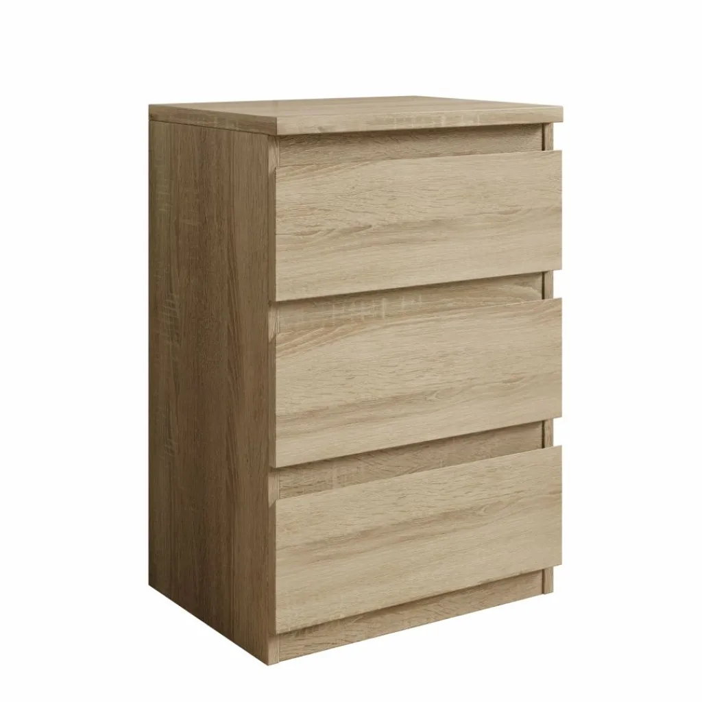 Deze variant is uitgevoerd in een eikenpatroon en heeft een strak, gesloten ontwerp zonder zichtbare grepen. Aan de voorzijde zijn drie lades boven elkaar geplaatst. Op de open foto is te zien dat de lades diep zijn uitgevoerd, wat zorgt voor praktische opbergruimte voor kleding, accessoires of andere spullen. Het bovenblad is geschikt voor decoratie of dagelijkse items.