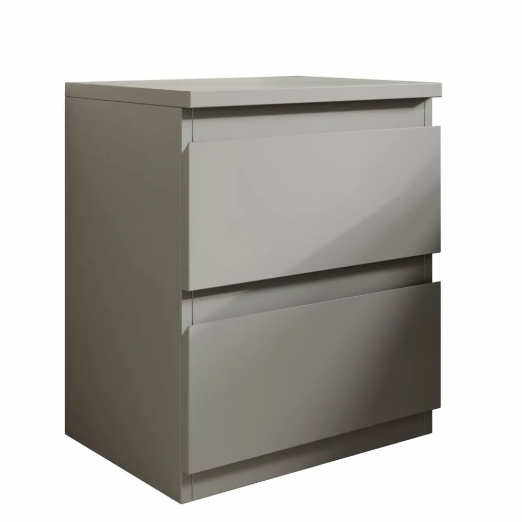 Het nachtkastje is uitgevoerd in grijs en heeft een strak, gesloten ontwerp zonder zichtbare grepen. Aan de voorzijde zijn twee lades geplaatst, boven elkaar. Op de open foto is te zien dat de onderste lade dieper is uitgevoerd en geschikt is voor het opbergen van grotere items zoals boeken of accessoires. De bovenste lade is bedoeld voor kleinere spullen die je graag binnen handbereik houdt. Het bovenblad biedt ruimte voor een lamp, telefoon of andere dagelijkse items.
