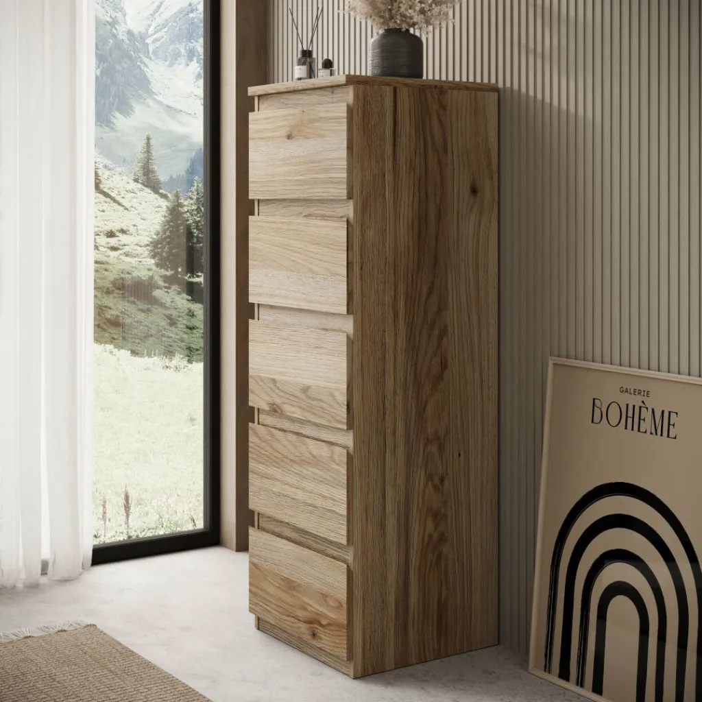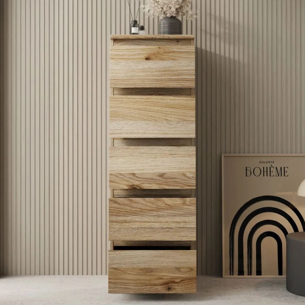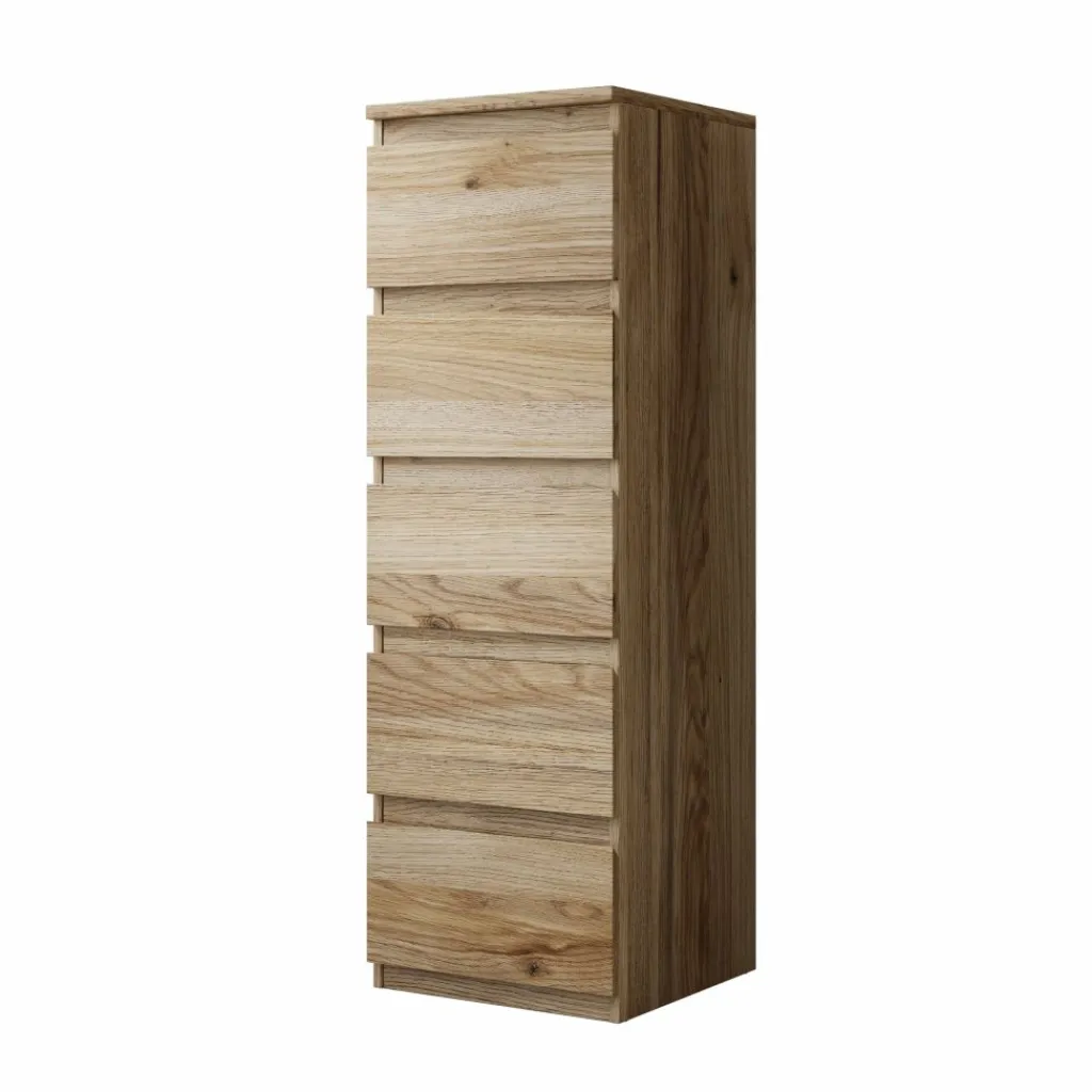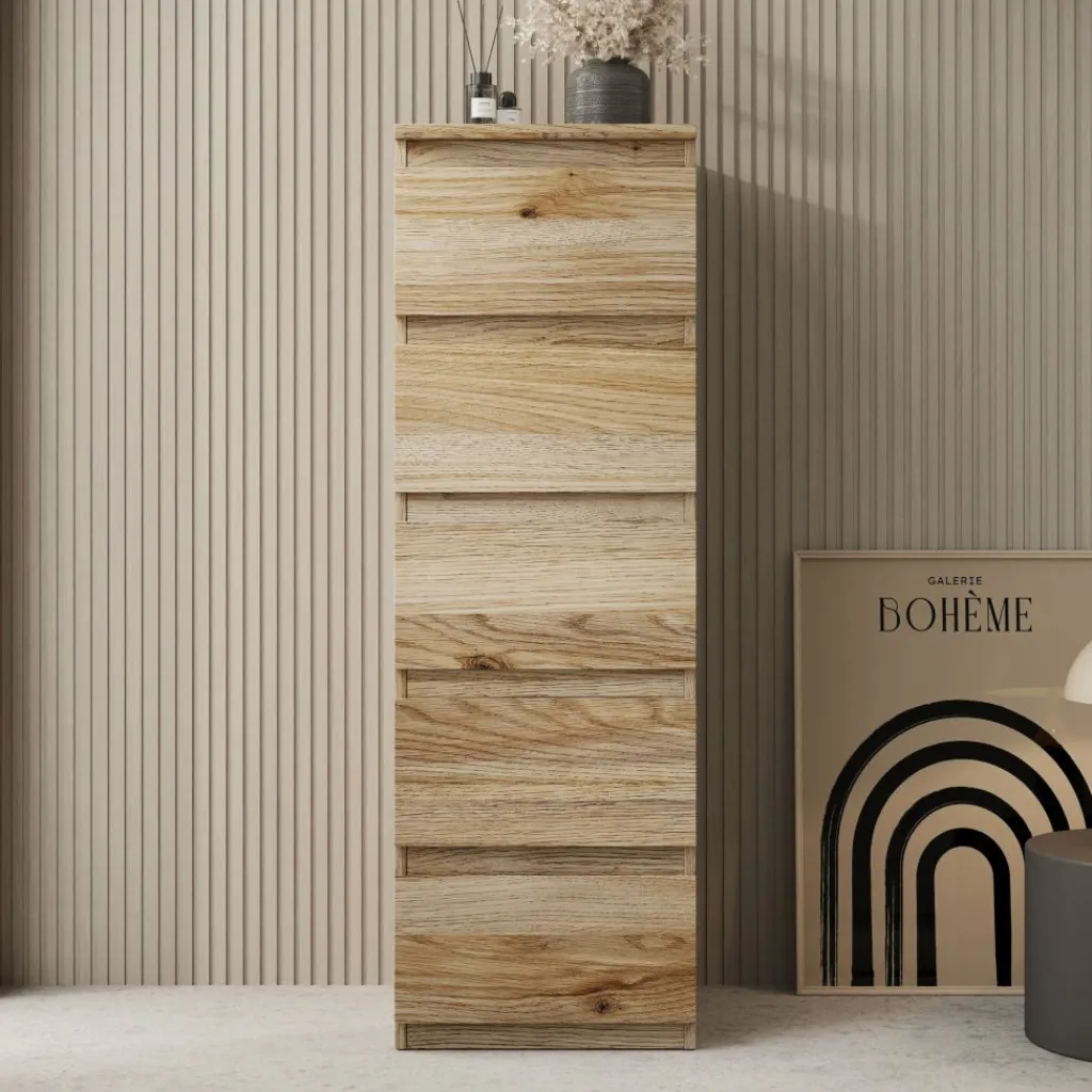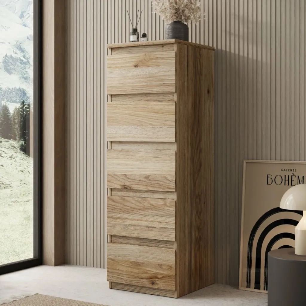 De Eskar schoenenkast biedt een praktische oplossing voor het netjes opbergen van schoenen in huis. Met een formaat van 42x42x128 cm neemt de kast weinig vloeroppervlak in, terwijl de hoogte zorgt voor voldoende opbergruimte. Het eikenpatroon geeft de kast een neutrale en tijdloze uitstraling die goed past in verschillende interieurs, zoals de hal, overloop of slaapkamer.