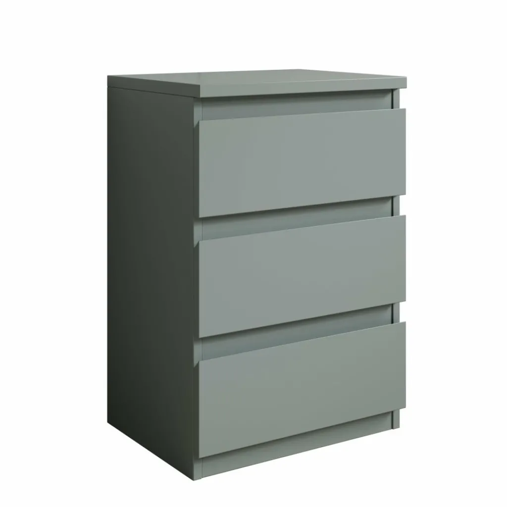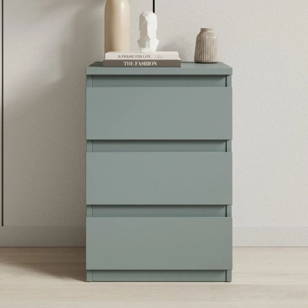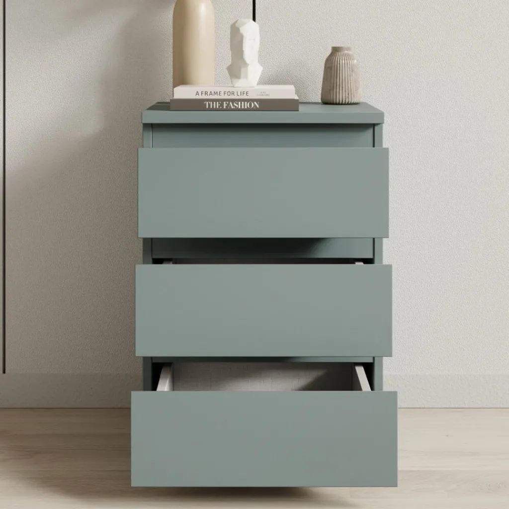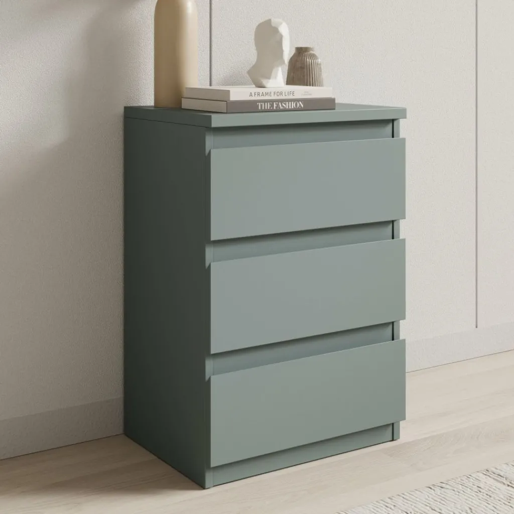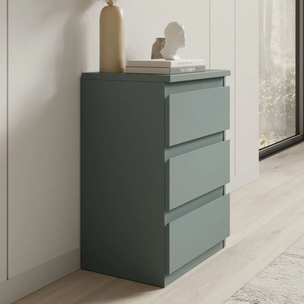 Deze uitvoering is uitgevoerd in groen en heeft een strak, gesloten ontwerp zonder zichtbare grepen. Aan de voorzijde zijn drie lades boven elkaar geplaatst. Op de open foto is te zien dat de lades diep zijn uitgevoerd, waardoor er voldoende ruimte is voor kleding, accessoires of andere dagelijkse items. Het bovenblad is geschikt voor decoratie, een lamp of persoonlijke spullen.