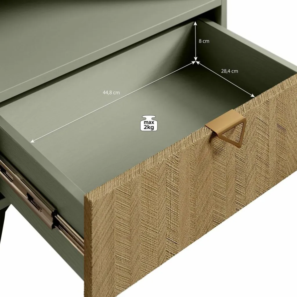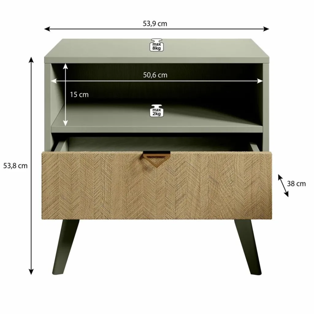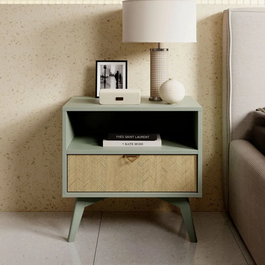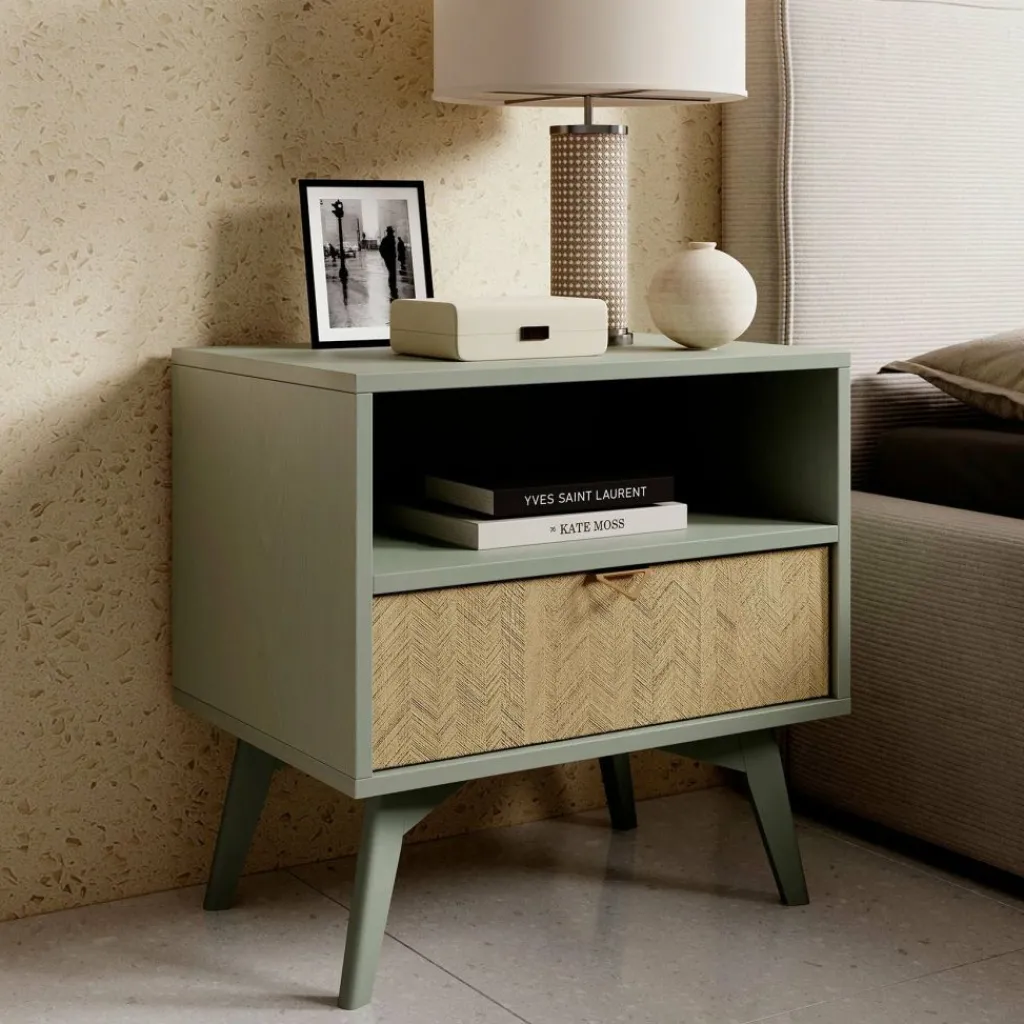 Het nachtkastje staat op hoge, groen gekleurde pootjes, waardoor het geheel een luchtige uitstraling krijgt en eenvoudig te combineren is binnen verschillende interieurstijlen.
