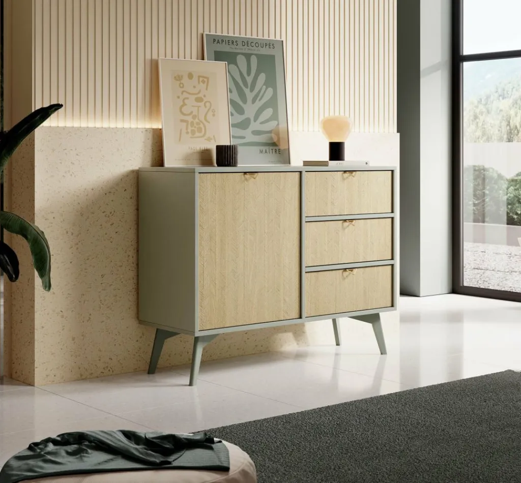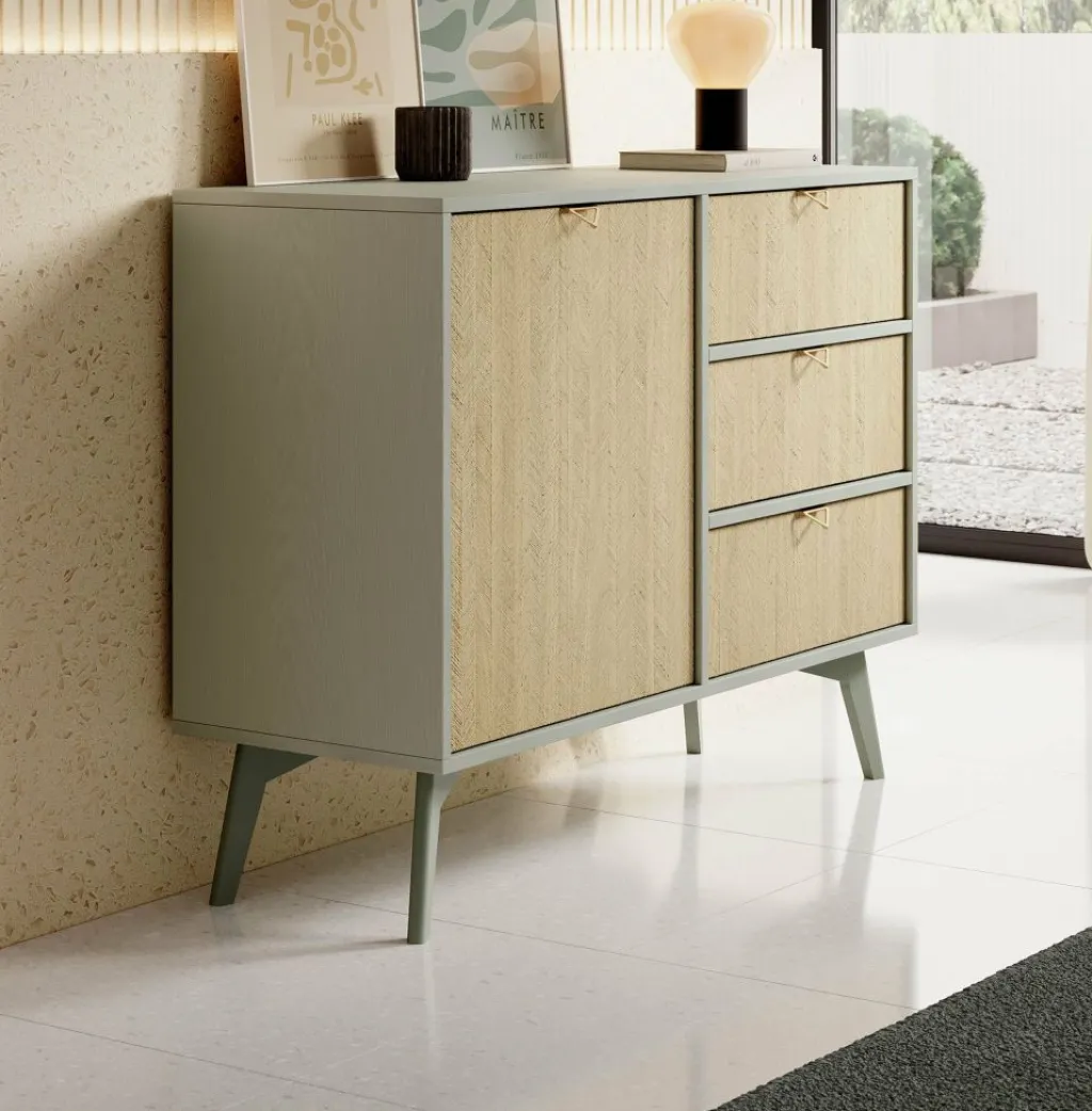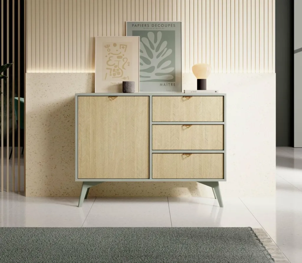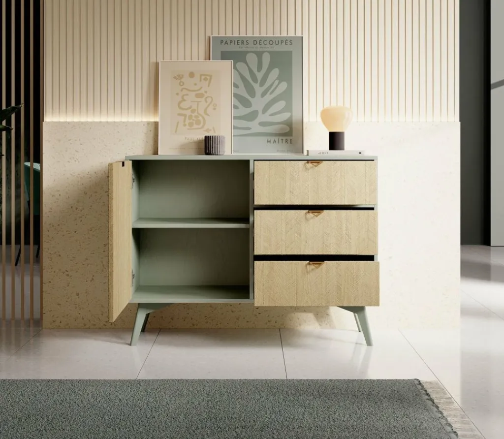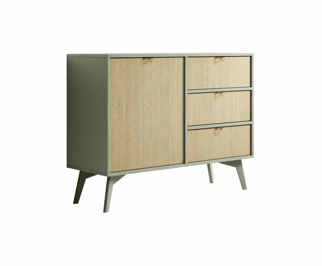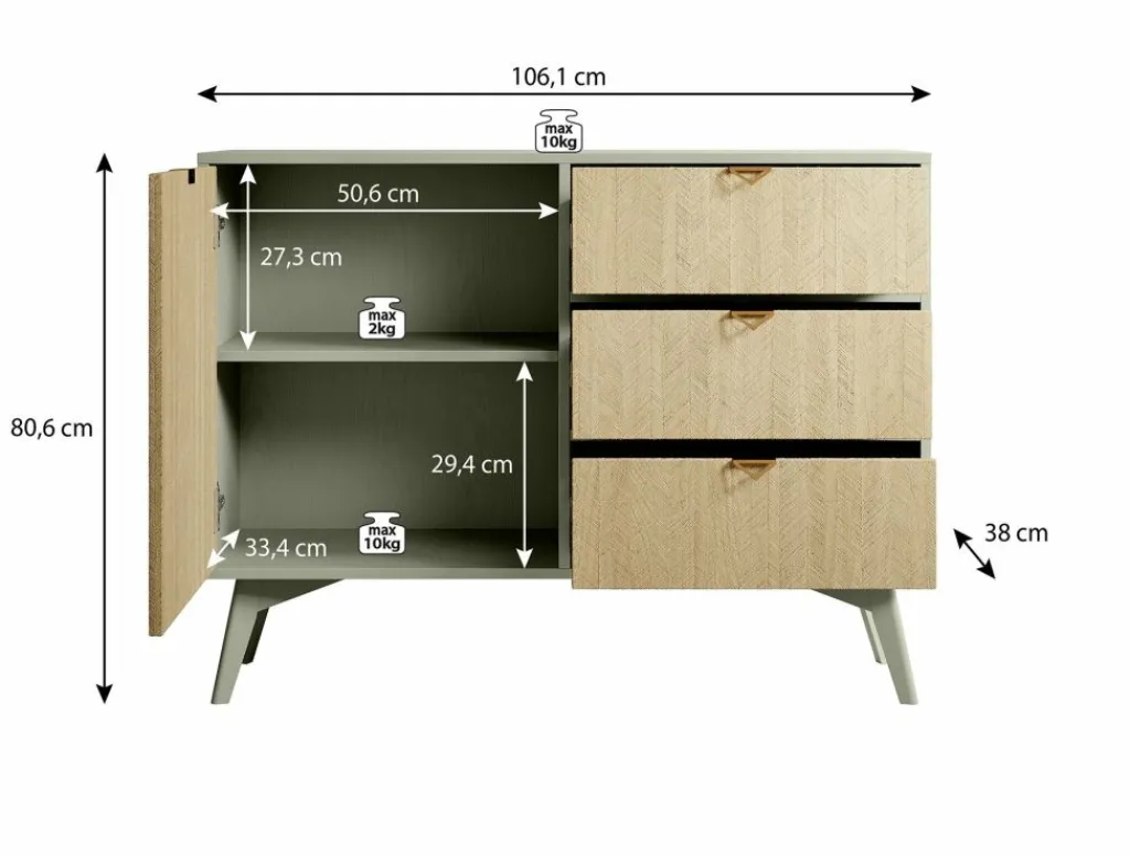 De kast heeft een deur met daarachter twee opbergvakken. Daarnaast bevinden zich 3 opberglades. De deuren en lades zijn te openen met diamantvormige handgrepen. De voorkant van het dressoir heeft een visgraat patroon.