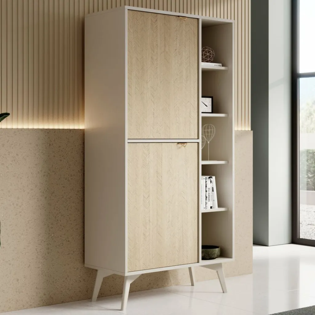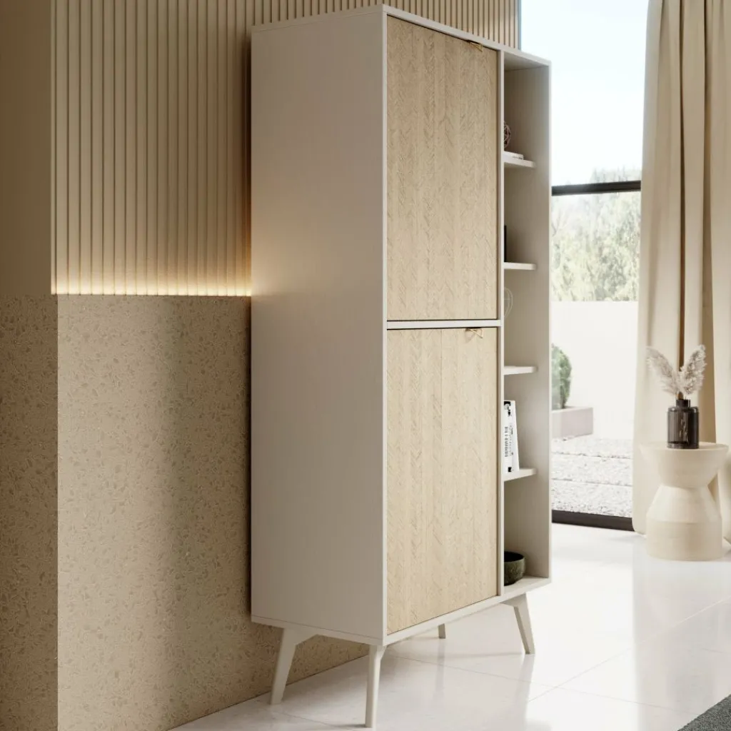 De Essence staat op hoge, beige pootjes. De voorkant van de deurtjes hebben een visgraat patroon in subtiele, licht eiken kleur.