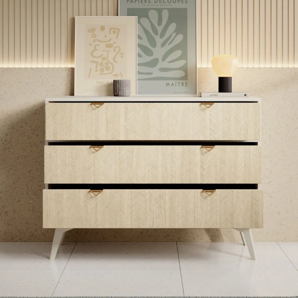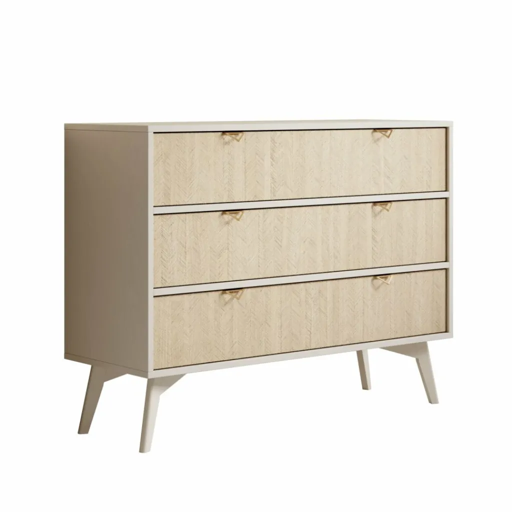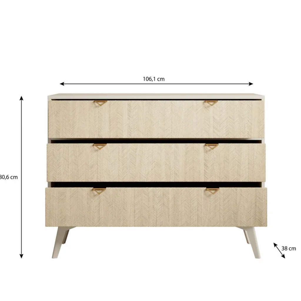 De kast heeft 3 opberglades. Deze openen met goudkleurige handgrepen. De voorkant van het dressoir heeft een visgraat patroon.