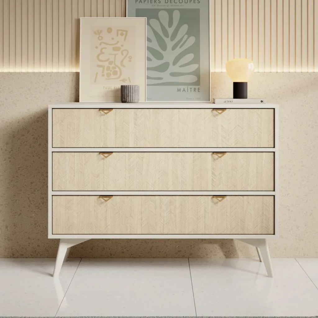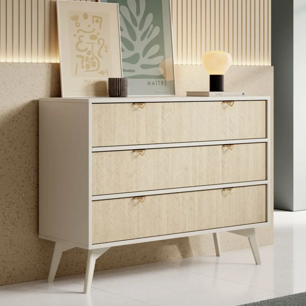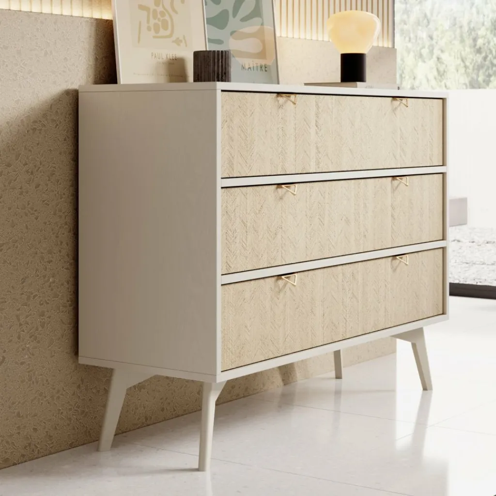 De kast heeft 3 opberglades. Deze openen met goudkleurige handgrepen. De voorkant van het dressoir heeft een visgraat patroon.