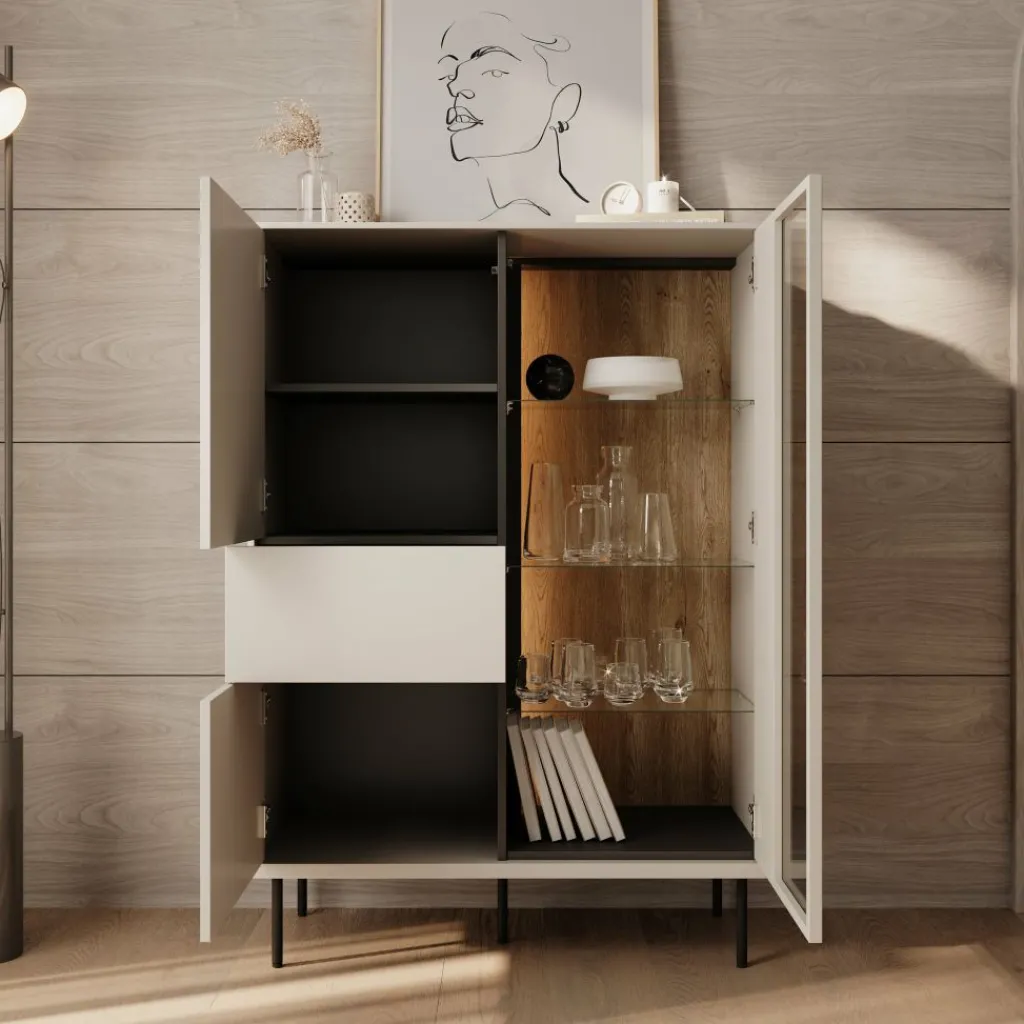 De kast bestaat uit twee deuren, twee lades en een glazen vak in het midden. Achter de deuren bevinden zich ruime opbergvakken voor servies, glaswerk of andere items die je netjes wilt opbergen. Het centrale glazen gedeelte is voorzien van glazen legplanken, een houten achterwand en geïntegreerde ledverlichting, waardoor decoratie en accessoires duidelijk zichtbaar worden en extra worden benadrukt.