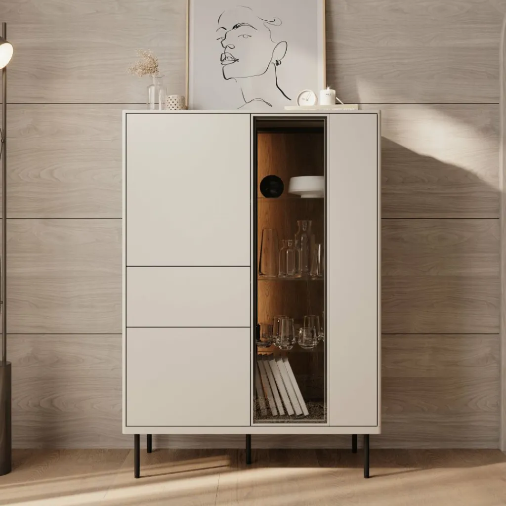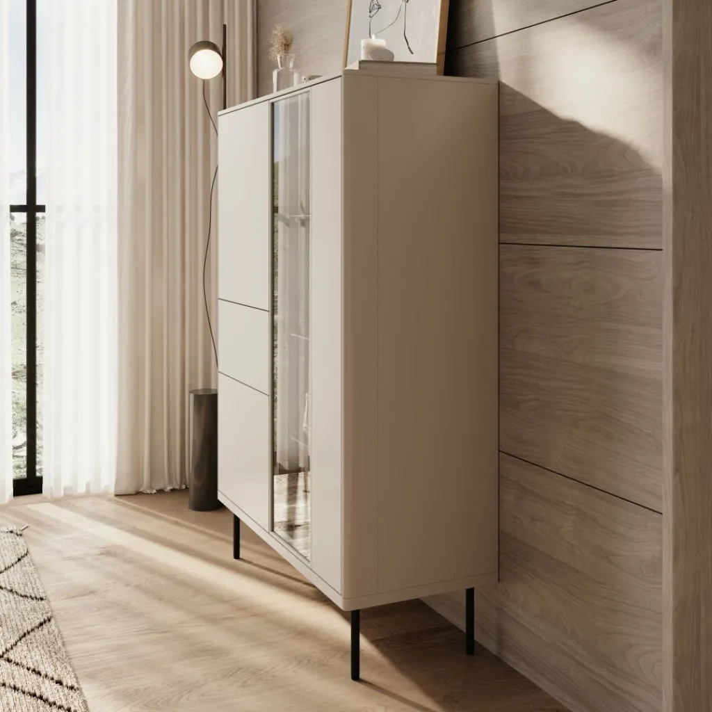 De vitrinekast Estrella heeft een strak en eigentijds ontwerp dat goed aansluit bij moderne interieurs. De beige kleur in combinatie met zwarte accenten geeft het meubel een verzorgde en evenwichtige uitstraling.