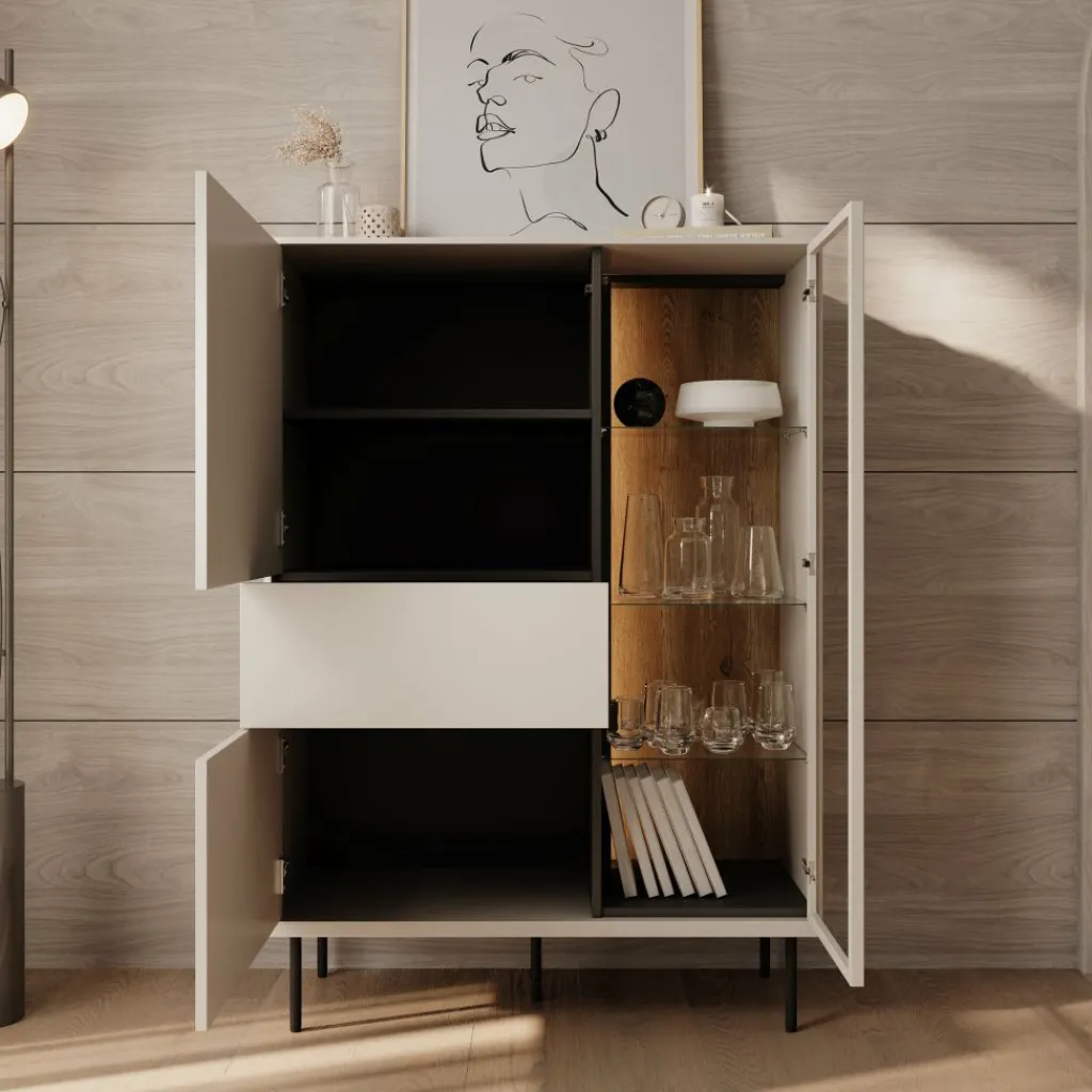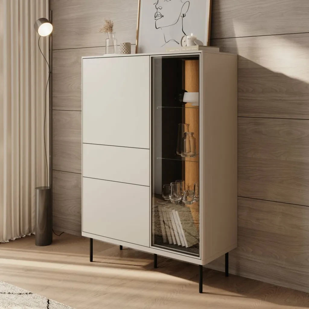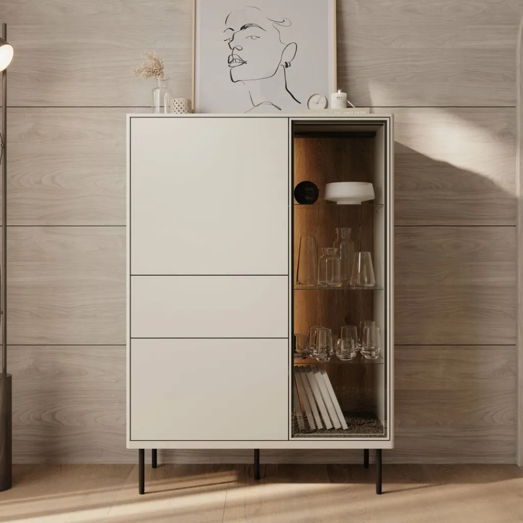 De kast is ingedeeld met drie dichte fronten aan de linkerzijde en een glazen deur aan de rechterzijde. Achter de gesloten delen is praktische opbergruimte voor spullen die je uit het zicht wilt houden. Het glazen gedeelte is voorzien van glazen legplanken en geïntegreerde ledverlichting, waardoor servies, glaswerk of accessoires duidelijk zichtbaar worden.