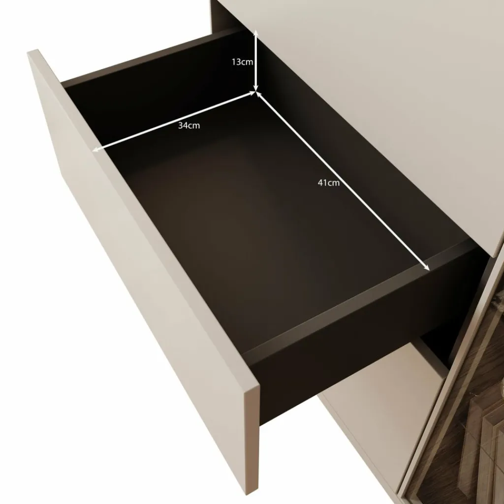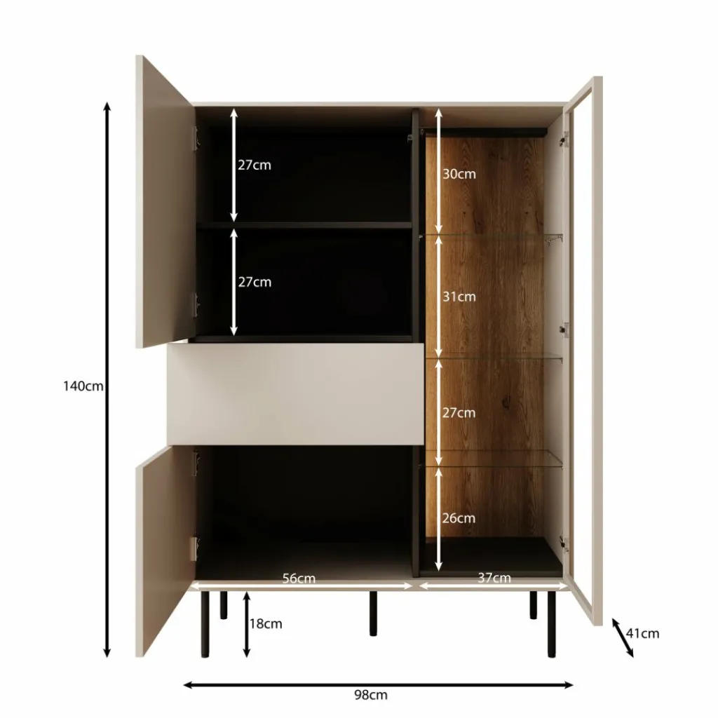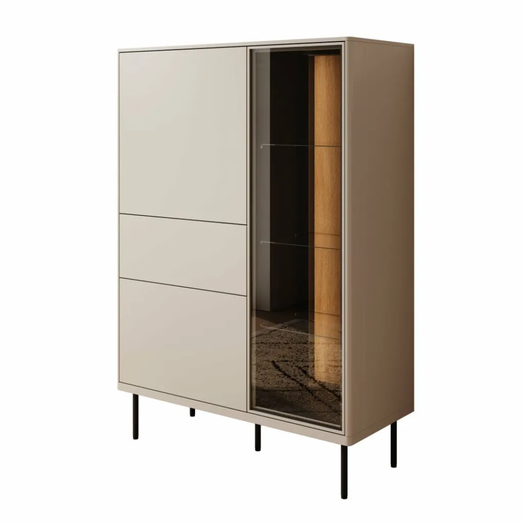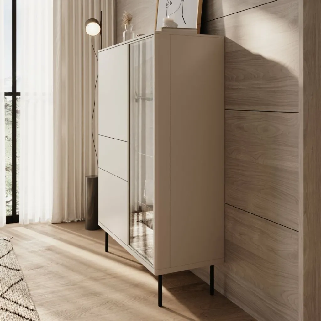 De combinatie van het beige front en het open vitrinedeel zorgt voor een heldere indeling met zowel gesloten als zichtbare opbergruimte. Estrella is geschikt voor dagelijks gebruik en sluit goed aan bij moderne interieurs.