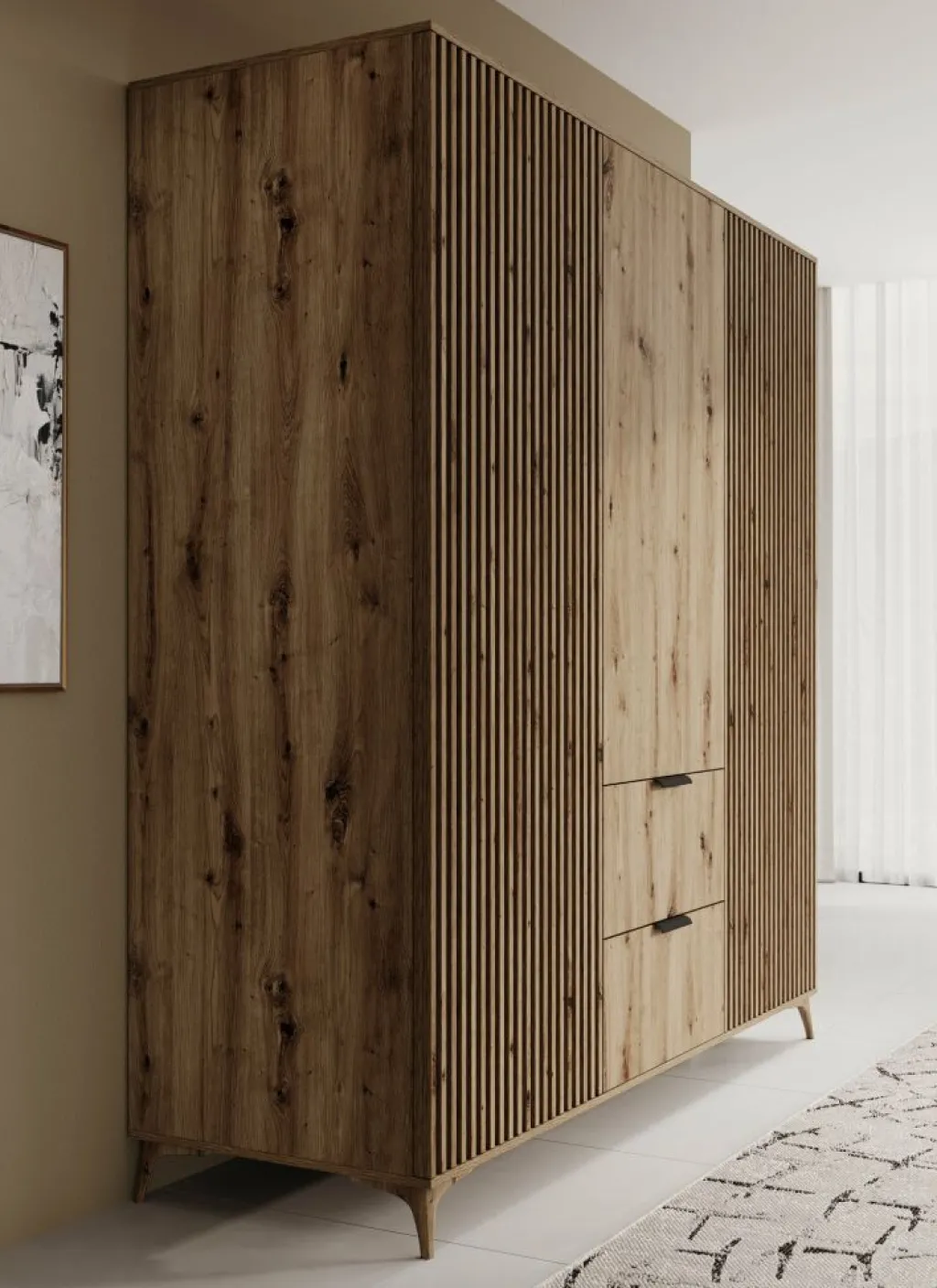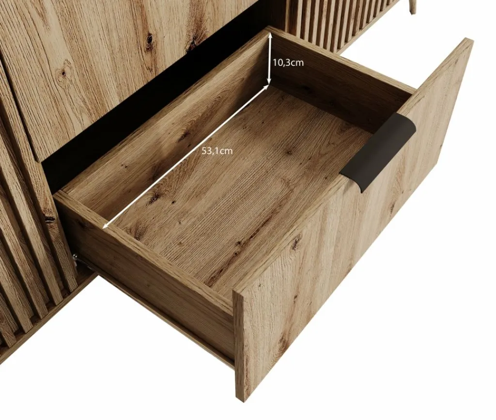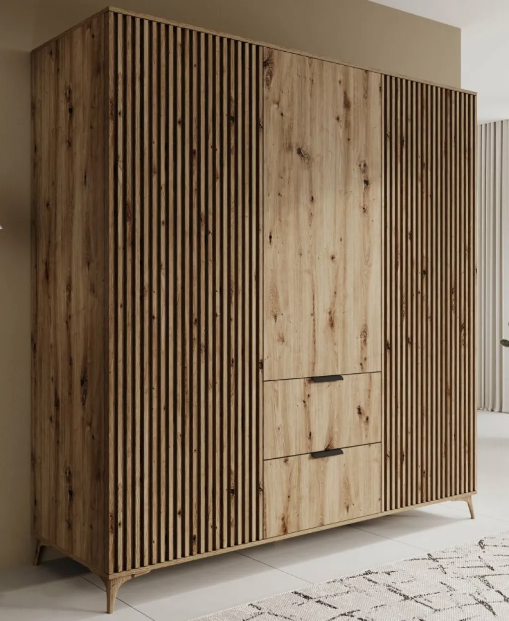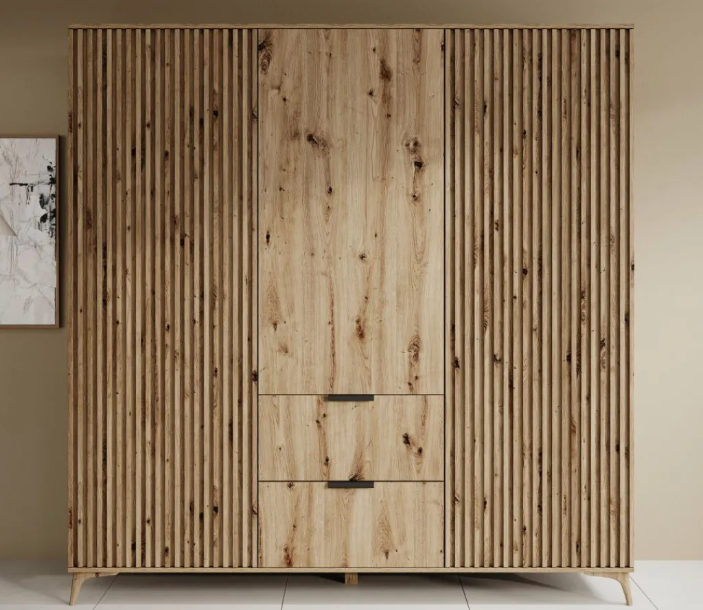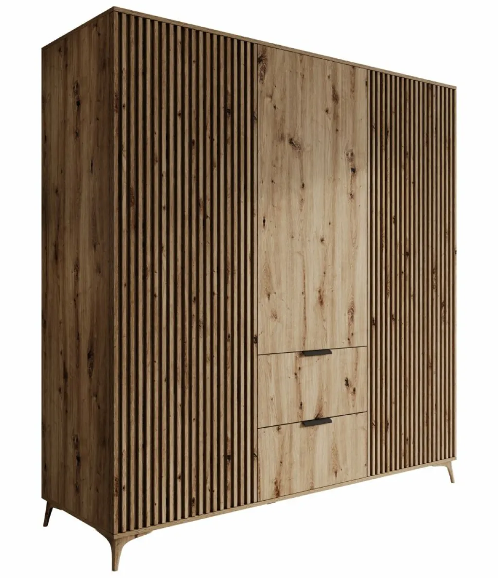 Kledingkast Evy is een garderobekast met ruime opbergmogelijkheden en een Scandinavische uitstraling. De kast is volledig uitgevoerd in eiken kleur en is gemaakt van gelamineerd spaanplaat. De poten zijn vervaardigd uit kunststof. Dit model is voorzien van 3 scharnierdeuren. De linker- en rechterdeur hebben latjes op de voorkant. Onder de middelste deur bevinden zich 2 handige opberglades die openen met zwarte handgrepen.