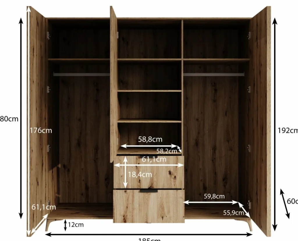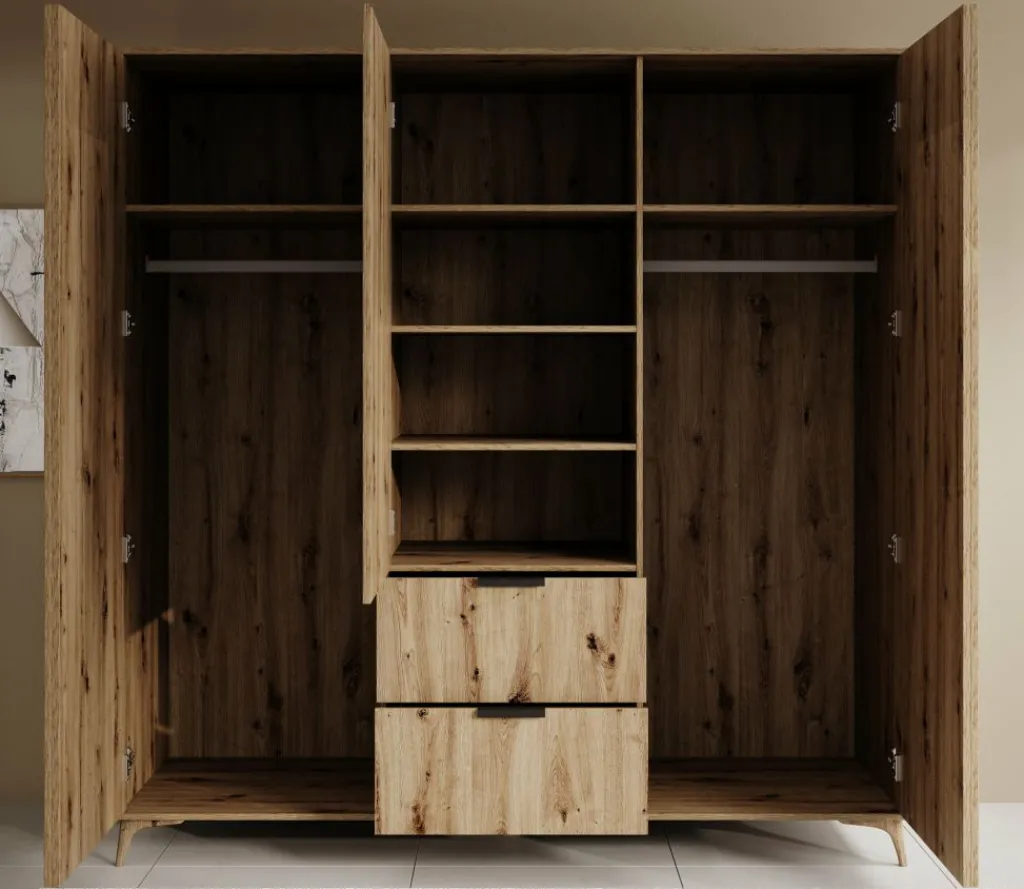 De binnenzijde van de kast bestaat uit 6 opbergvakken en 2 kledingroedes, waardoor je zowel hang- als legruimte tot je beschikking hebt. Een praktische indeling voor het overzichtelijk opbergen van kleding en accessoires.