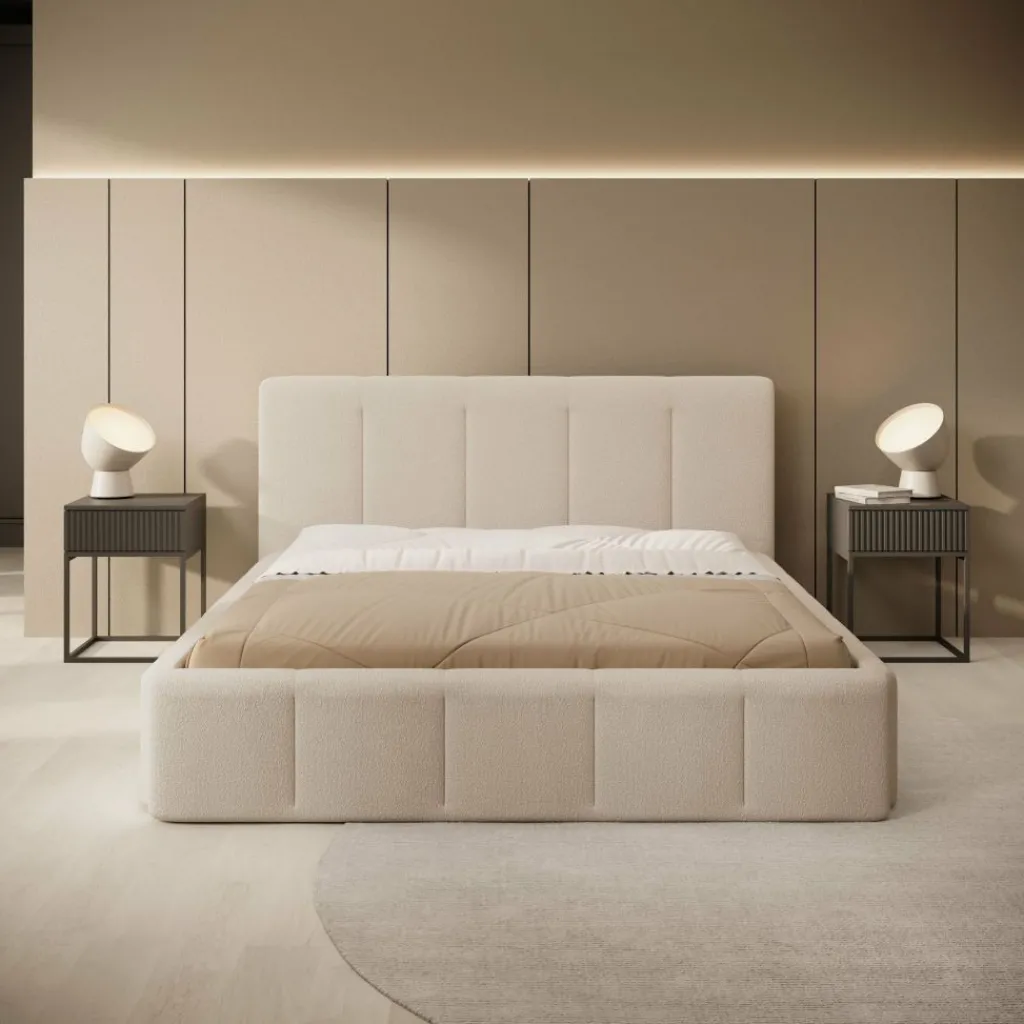 Bed Excalibur is een modern bed, bekleed met een zachte teddystof in de kleur beige.
