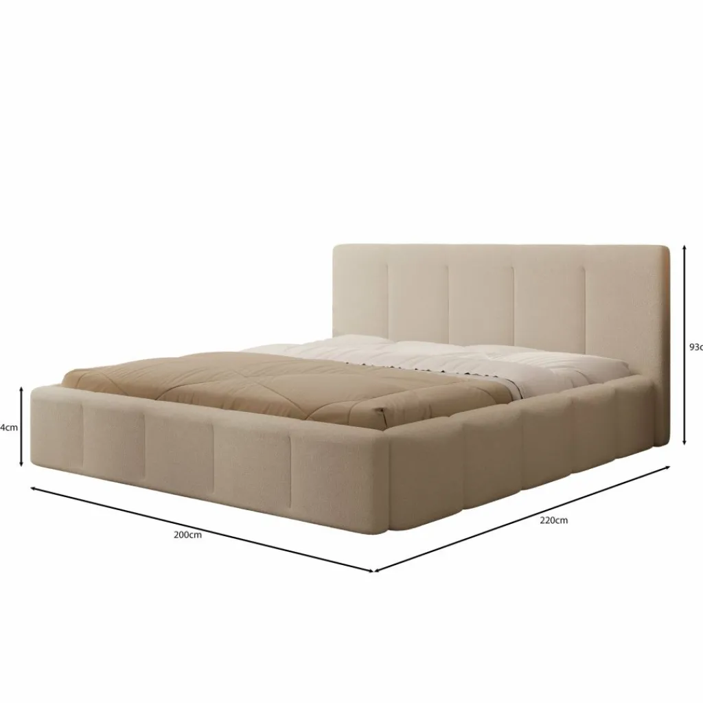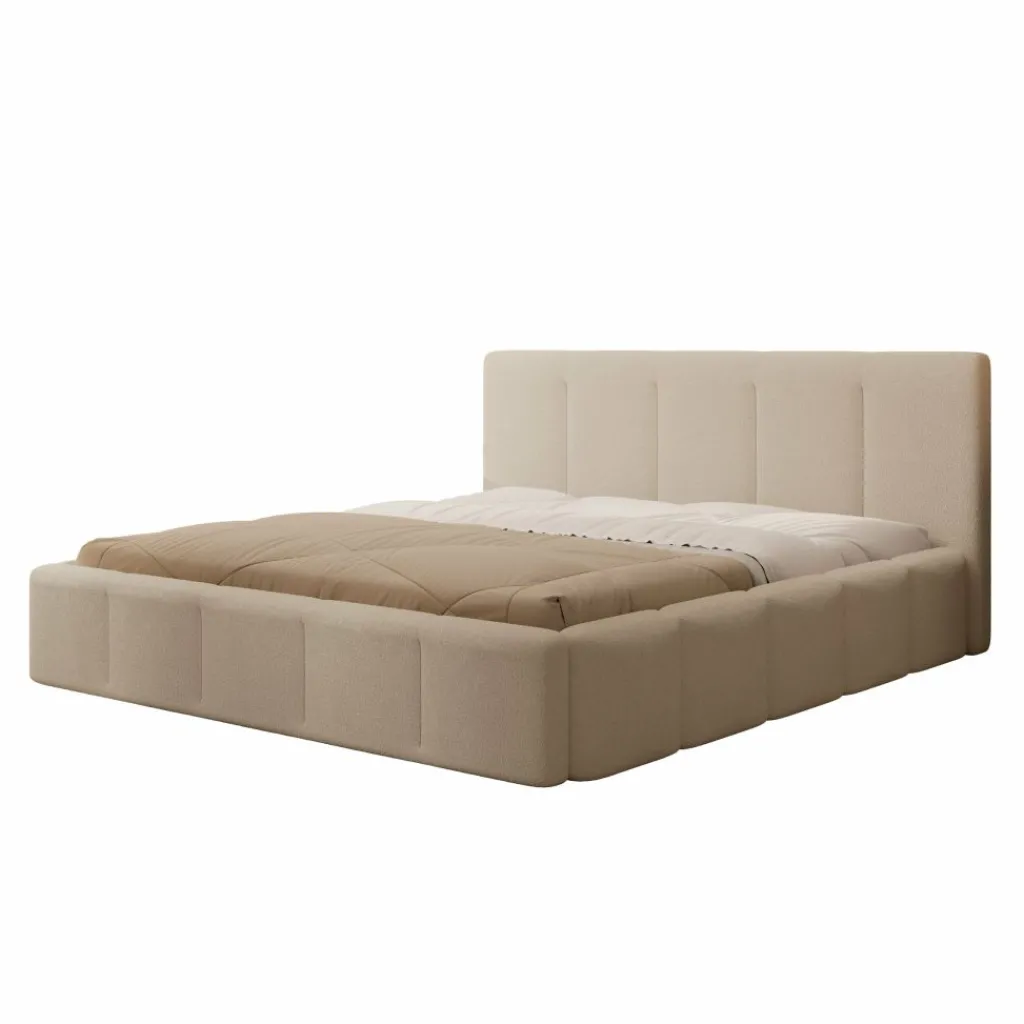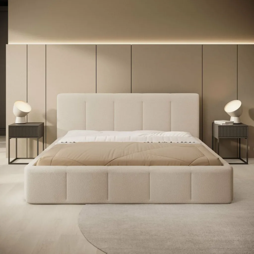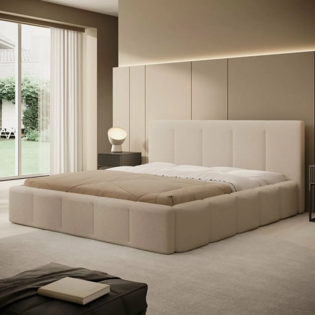 Bed Excalibur is een modern bed, bekleed met een zachte teddystof in de kleur beige.