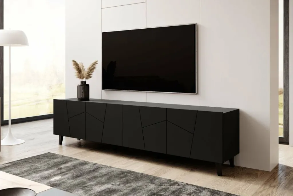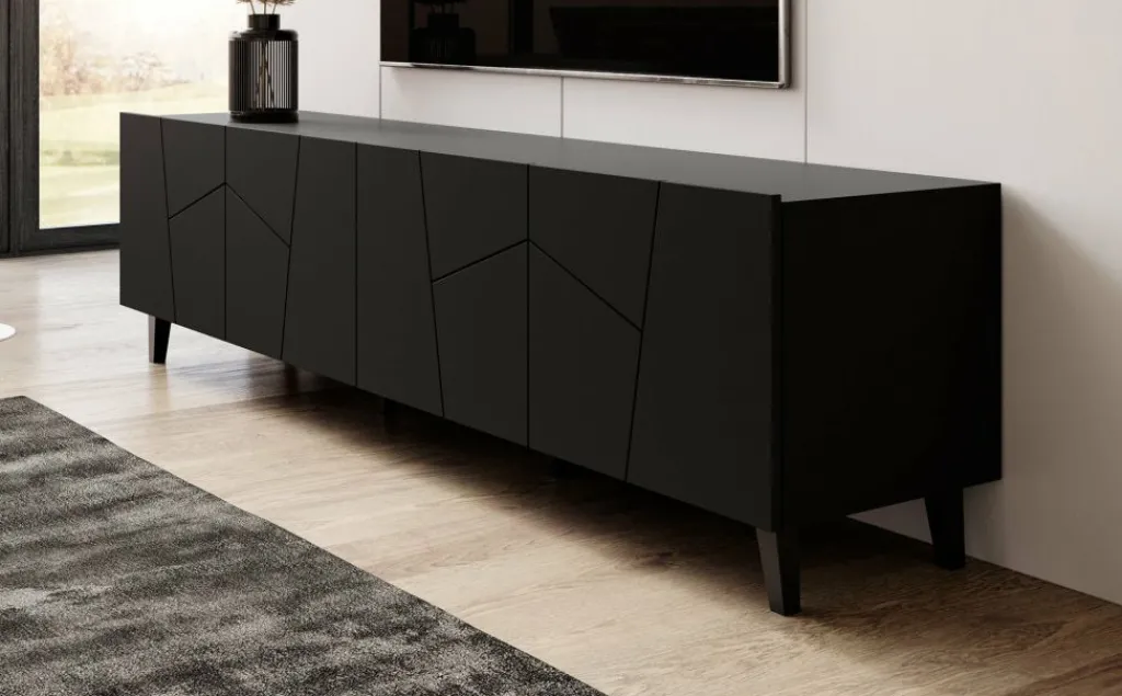 TV-Meubel Ezer is een opbergkast voor onder de tv in een moderne, hotel chique stijl. De tv kast beschikt over 4 deuren die via de bovenkant te openen zijn. Daarachter zitten maar liefst 8 opbergvakken. De voorkant heeft een strak lijnenpatroon wat de kast nog meer laat opvallen. Het meubel staat op zwart metalen pootjes.