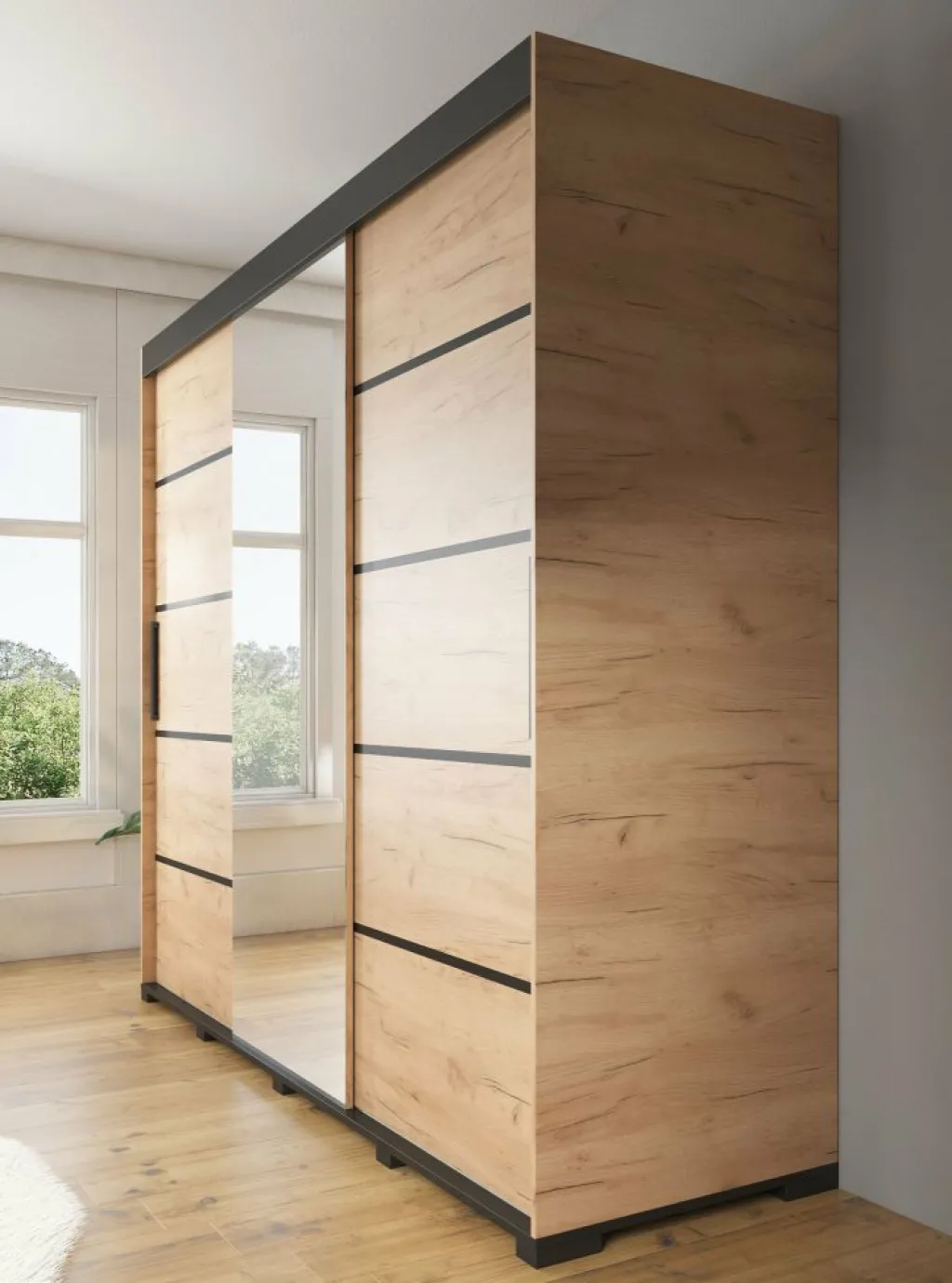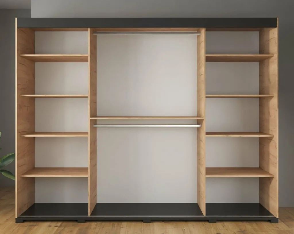 Kledingkast Fabio is een stijlvolle garderobekast uitgevoerd in eiken met zwarte details. De kledingkast heeft in totaal drie schuifdeuren met in het midden een spiegel. Kledingkast Fabio heeft veel opbergruimte. In het midden vind je twee stangen om kleding op te hangen. Daarnaast beschikt de kast over totaal 10 vakken om kleding op te bergen.