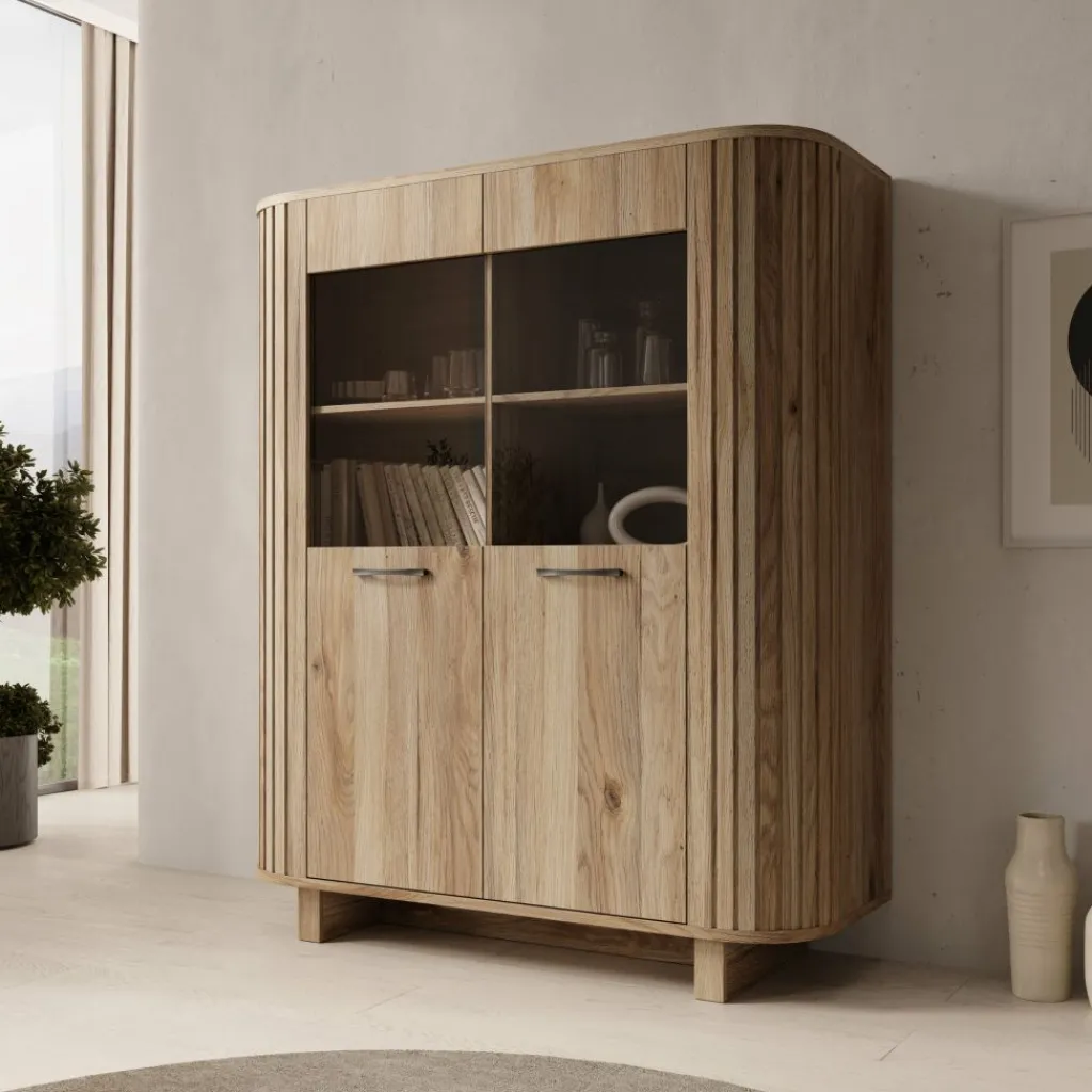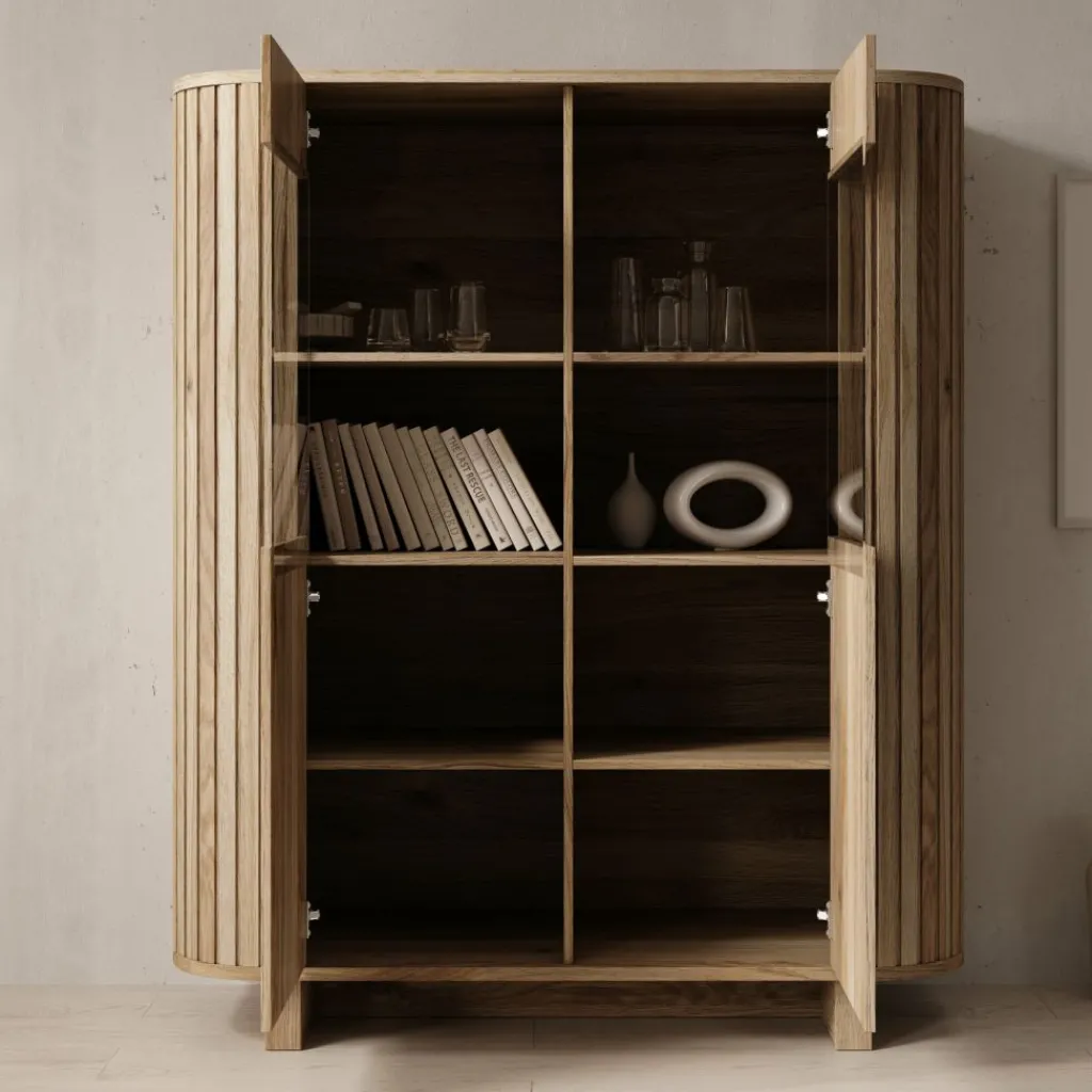 Het bovenste gedeelte bestaat uit twee open vakken naast elkaar, elk verdeeld door een legplank. Deze vakken zijn geschikt voor het plaatsen van glaswerk, servies, boeken of decoratieve items. Het onderste gedeelte is voorzien van twee gesloten deuren, links en rechts, met daarachter extra opbergruimte.