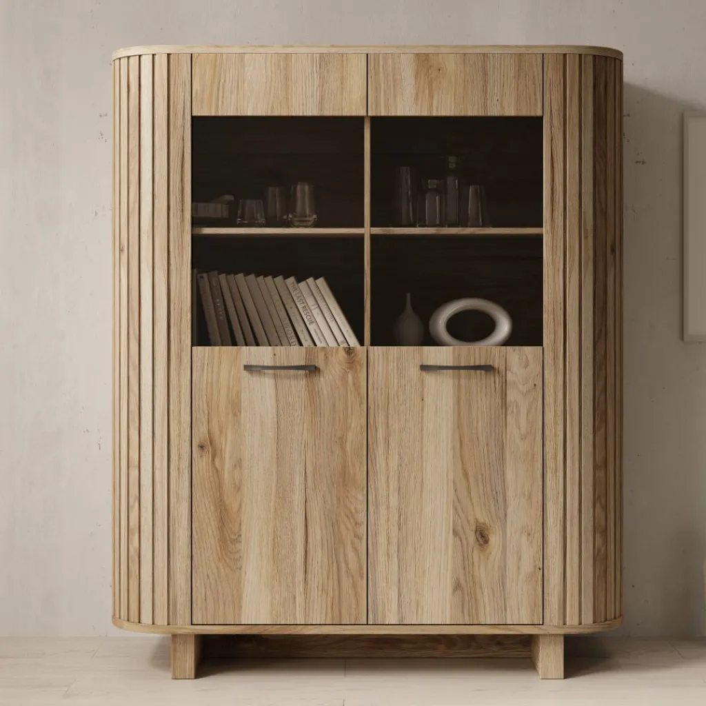 De deuren zijn uitgevoerd met rechte, donkere handgrepen. De kast staat op een lage plint en is volledig vrij van de vloer geplaatst. De afgeronde zijkanten en verticale belijning aan de zijkant zijn duidelijk zichtbaar en doorgevoerd in het ontwerp. De eikenafwerking loopt door over het gehele meubel, wat zorgt voor een consistent geheel.
