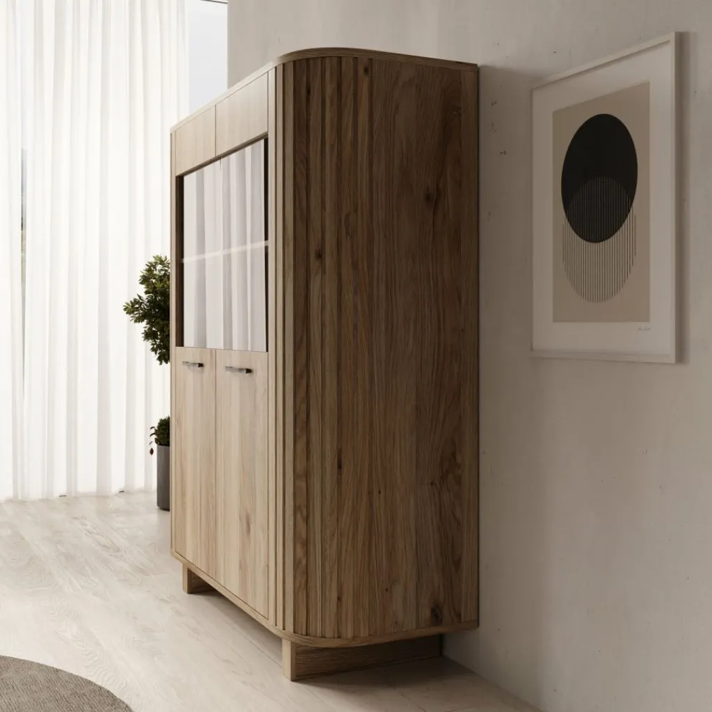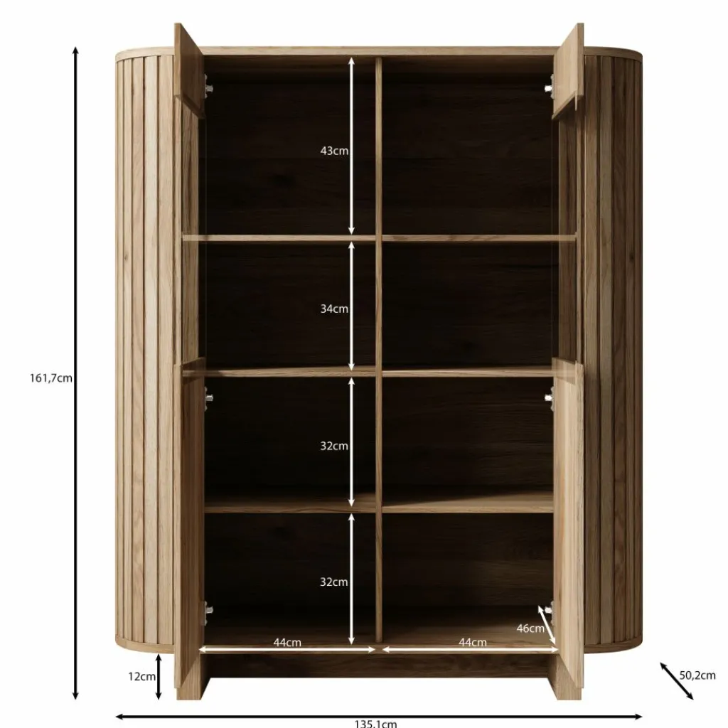 De Falero buffetkast in eikenpatroon is een staande kast met een symmetrische en overzichtelijke indeling. Met de afmetingen van 135x50x162 cm biedt dit meubel ruime opbergmogelijkheden, geschikt voor gebruik in de woonkamer of eetkamer.