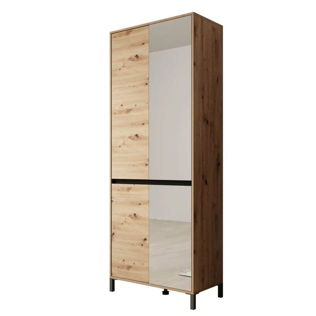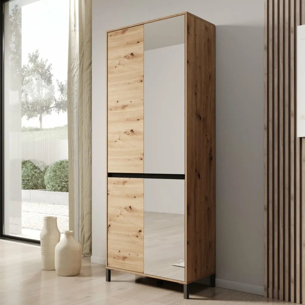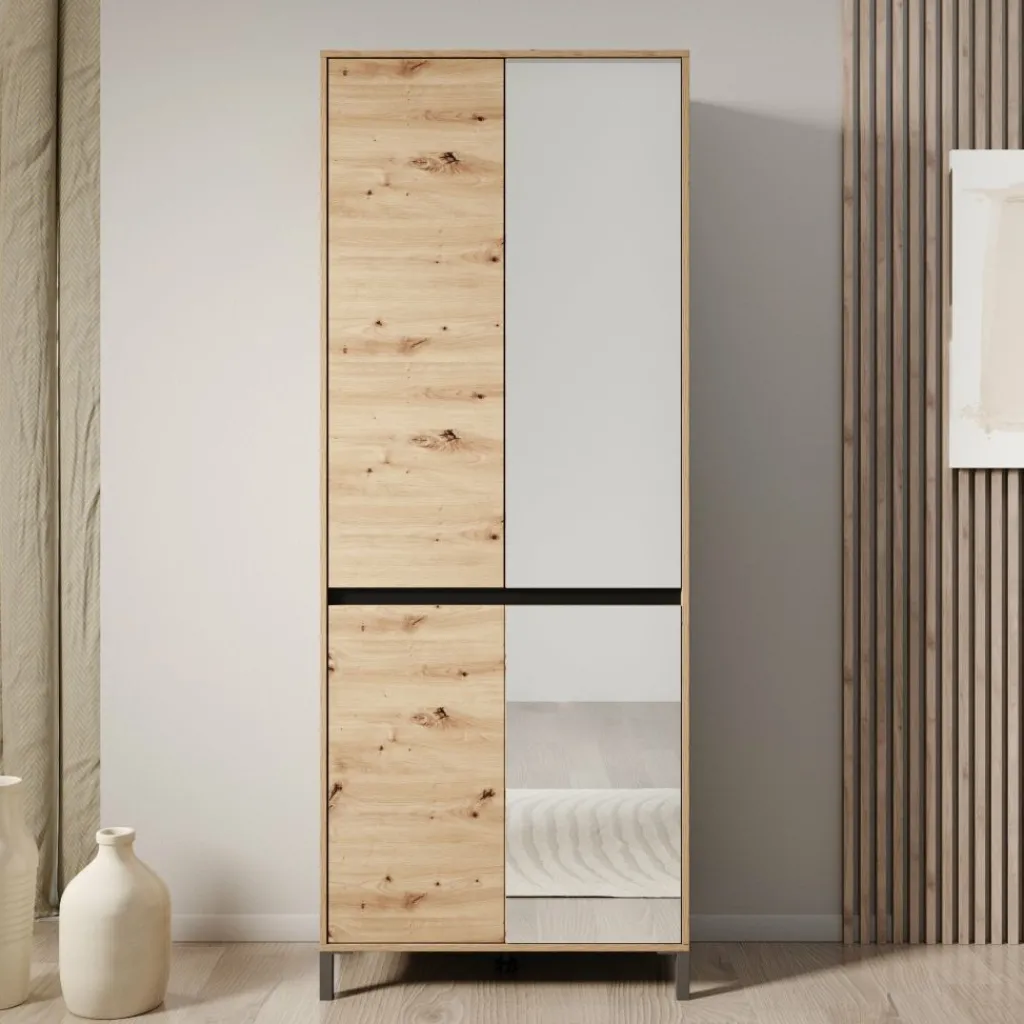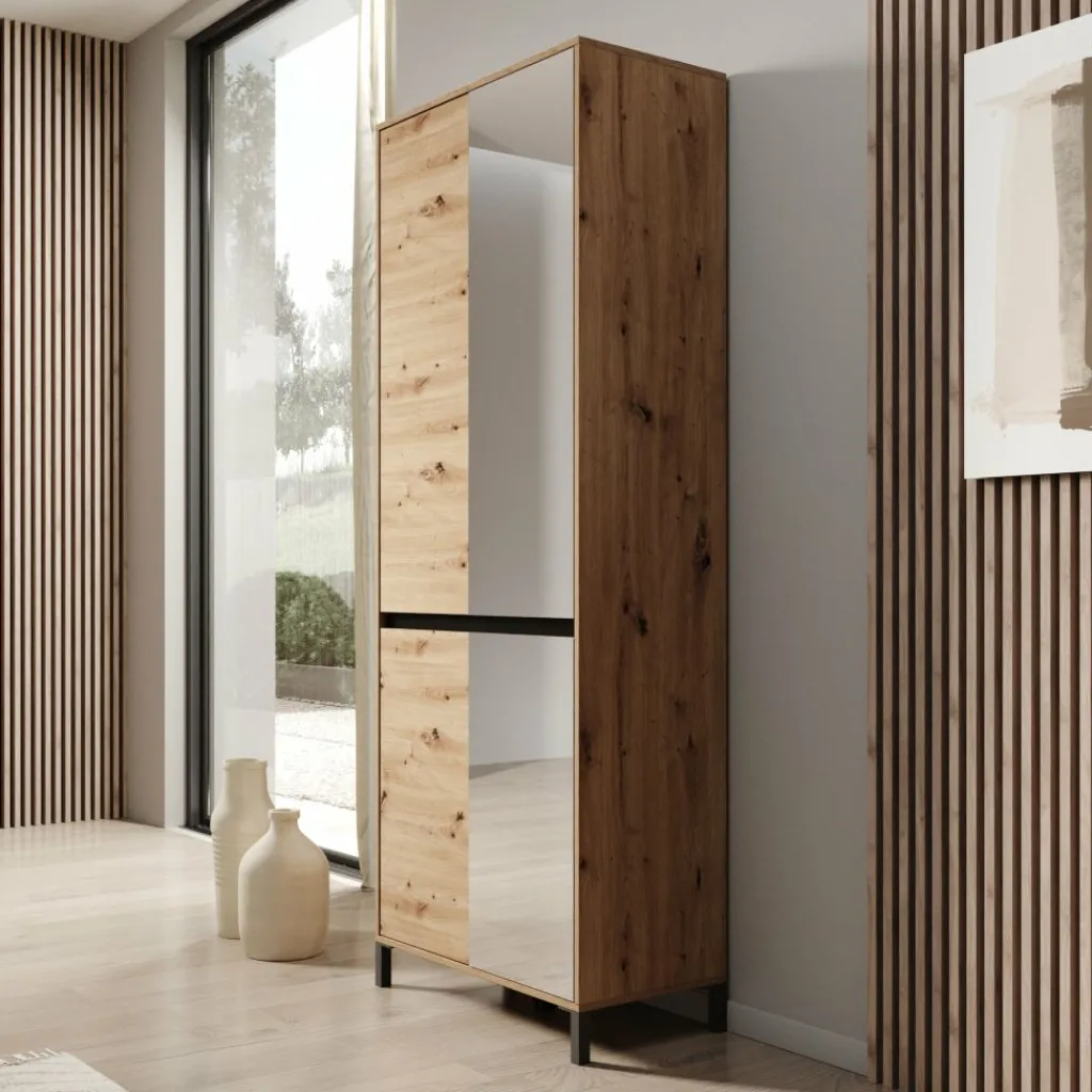 Met een hoogte van 206 cm biedt deze kast veel opbergruimte binnen een smalle footprint. De spiegeldeur is volledig in de lengte uitgevoerd en praktisch voor dagelijks gebruik, bijvoorbeeld bij het aankleden. Door de combinatie van houtlook, strakke lijnen en een functionele indeling is de Finta schoenenkast een efficiënte oplossing voor het opbergen van schoenen.
