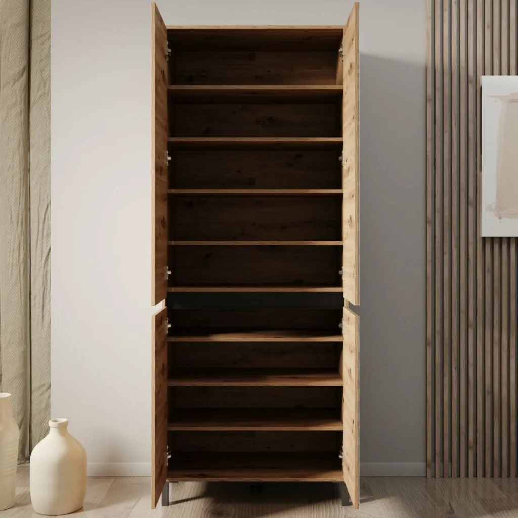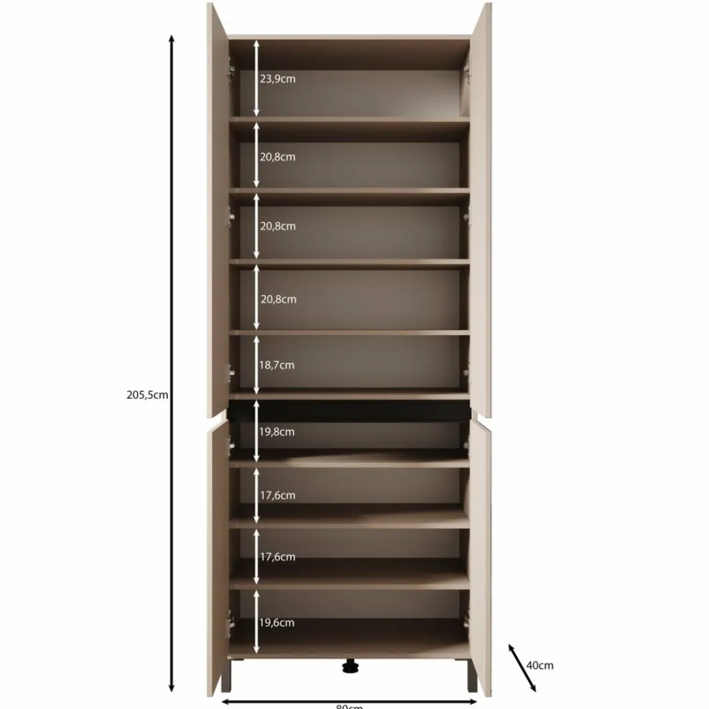 Achter de deuren bevinden zich meerdere brede legplanken met ruimte voor een grote hoeveelheid schoenen. De planken zijn overzichtelijk geplaatst, zodat je eenvoudig ziet waar alles staat. De smalle handgreep in zwart metaal houdt het ontwerp strak en modern, terwijl de zwarte poten van kunststof zorgen voor stabiliteit en een rustig totaalbeeld.