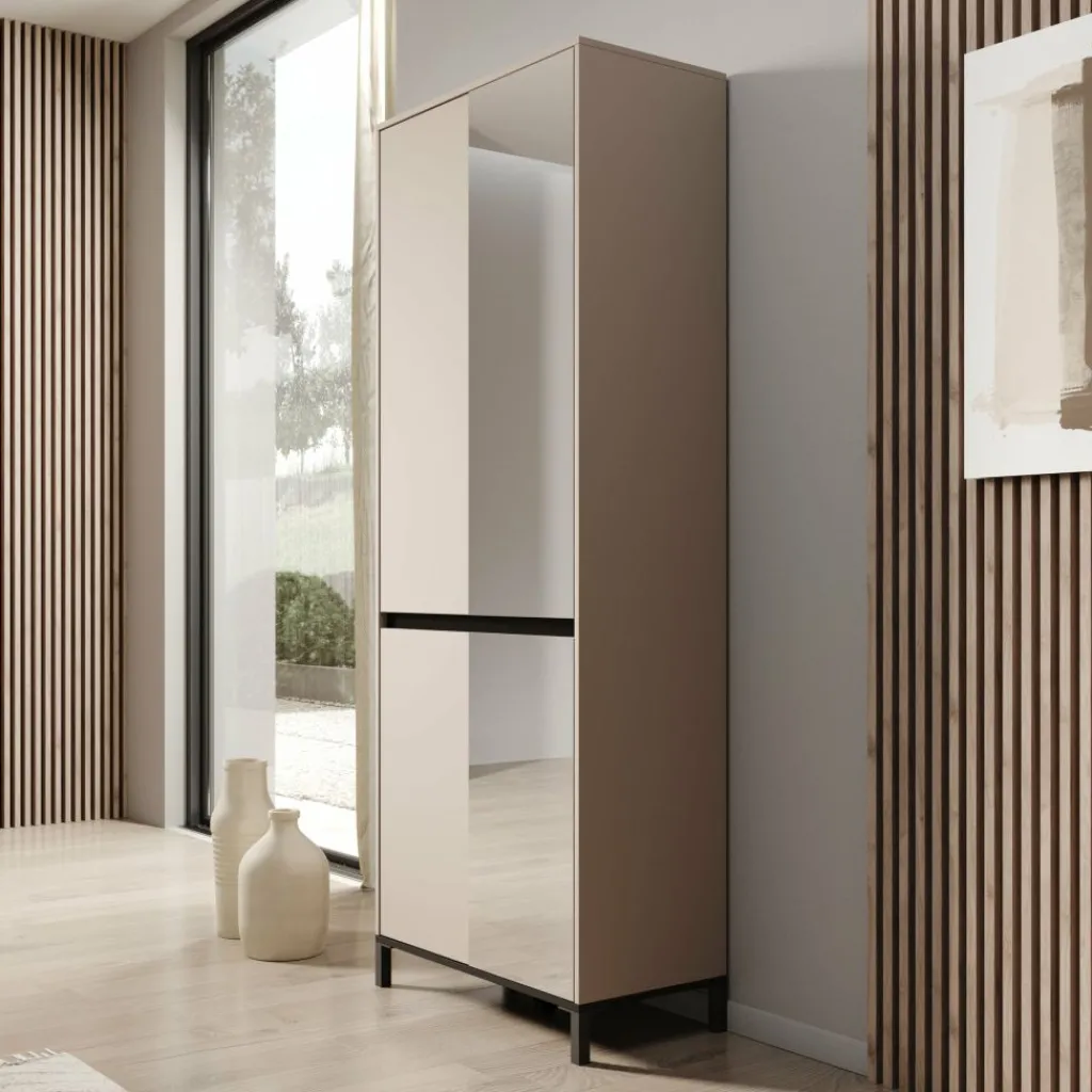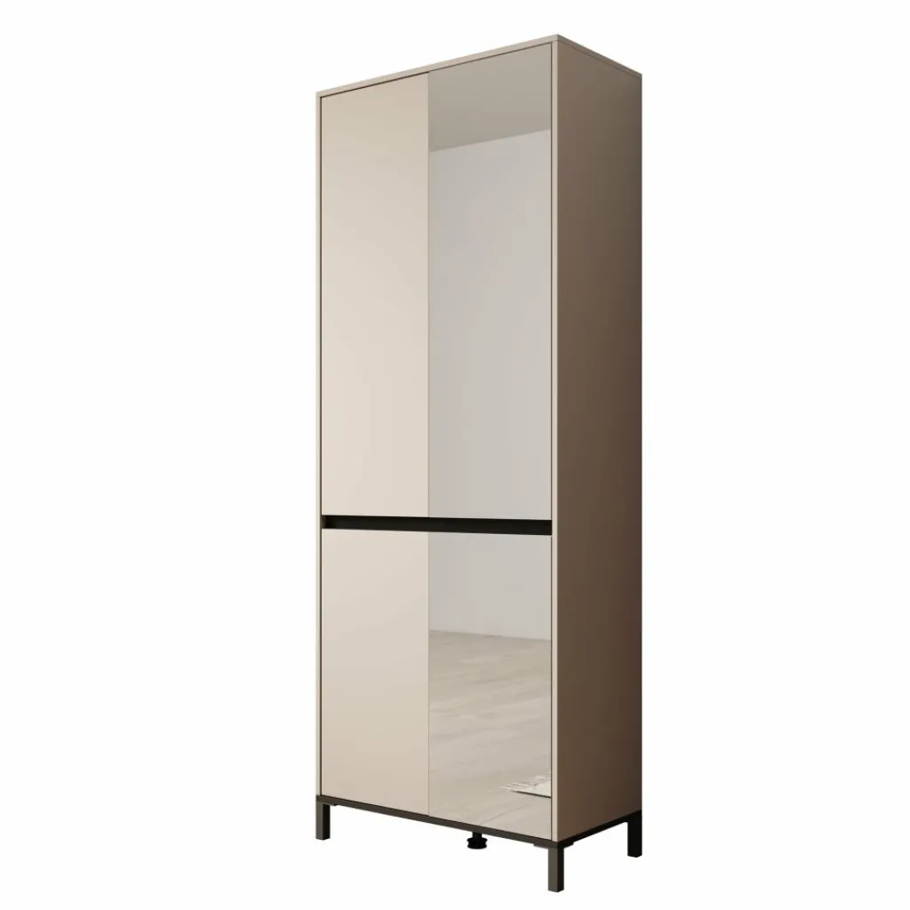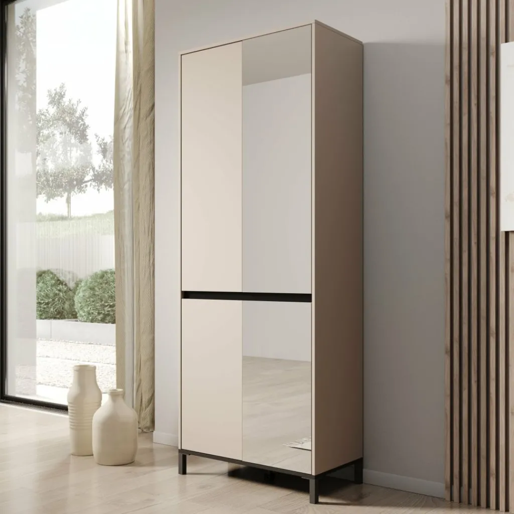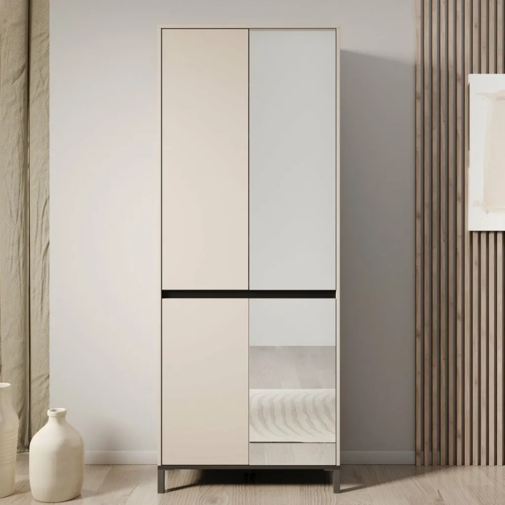 De Finta schoenenkast met spiegel in beige uitvoering vormt een rustige en strakke toevoeging aan de hal, slaapkamer of inloopkast. De matte beige afwerking zorgt voor een moderne en ingetogen uitstraling, terwijl de geïntegreerde spiegeldeur het meubel direct extra functioneel maakt. Met een hoogte van 206 cm benut je de beschikbare ruimte optimaal zonder veel vloeroppervlak in te nemen.