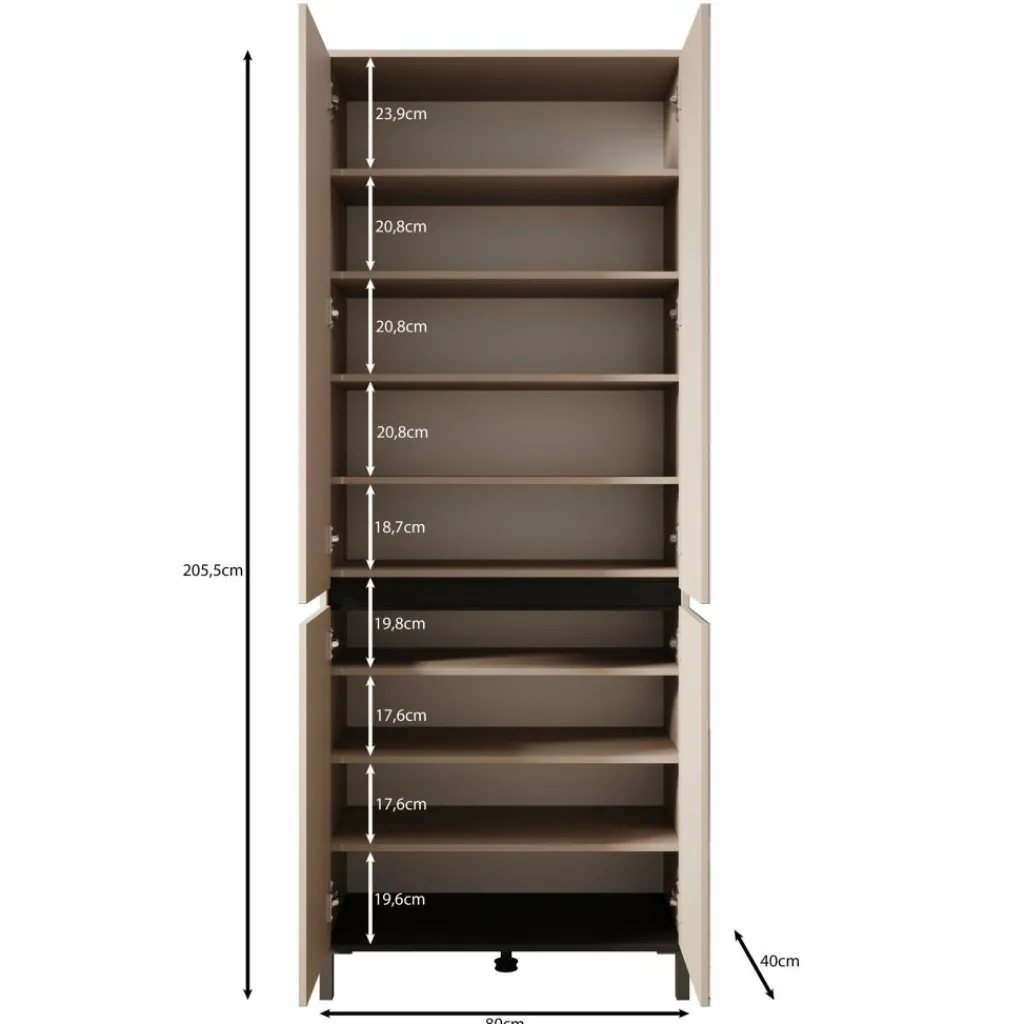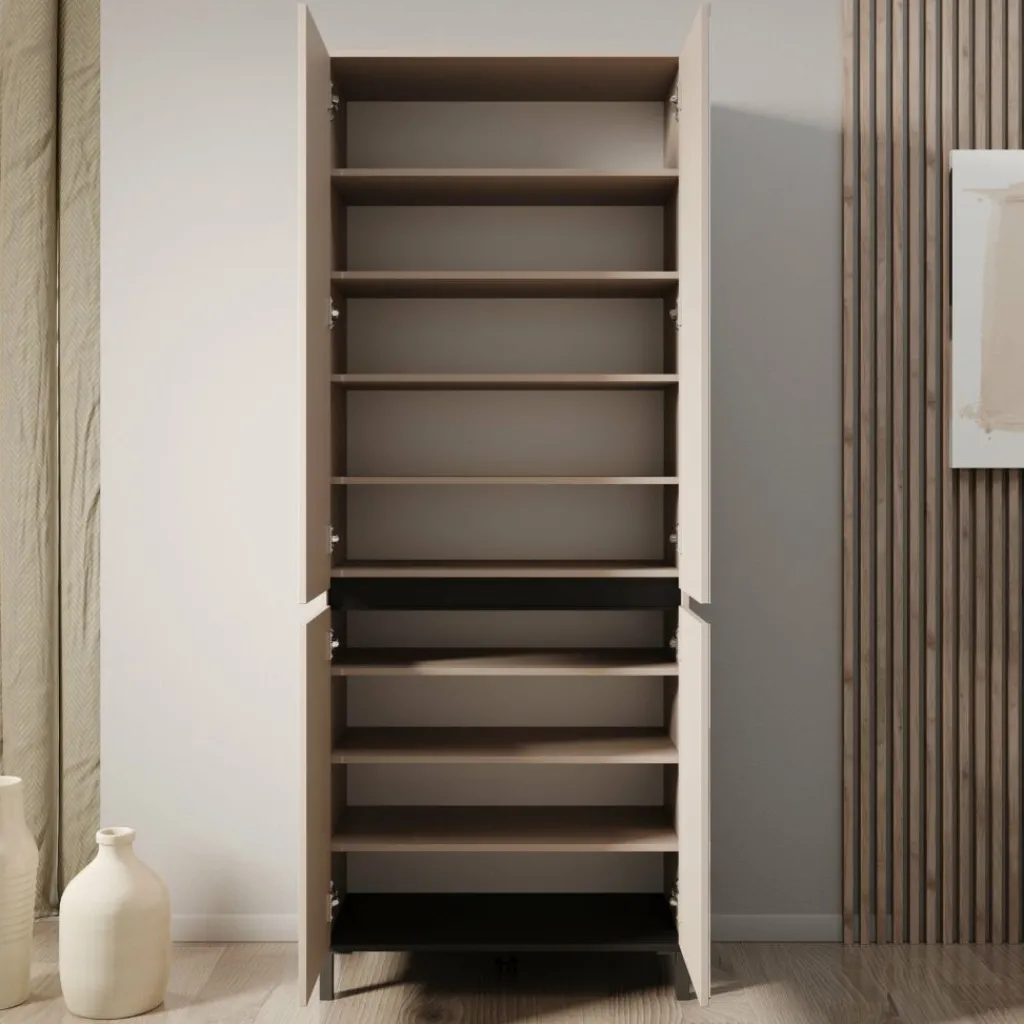 Achter de deuren bevinden zich meerdere overzichtelijke legplanken met ruimte voor een uitgebreide schoenencollectie. De indeling maakt het eenvoudig om alles netjes geordend te houden. De dunne zwarte handgreep geeft een subtiel accent, terwijl de zwarte poten van kunststof zorgen voor stabiliteit en een strak totaalbeeld.