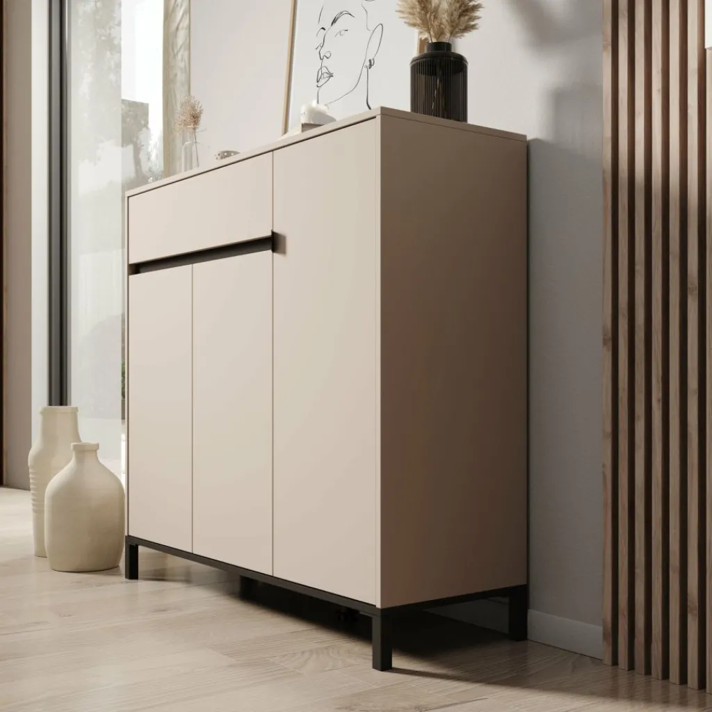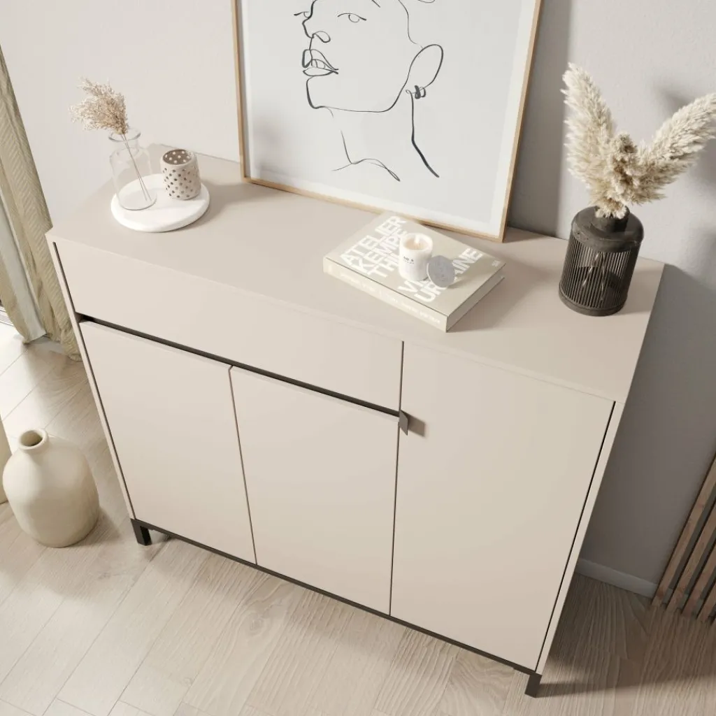 De Finta schoenenkast in beige heeft een strakke vormgeving met een brede lade bovenin en drie deuren daaronder. De kast is 119 cm breed en 110 cm hoog en biedt dankzij de indeling met meerdere schappen ruime opbergmogelijkheden voor schoenen en accessoires. De brede lade is geschikt voor kleinere items zoals sleutels, onderhoudsproducten of opvouwbare accessoires.