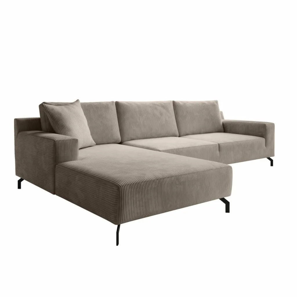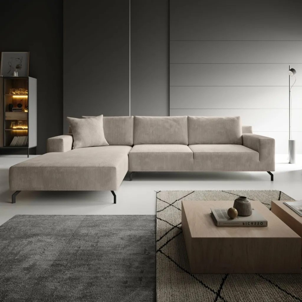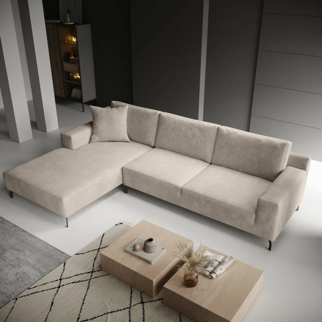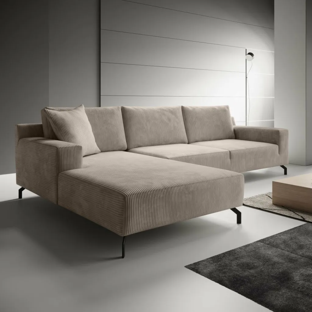 Hoekbank Florencio is een moderne, L-vormige bank met een rustige en tijdloze uitstraling. De combinatie van het strakke ontwerp en de zachte ribstof zorgt voor een comfortabele zitplek voor 2 tot 3 personen.