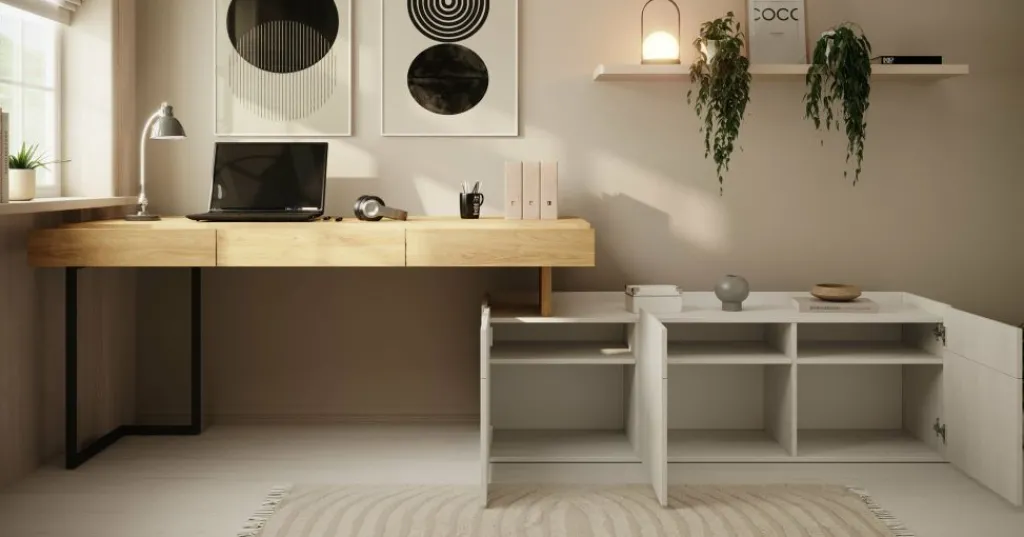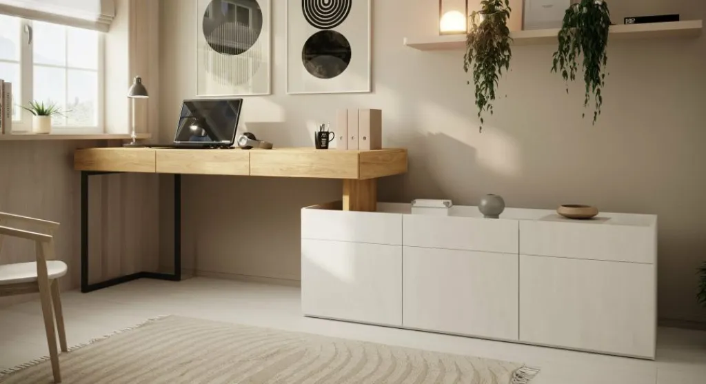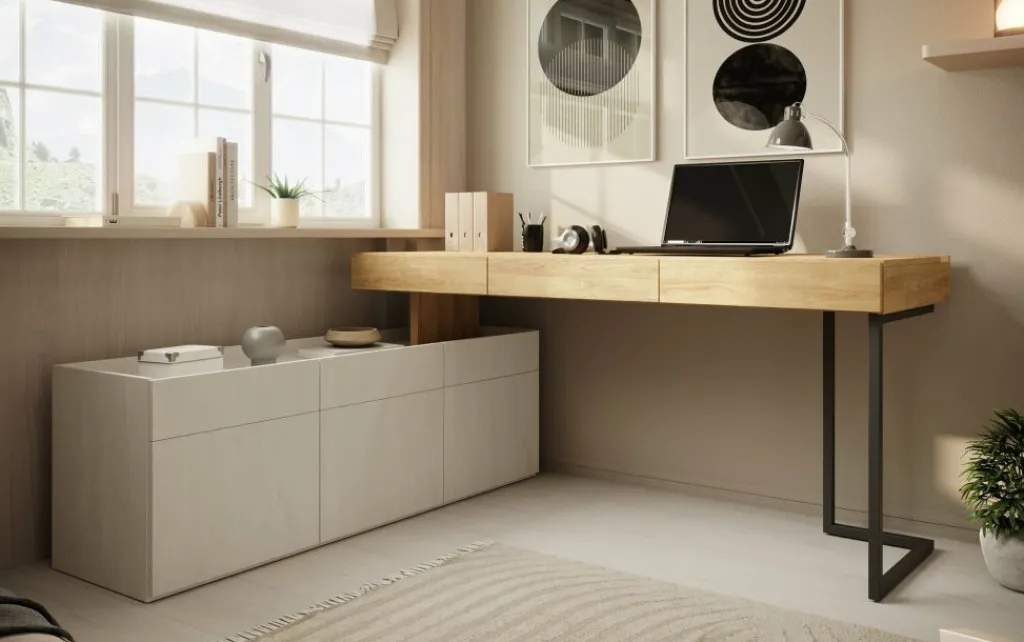 Tijdens het monteren heb je de keuze om er een L-vorm van te maken of een lang bureau. Ook kan je beslissen of je de poten aan de linker- of rechterkant monteert, ditzelfde geldt dus ook voor het dressoir.