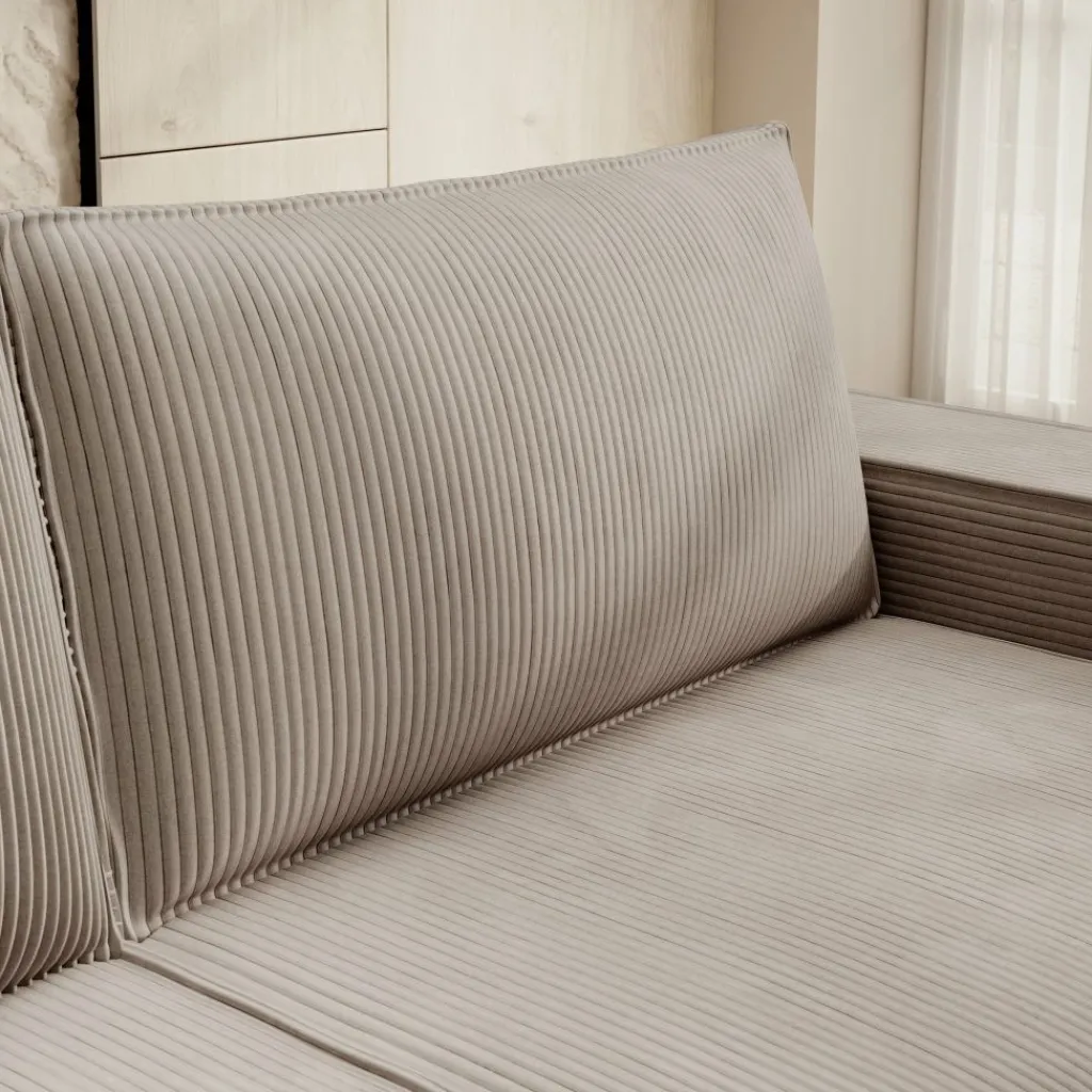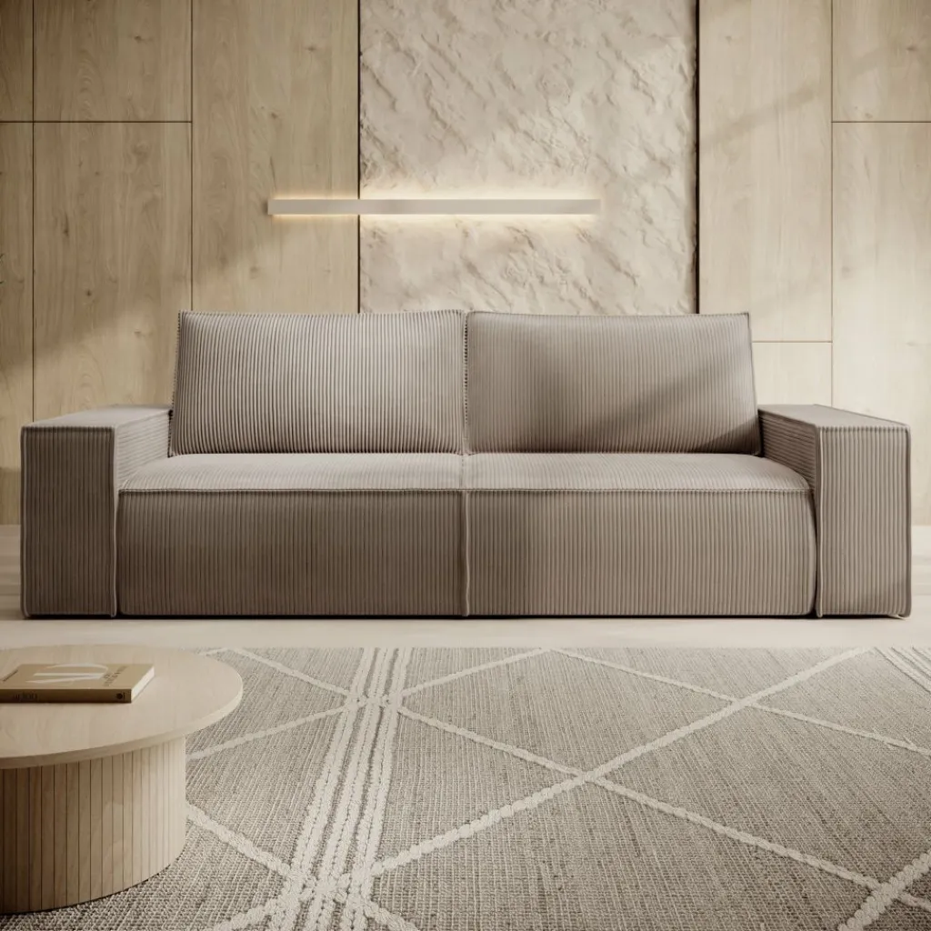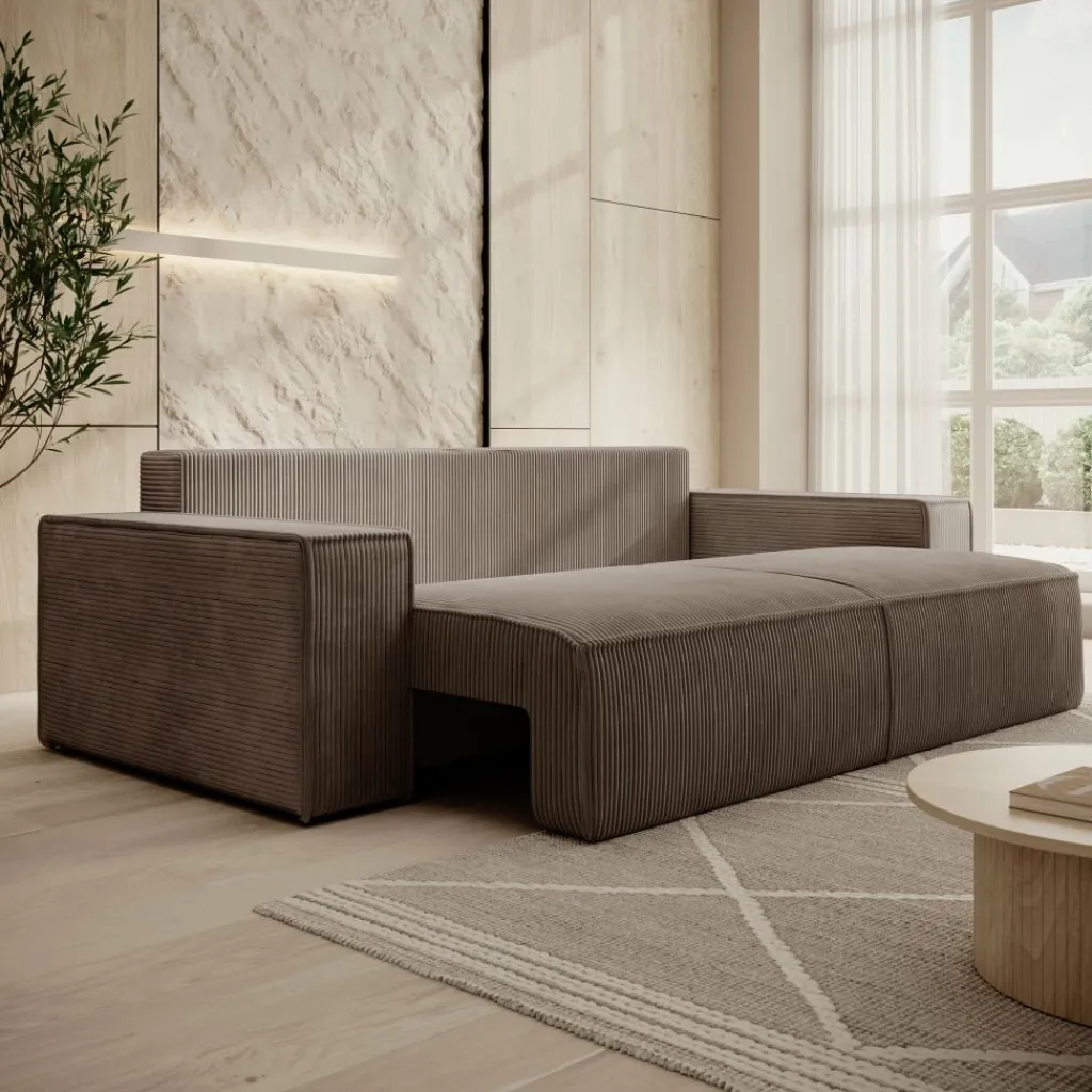 De Foster 3-zitsbank is een ruime slaapbank met een duidelijke vormgeving en een stevige uitstraling. Met een breedte van 257 cm biedt dit model voldoende zitruimte voor meerdere personen en is hij geschikt voor grotere woonkamers. De bruine ribstof geeft de bank een herkenbare structuur en sluit goed aan bij interieurs waarin textuur een rol speelt.
