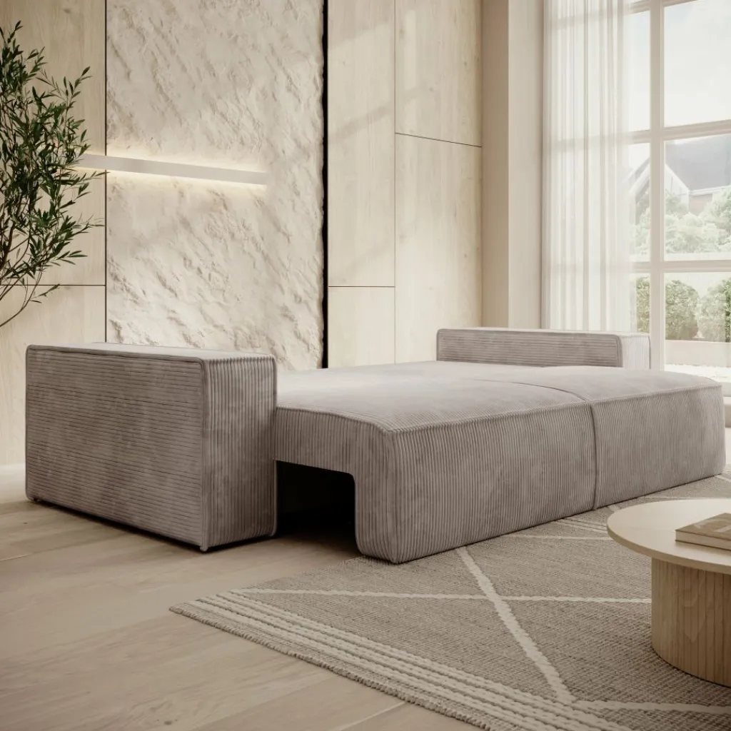 Dankzij de handige uitschuiffunctie is deze bank in een handomdraai te transformeren tot een comfortabele slaapbank. Uitgeklapt heeft het slaapgedeelte een afmeting van 200×136 cm – ruim genoeg voor twee personen. Ideaal als logeerbed of om zelf even languit te relaxen. Het liggedeelte sluit naadloos aan op het zitvlak, waardoor een vlak en stabiel oppervlak ontstaat.