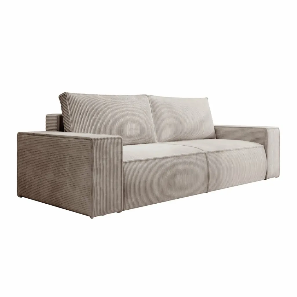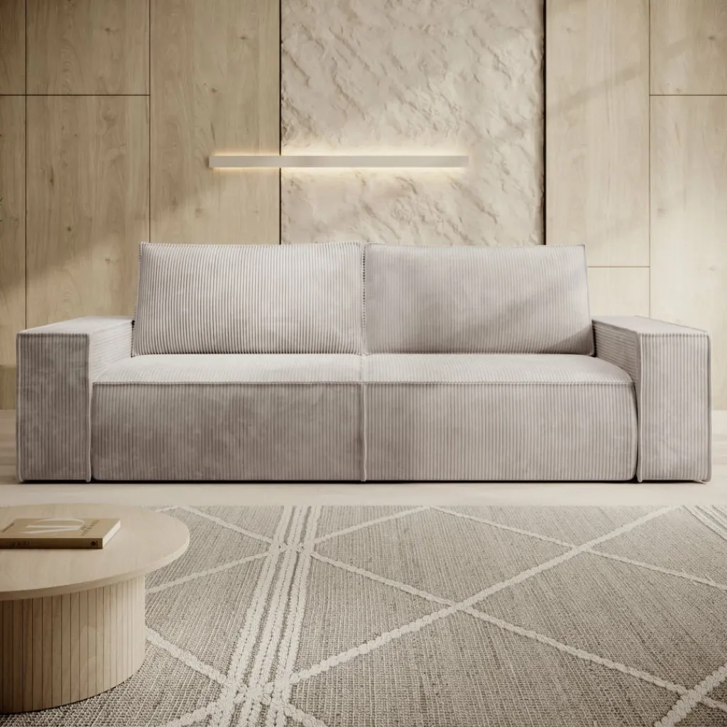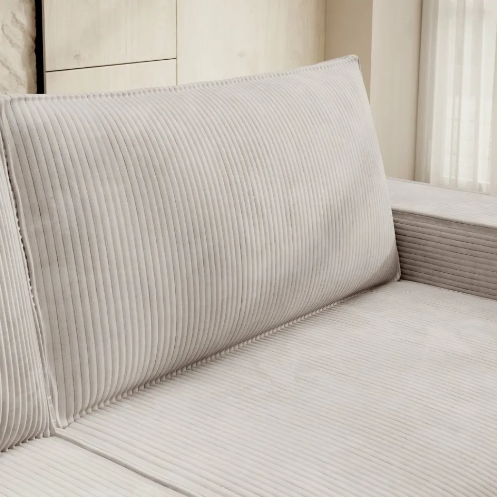 De zitting is stevig maar comfortabel, en wordt geleverd met twee grote rugkussens van dezelfde ribstof. Deze losse kussens bieden extra steun en flexibiliteit: je plaatst ze waar je ze nodig hebt of zet ze apart bij het slapen. De zithoogte van 43 cm en diepe zit van 64 cm zorgen voor een ontspannen zithouding.