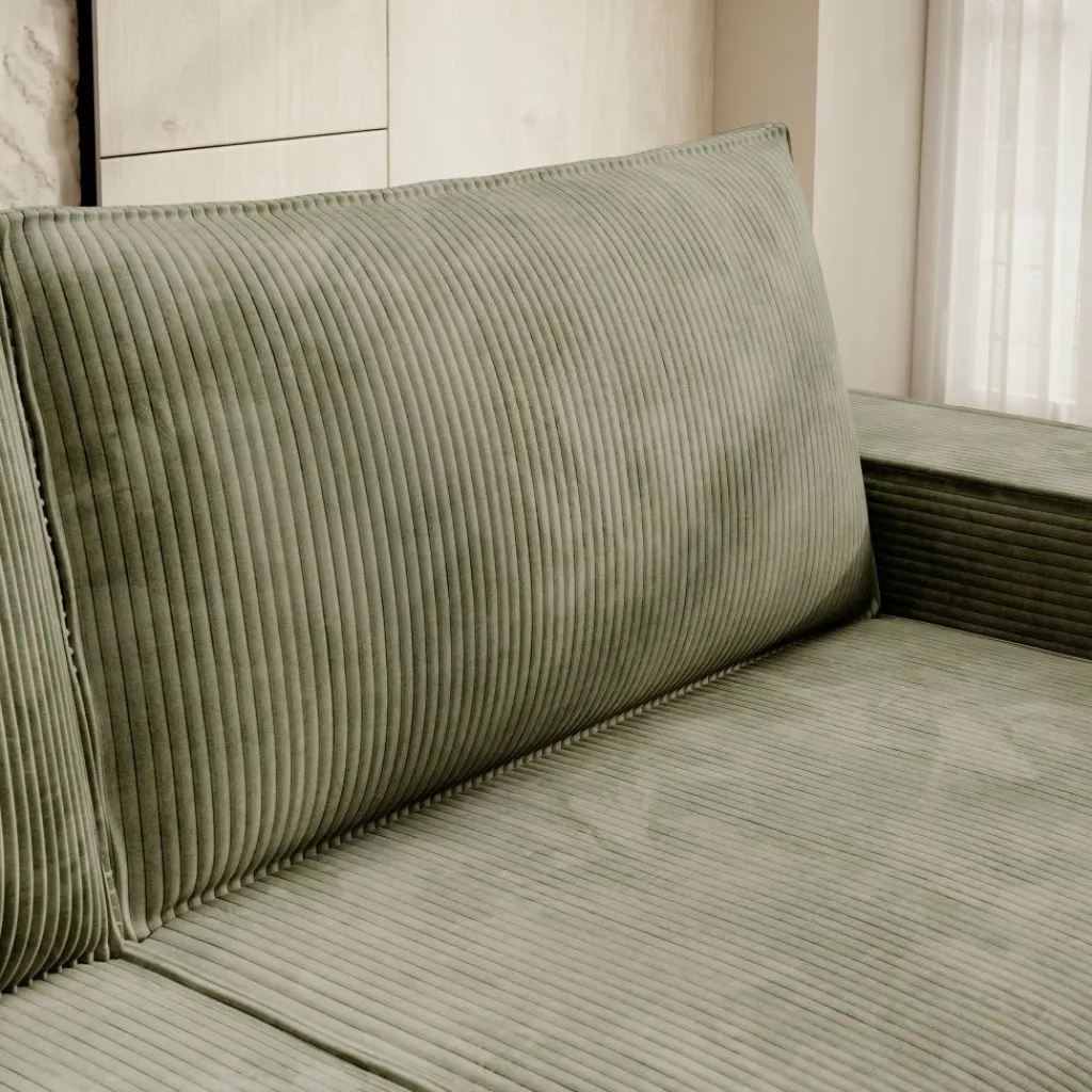 De Foster 3-zitsbank is een ruime bank met een duidelijke vormgeving en een stevige uitstraling. Met een breedte van 257 cm biedt dit model voldoende zitruimte voor meerdere personen en is hij geschikt voor grotere woonkamers. De groene ribstof geeft de bank een herkenbare structuur en een frisse, eigentijdse uitstraling die goed aansluit bij interieurs waarin textuur en kleur een rol spelen.