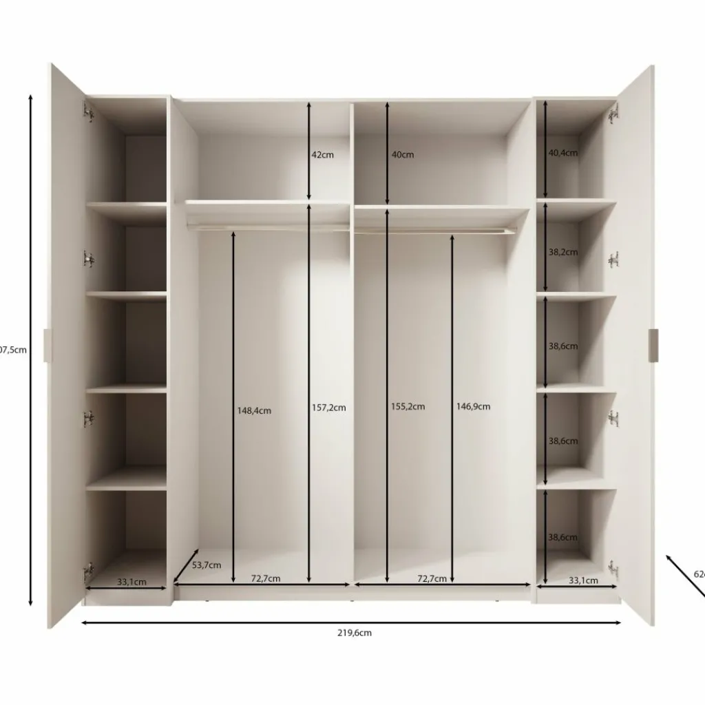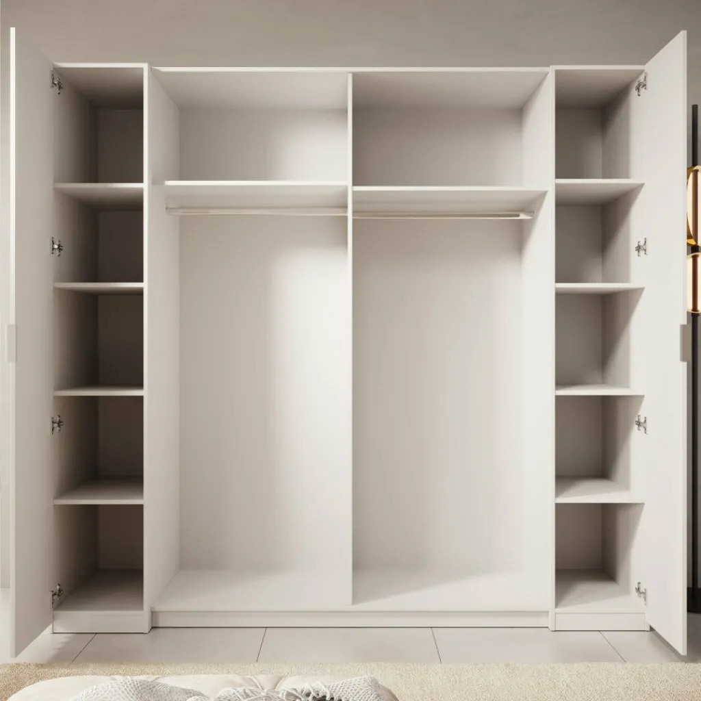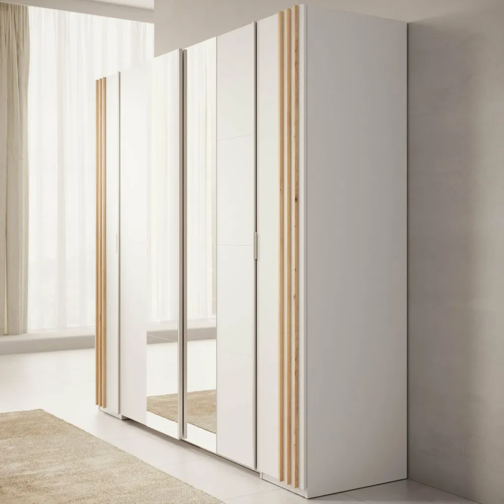 Kledingkast Franklin is een royale garderobekast. De kast is uitgevoerd in een frisse, witte kleur en afgewerkt met stijlvolle verticale houtaccenten aan de zijkanten. De combinatie van schuifdeuren en scharnierdeuren geeft dit model een moderne en luxe uitstraling. De twee middelste deuren zijn voorzien van spiegels, wat zorgt voor een ruimtelijk effect én extra gemak bij het aankleden.