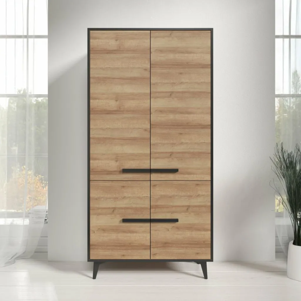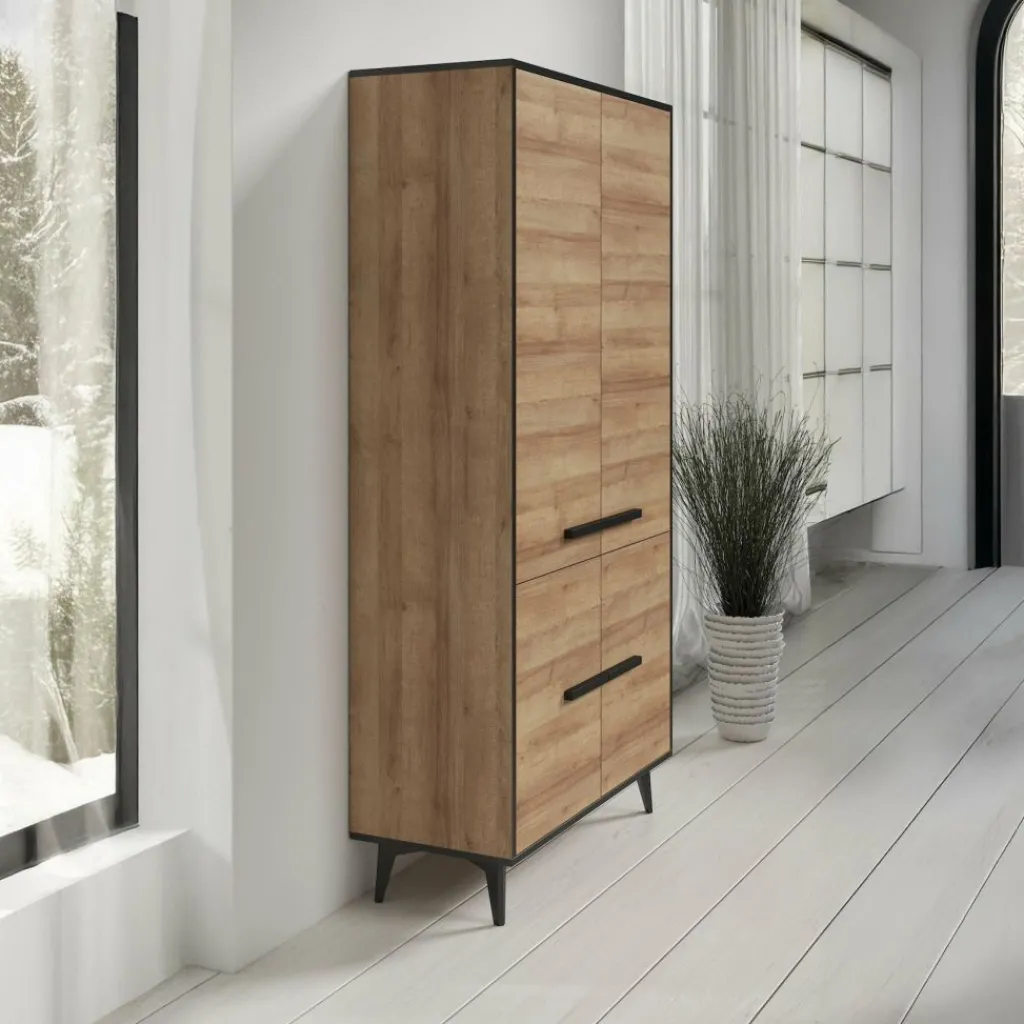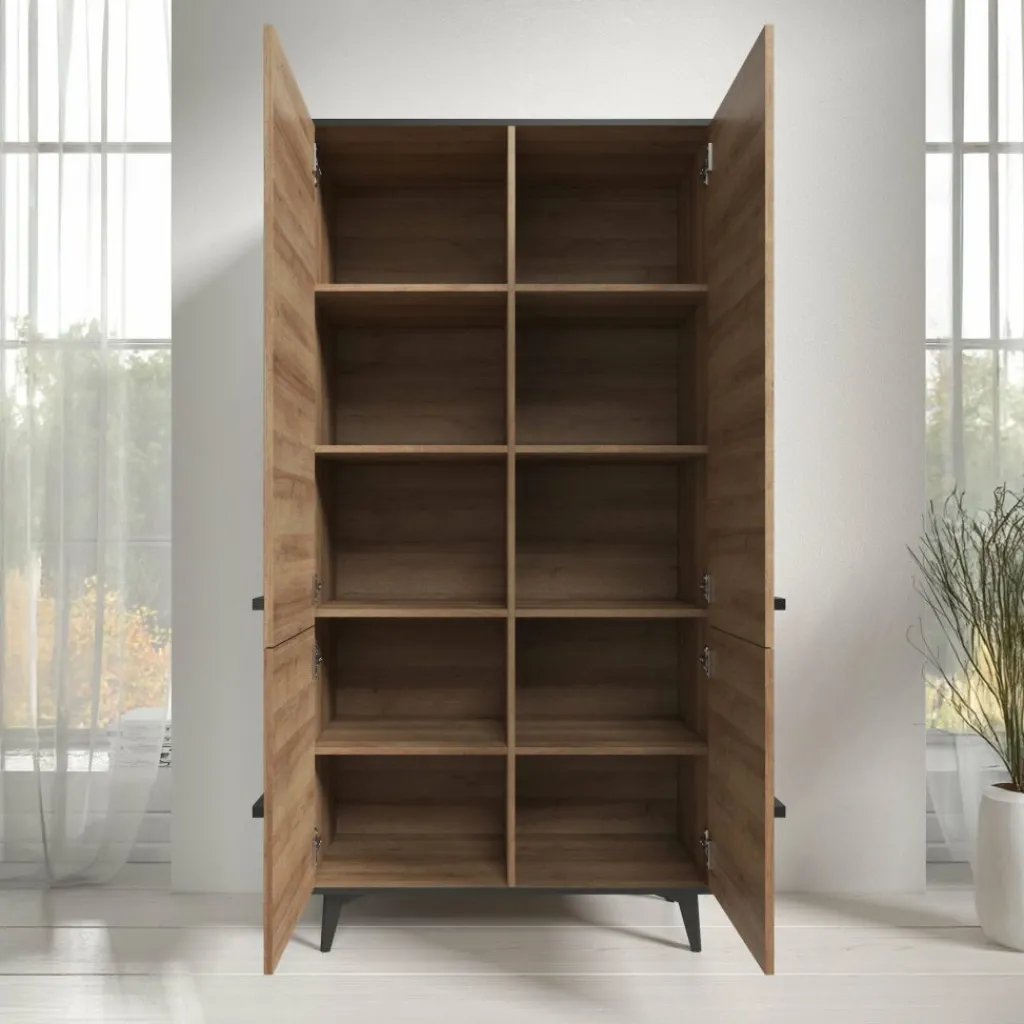 Kast Frey is een staande kast met ruime opbergmogelijkheden. De Frey is uitgevoerd in een licht eiken kleur met zwarte details. De kast beschikt over 4 grote deuren met daarachter maar liefst 10 open schappen.