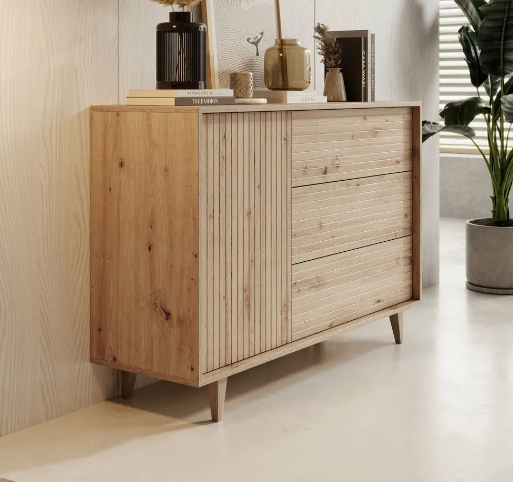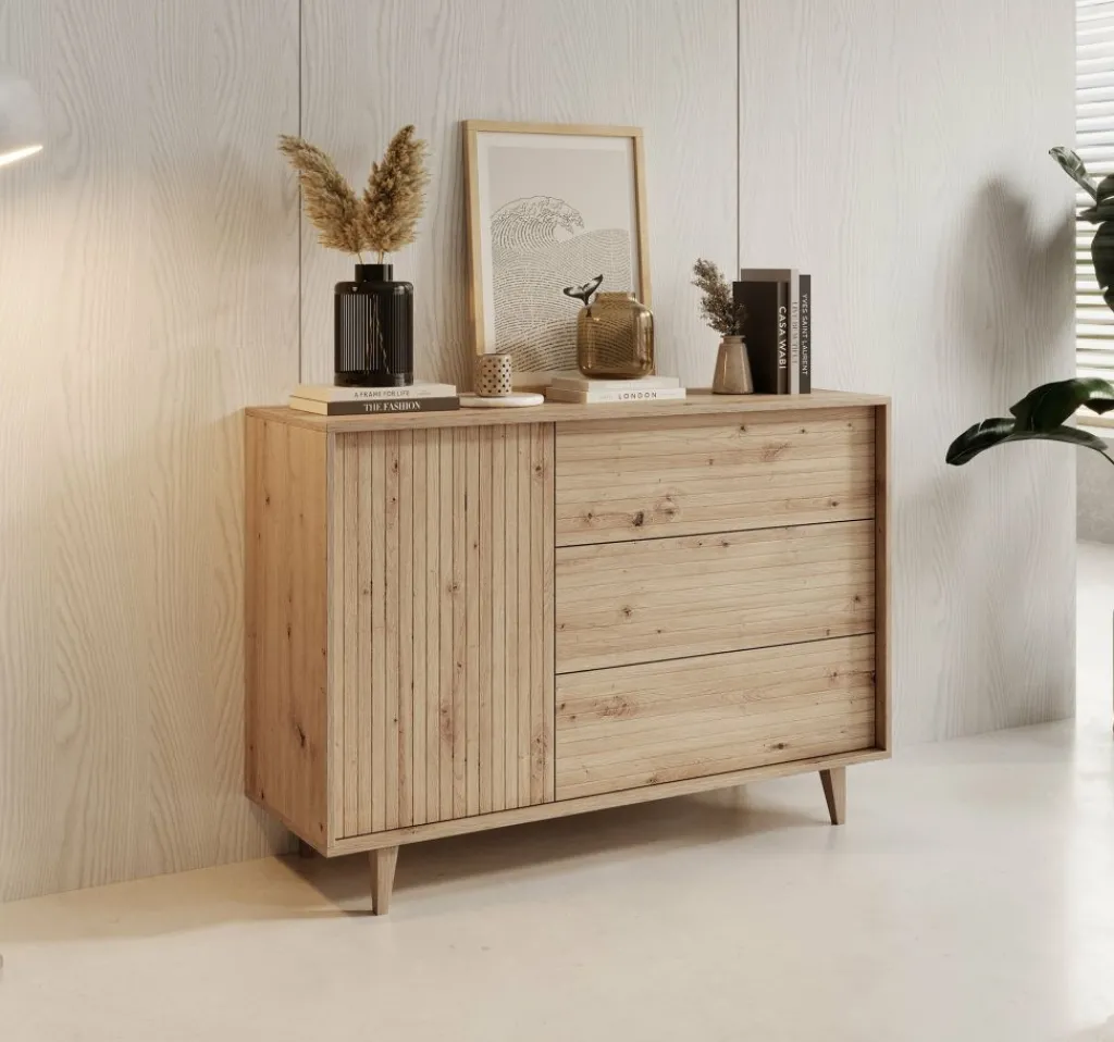 De kast heeft 3 lades en 1 deur. Deze zijn greeploos en beschikken over het push to open systeem. Achter de deur bevinden zich 2 opbergvakken.