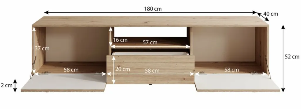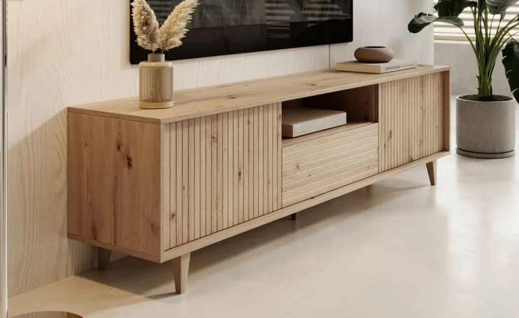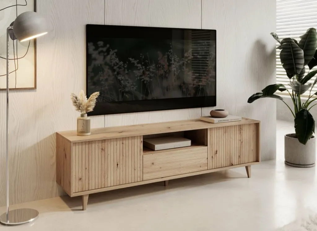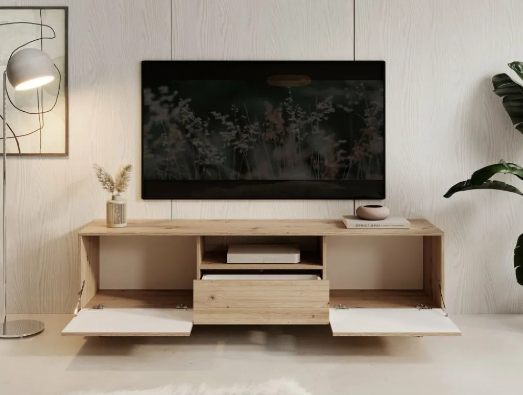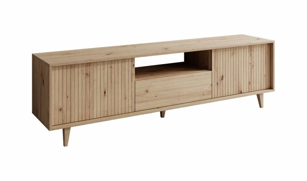 TV-Meubel Fuzeta is een modern tv-meubel in moderne, landelijke stijl. Het meubel is gemaakt van een stevige spaanplaat constructie in eiken kleur.