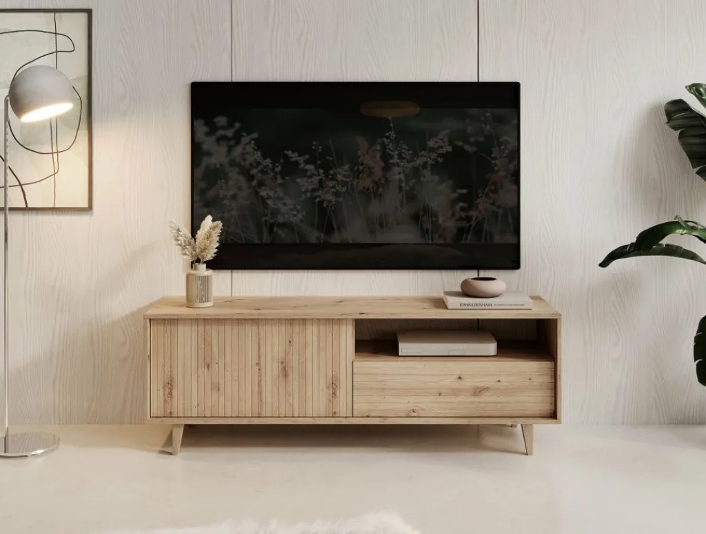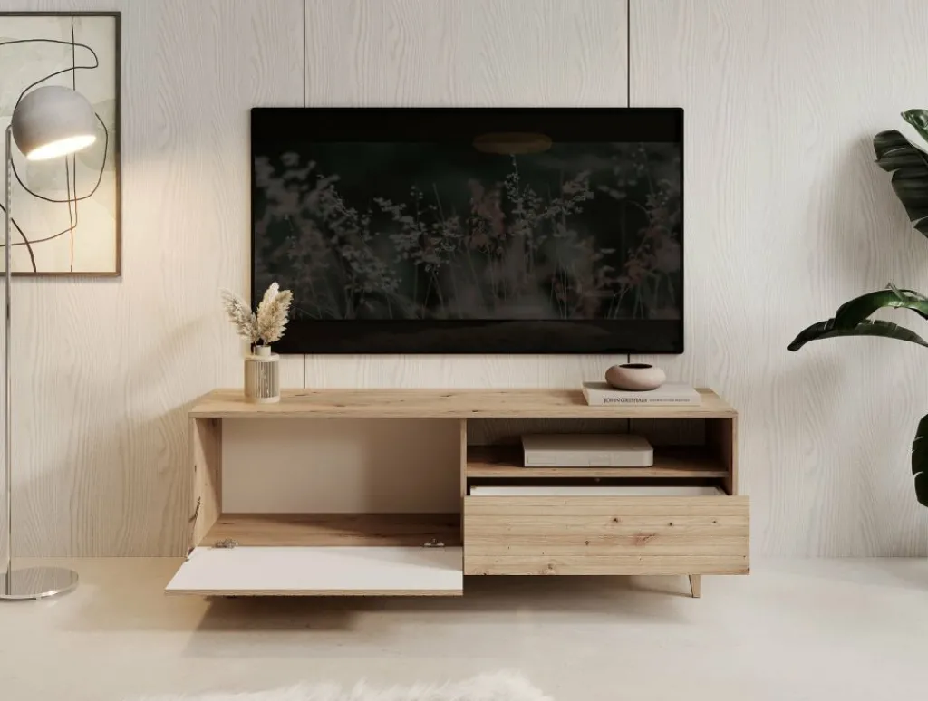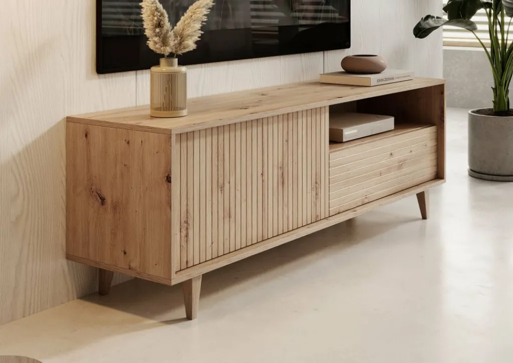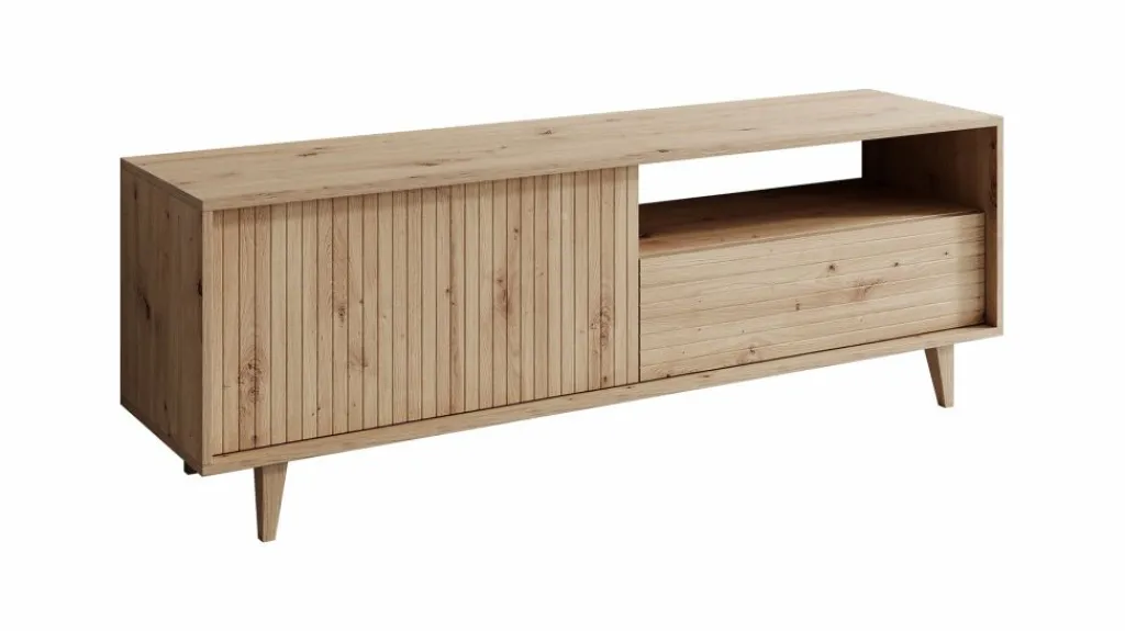TV-Meubel Fuzeta is een modern tv-meubel in moderne, landelijke stijl. Het meubel is gemaakt van een stevige spaanplaat constructie in eiken kleur.