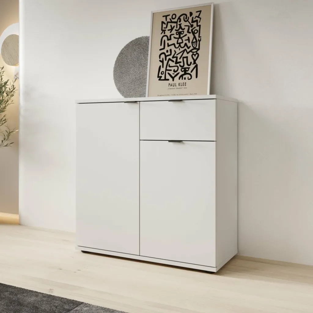 Het Galeno 2 dressoir in wit is een compact en functioneel meubel dat geschikt is voor verschillende ruimtes in huis, zoals de woonkamer, hal of eetkamer. Met een breedte van 80 cm, een diepte van 34 cm en een hoogte van 82 cm neemt het dressoir weinig ruimte in en biedt het tegelijk praktische opbergruimte.