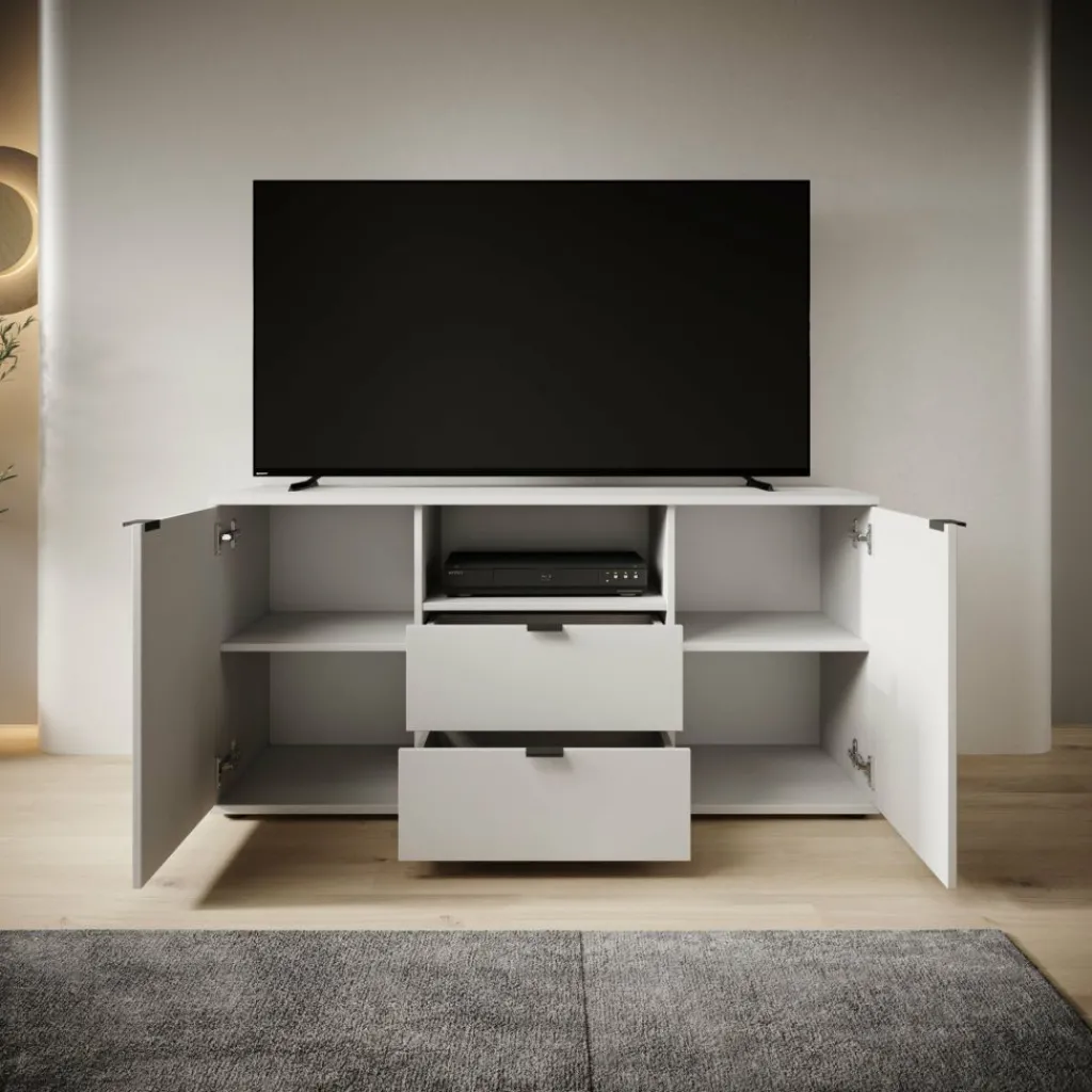 Achter de twee deuren bevinden zich legplanken voor het opbergen van spullen. In het midden is ruimte voor apparatuur, gecombineerd met twee lades voor kleinere items. Alles blijft zo netjes georganiseerd. Het bovenblad heeft een maximaal draagvermogen van 40 kg en is geschikt voor gangbare televisies.